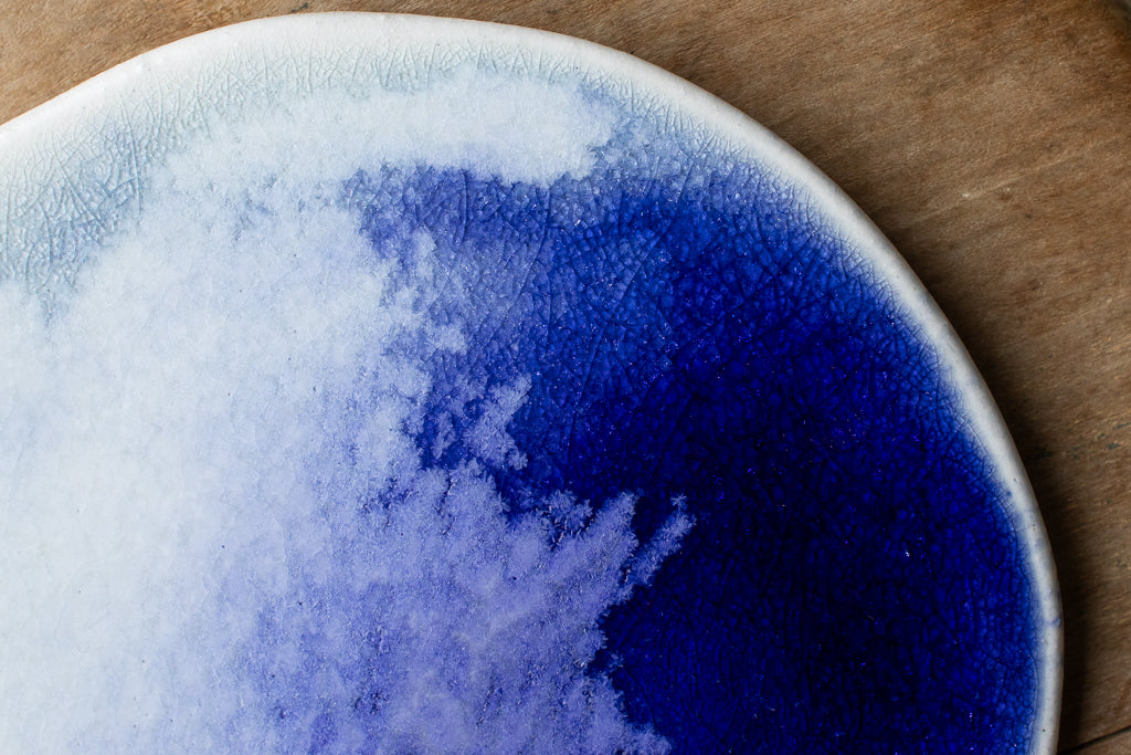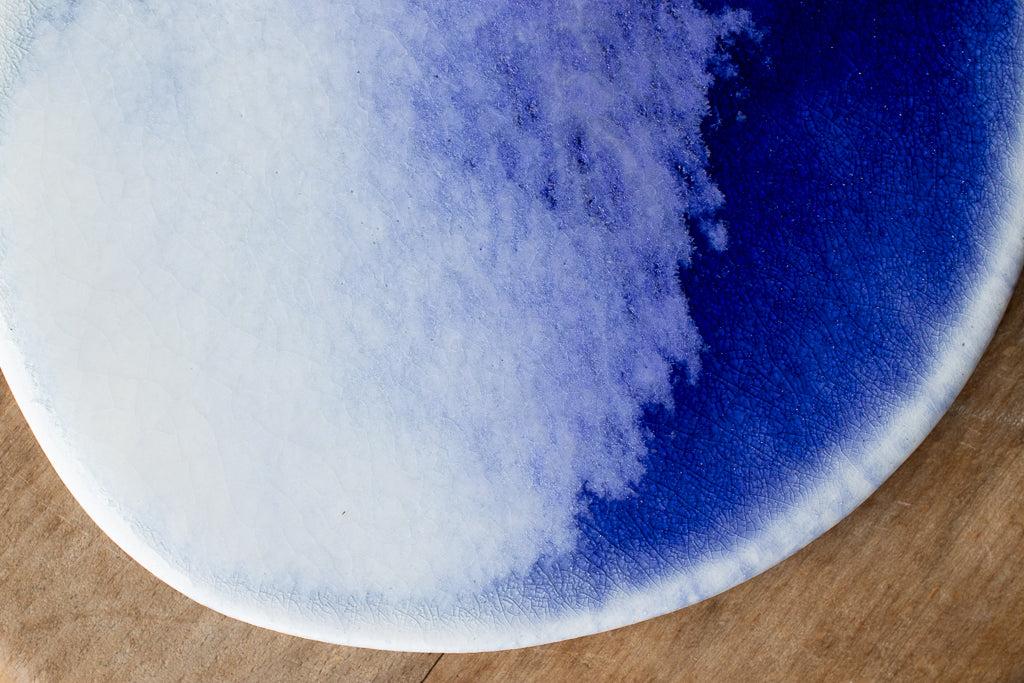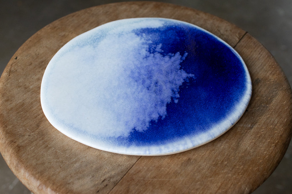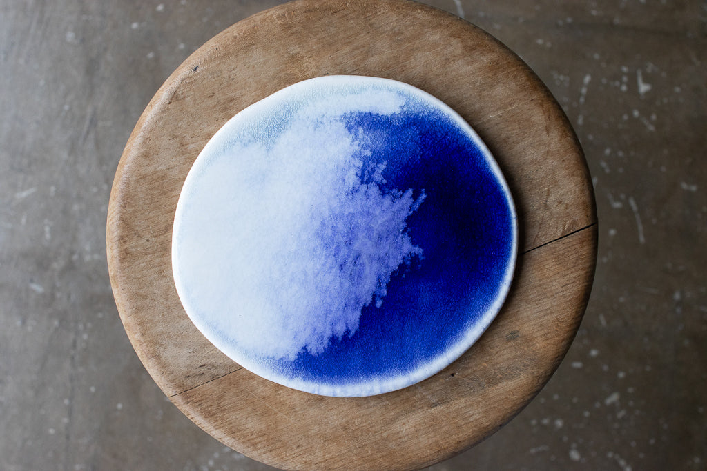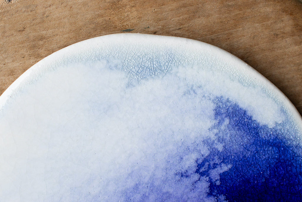 24年夏の個展出展作品。市川さんの代名詞の"流彩釉"がフラットな一面にきらめく美しいお皿です。フリーハンドで象られた造形もユニーク。自ら調合した白土と土灰を使った作品です。