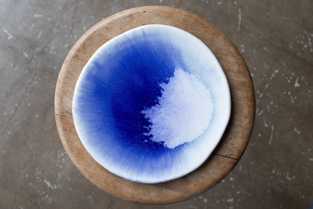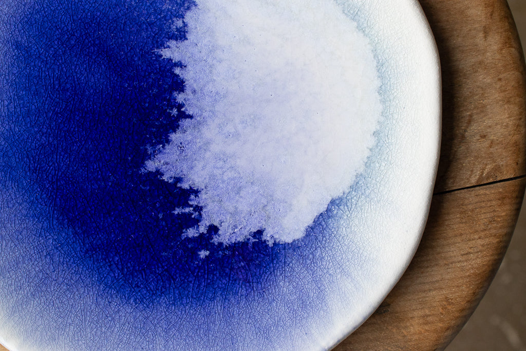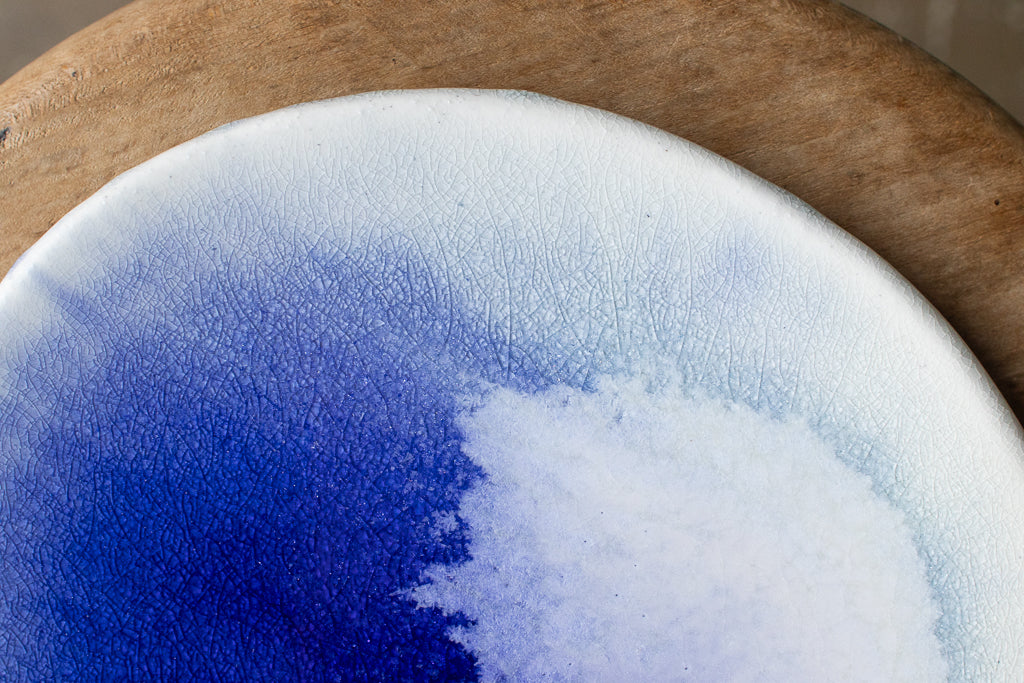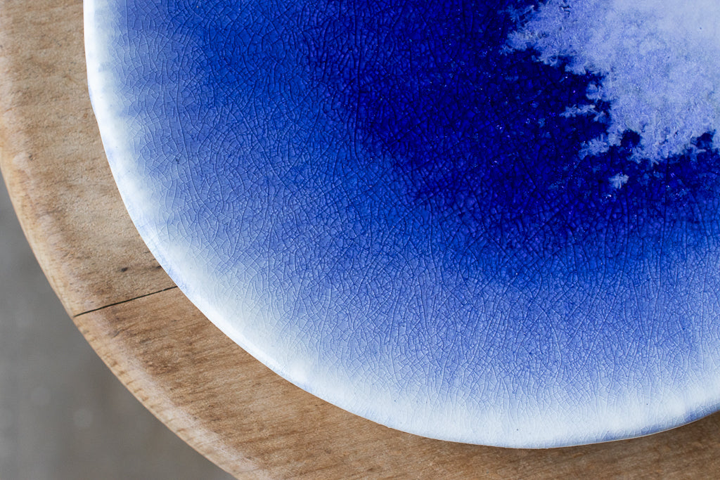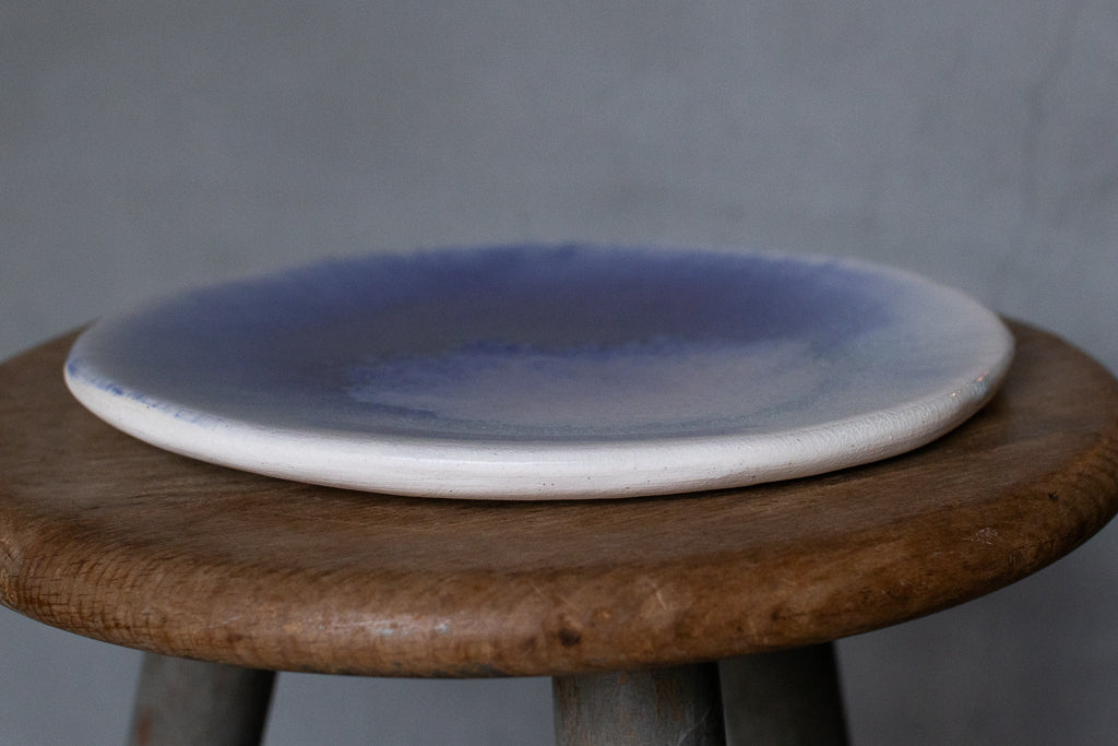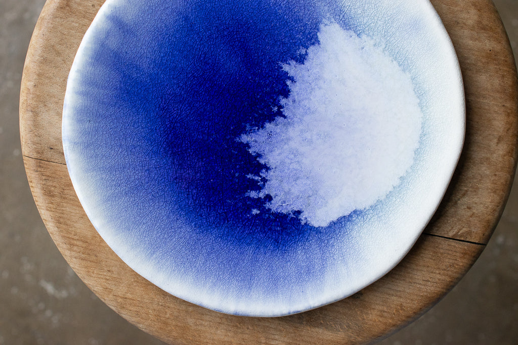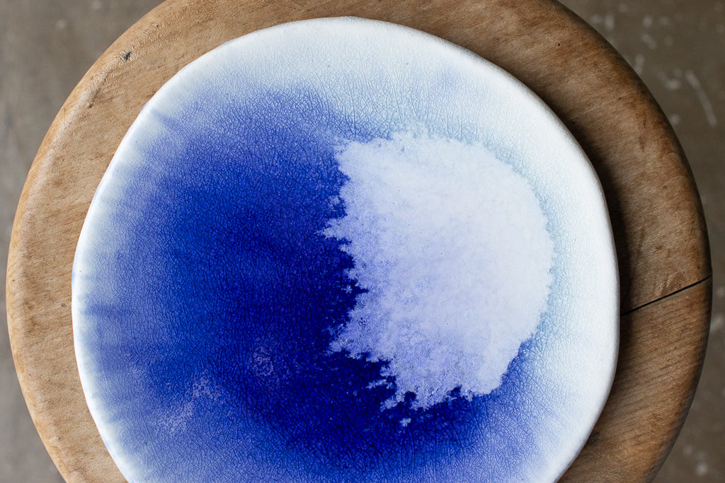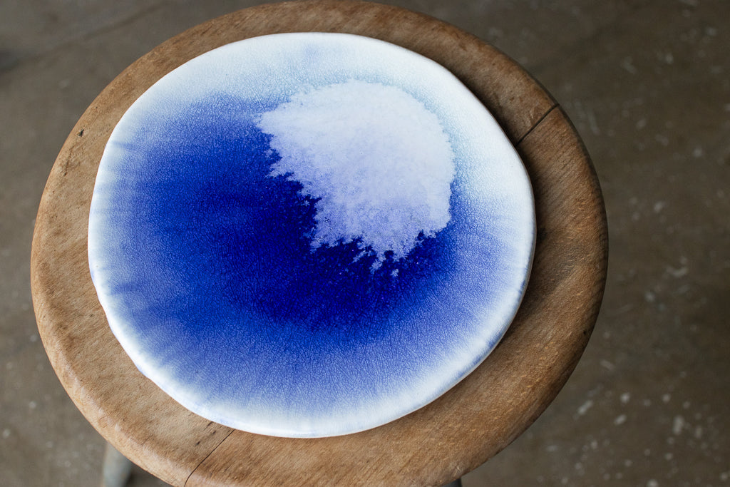 24年夏の個展出展作品。市川さんの代名詞の"流彩釉"がフラットな一面にきらめく美しいお皿です。フリーハンドで象られた造形もユニーク。自ら調合した白土と土灰を使った作品です。