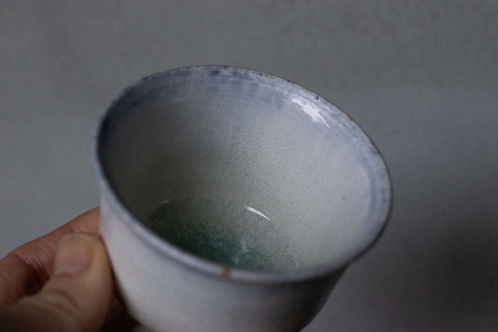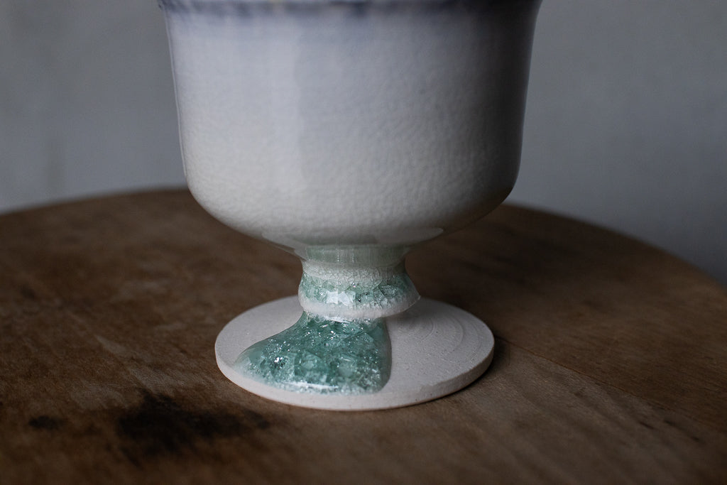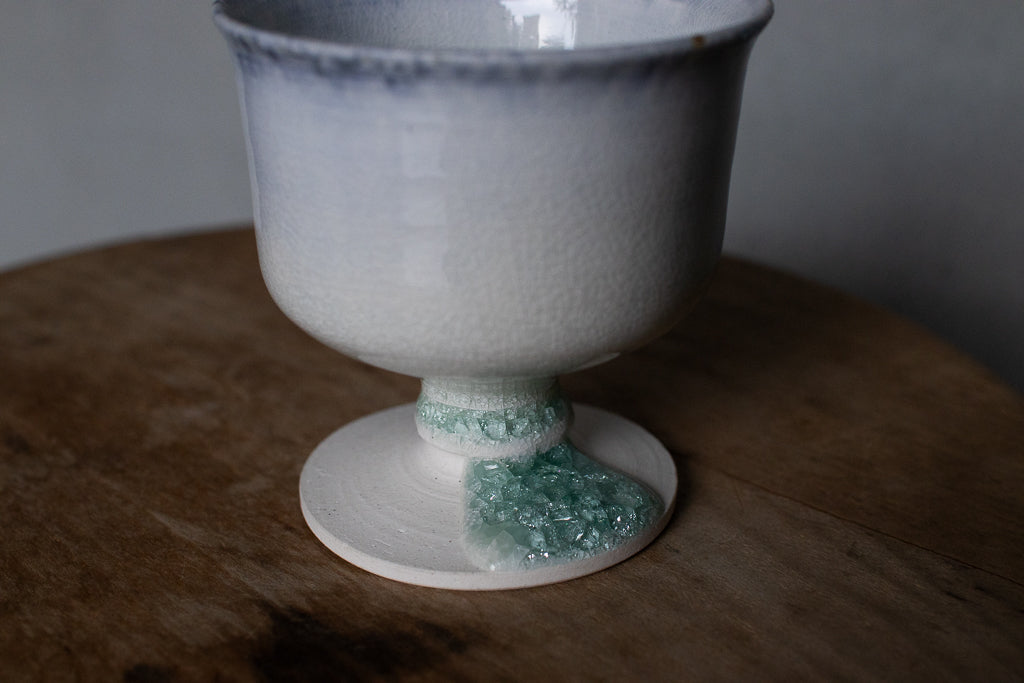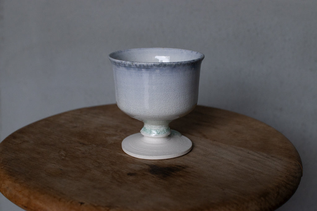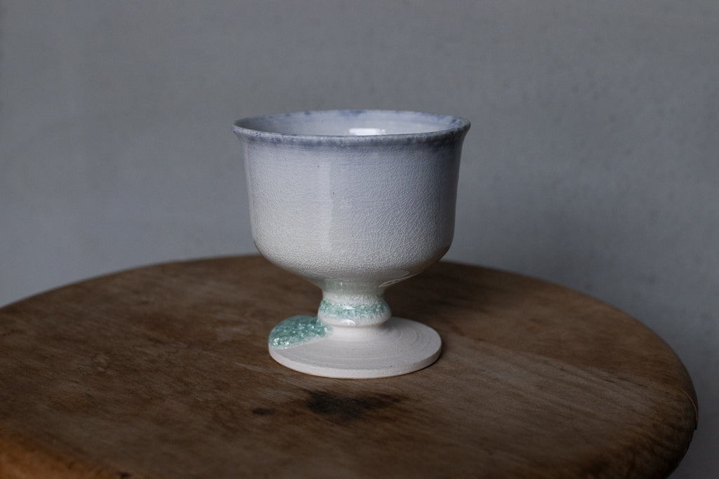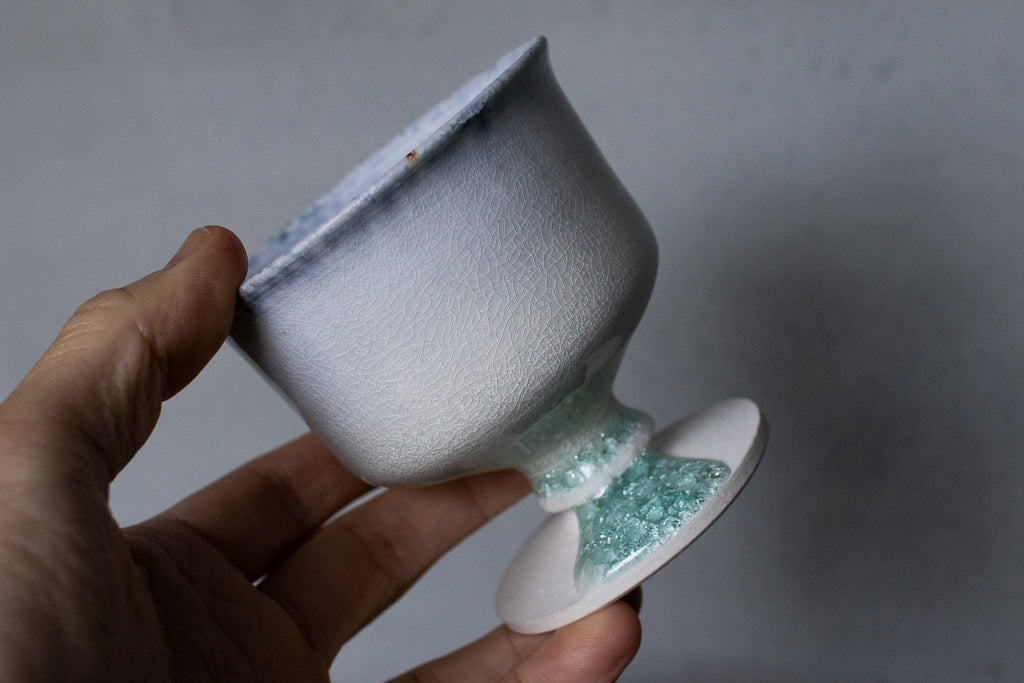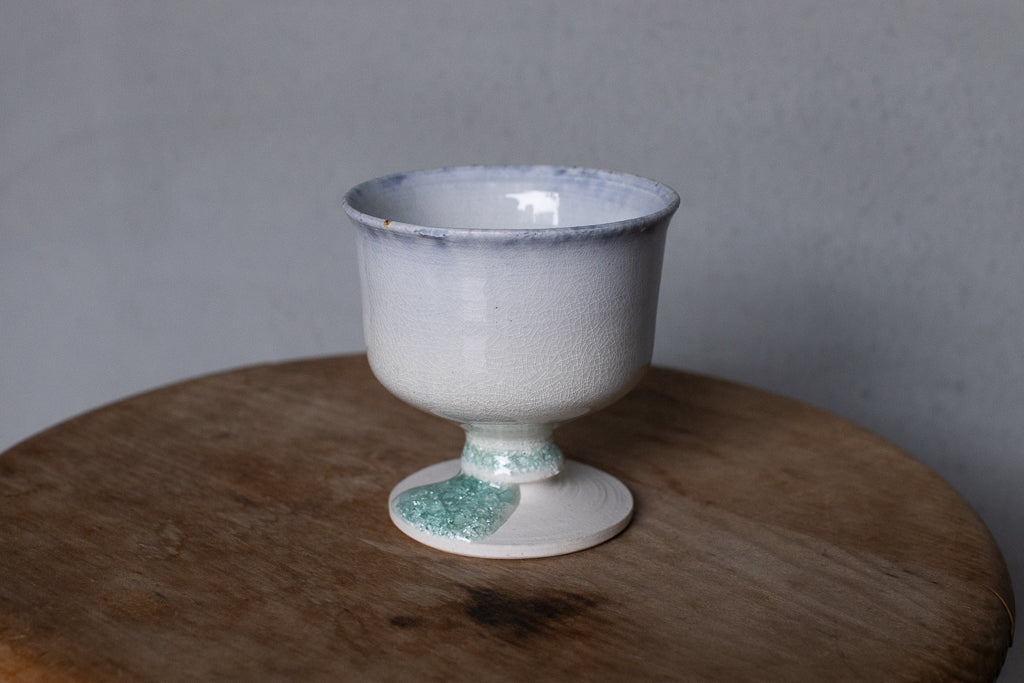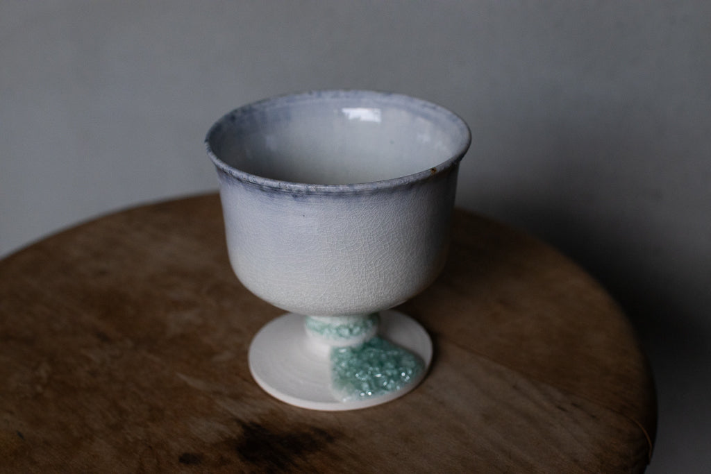 岐阜の市川恵大さんの流彩ゴブレットです。市川さんの代名詞の"流彩釉"。側面の釉の流れ、見込みの溜まりが美しい。自ら調合した白土と土灰を使った作品です。