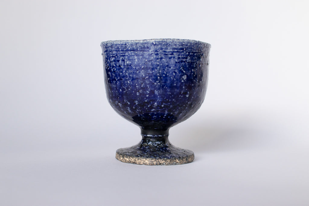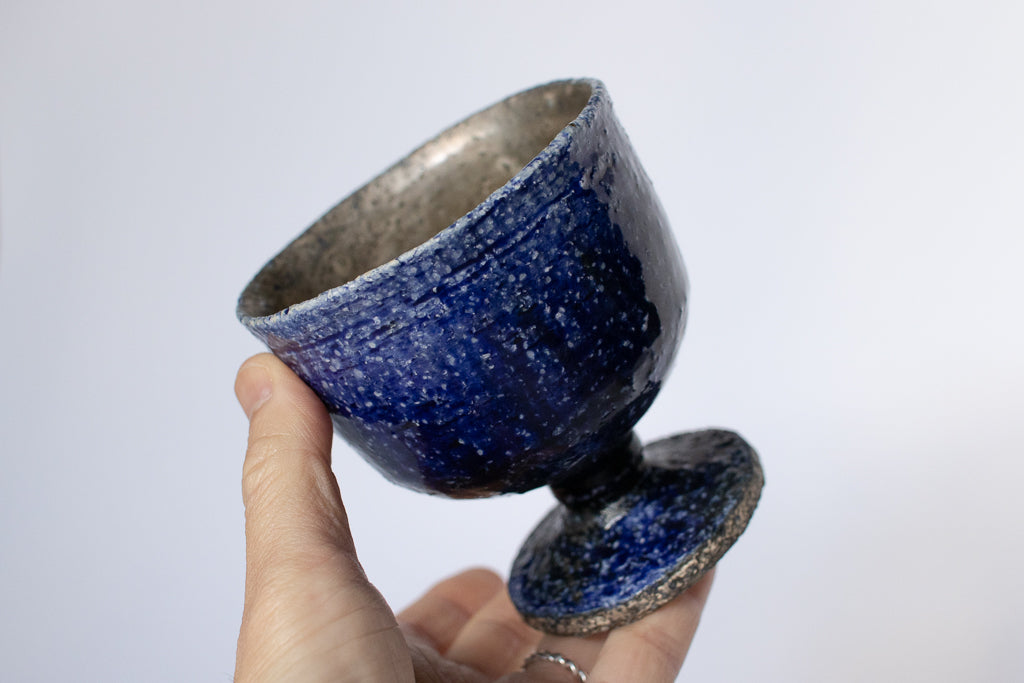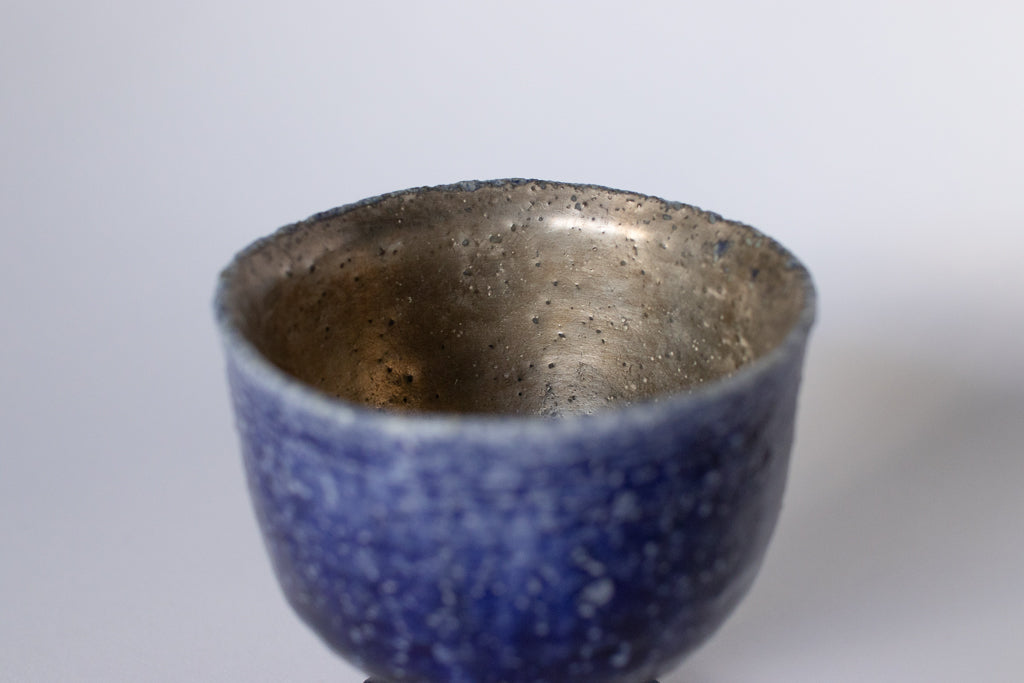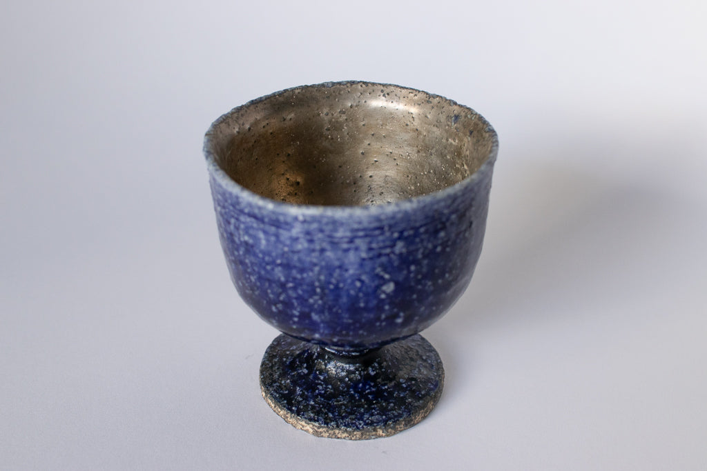 岐阜の市川恵大さんの瑠璃銀彩ゴブレットです。深い瑠璃色と、内側の朽ちたような風合いに施された銀彩のコントラストが美しい作品です。