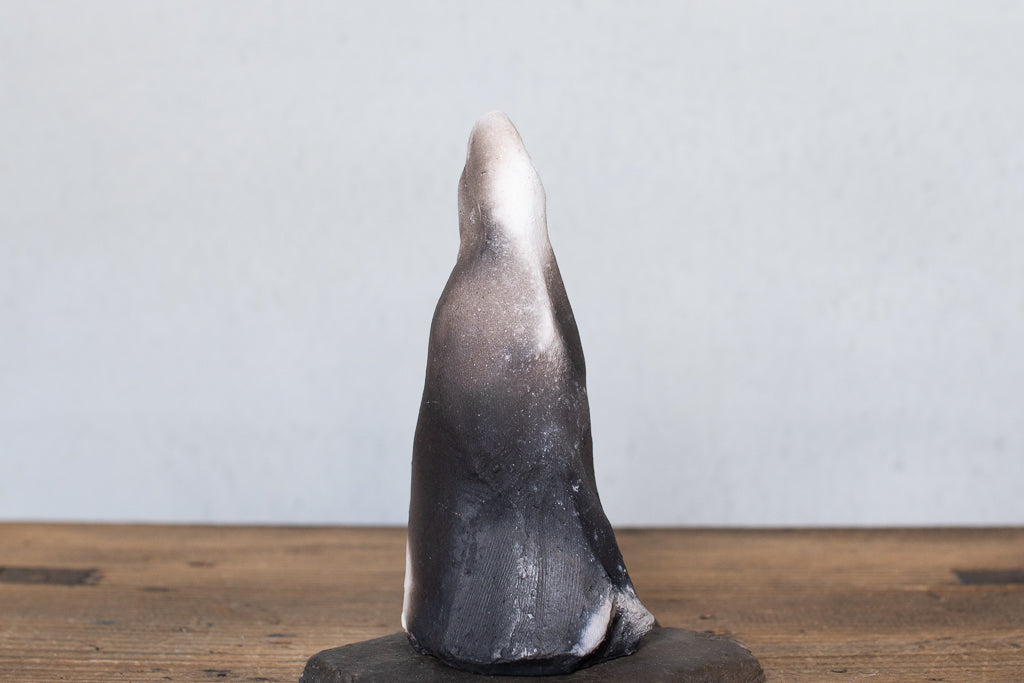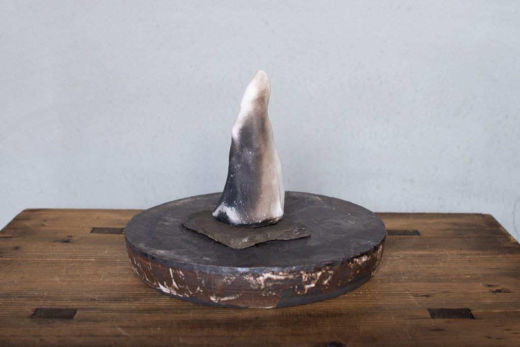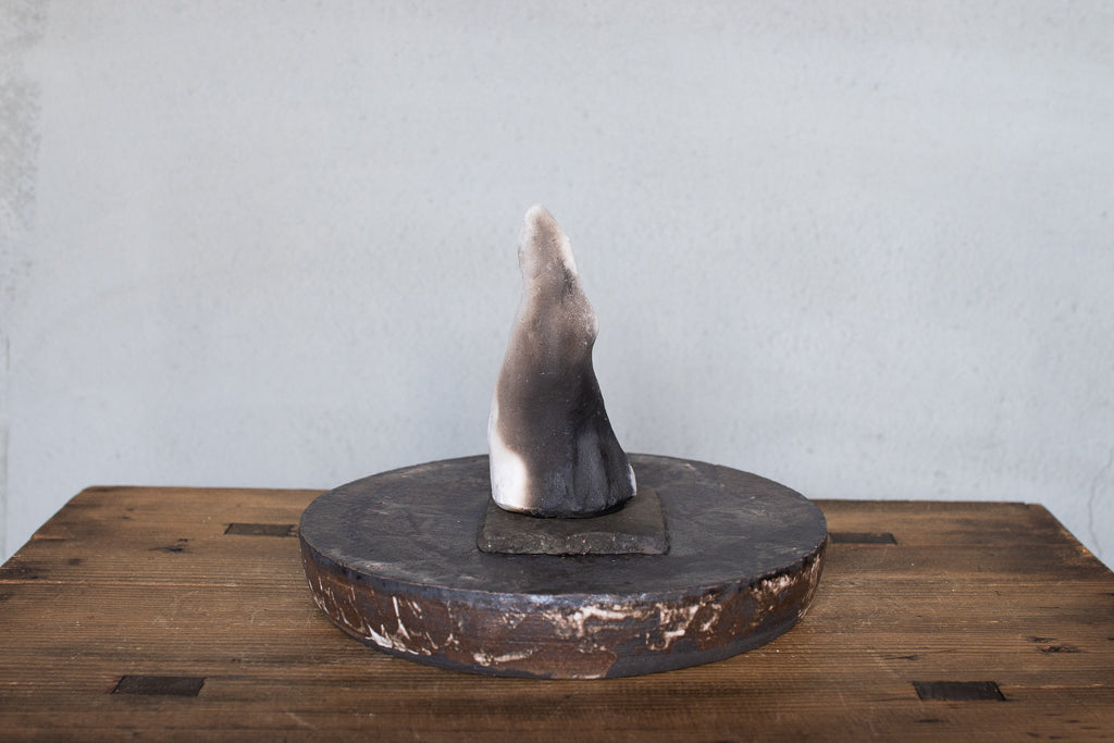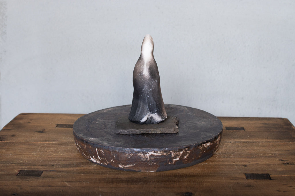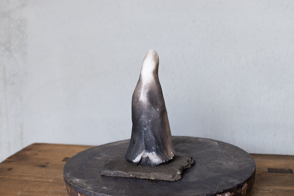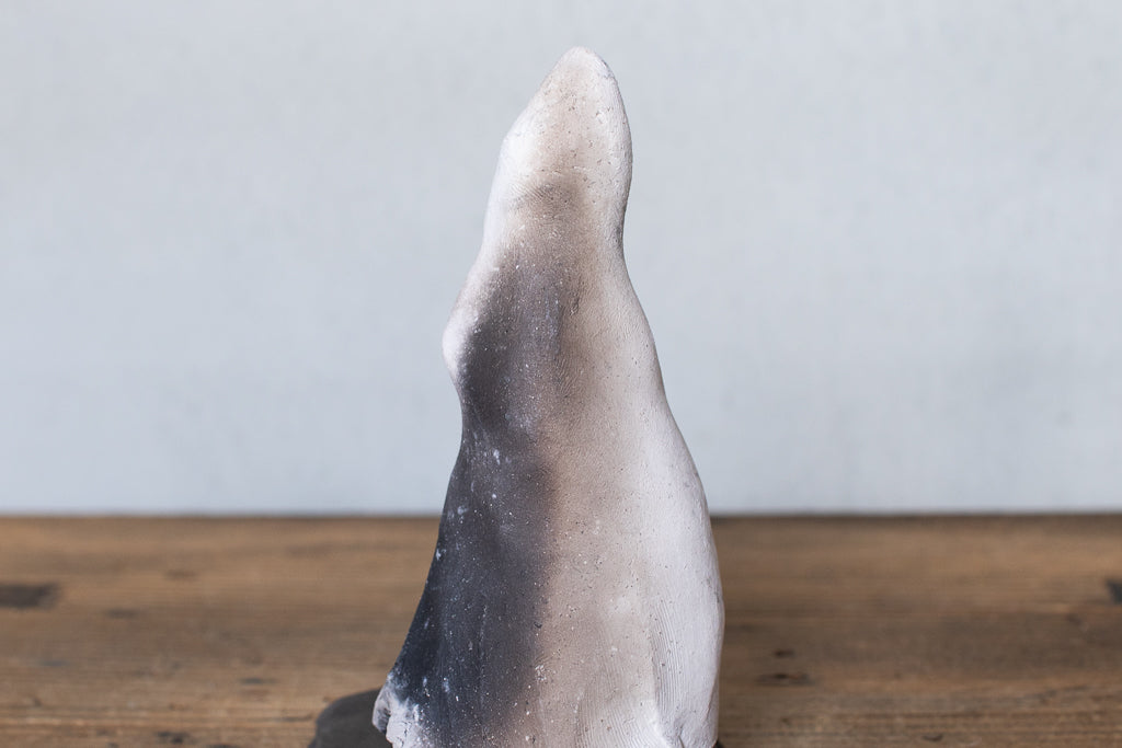 岐阜の市川恵大さんの野焼き焼成されたオブジェ”仏”です。白土にところどころ炭化のテクスチャが顕れて極めて渋い逸品に仕上がっています。