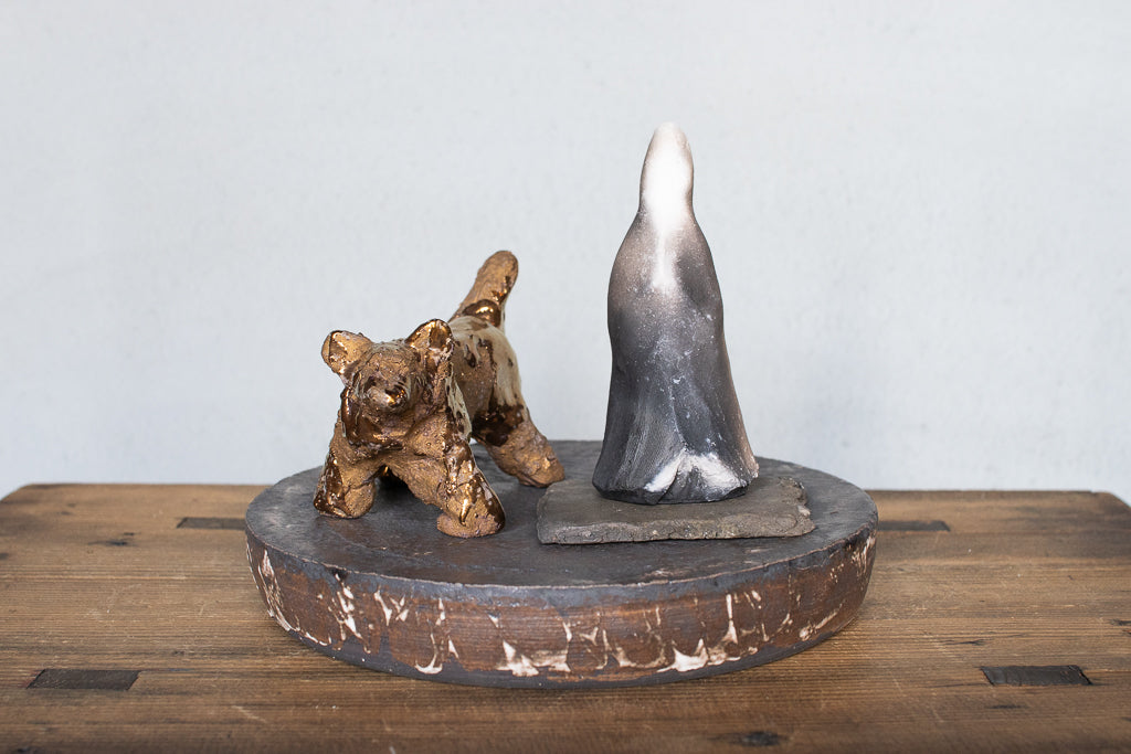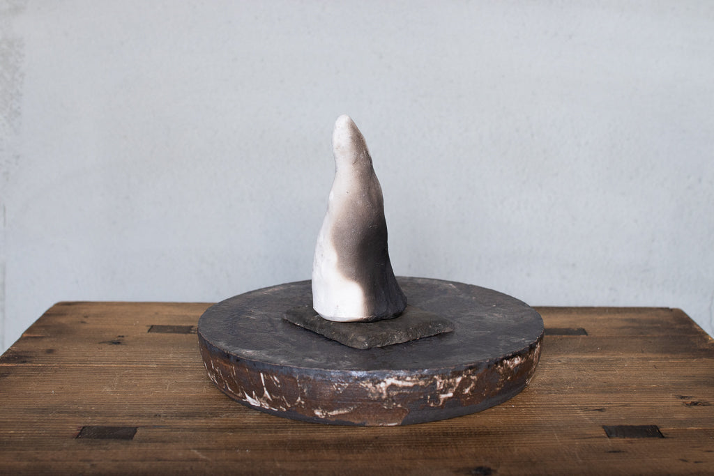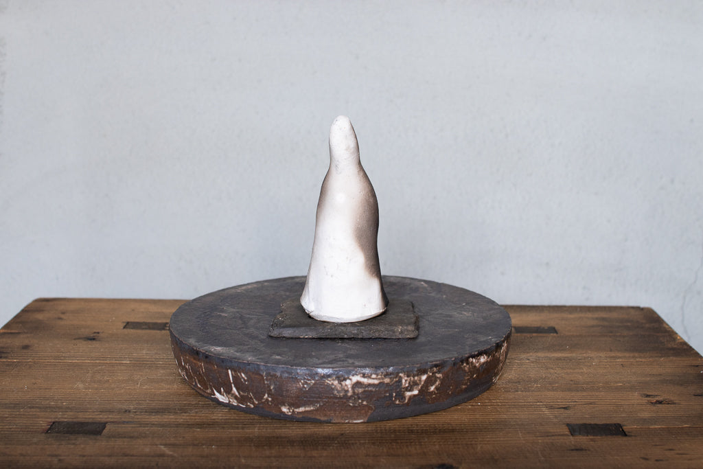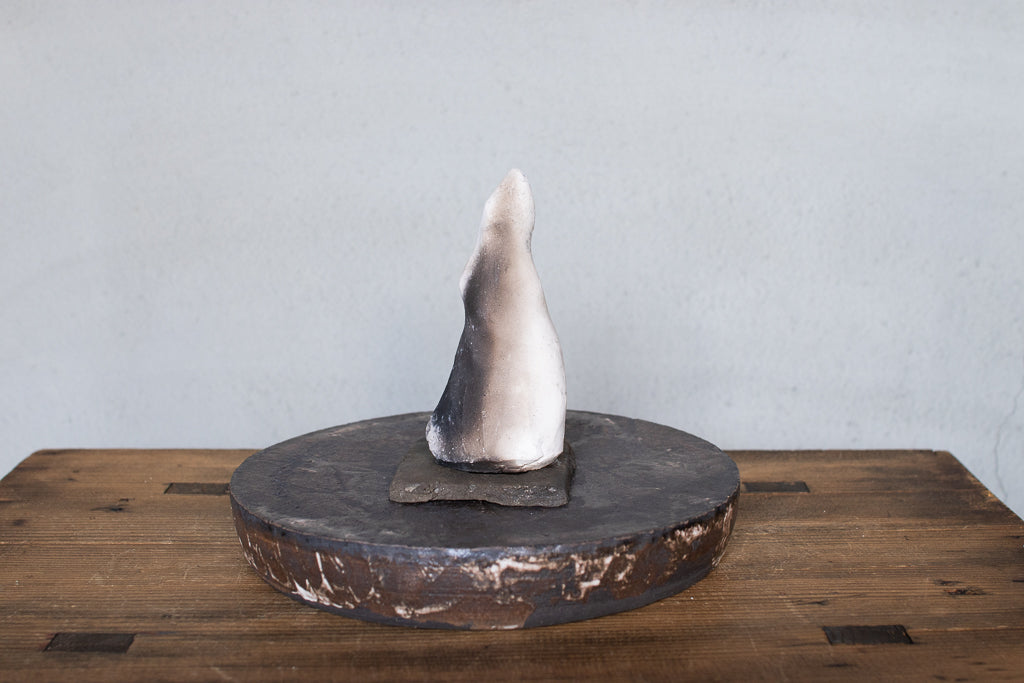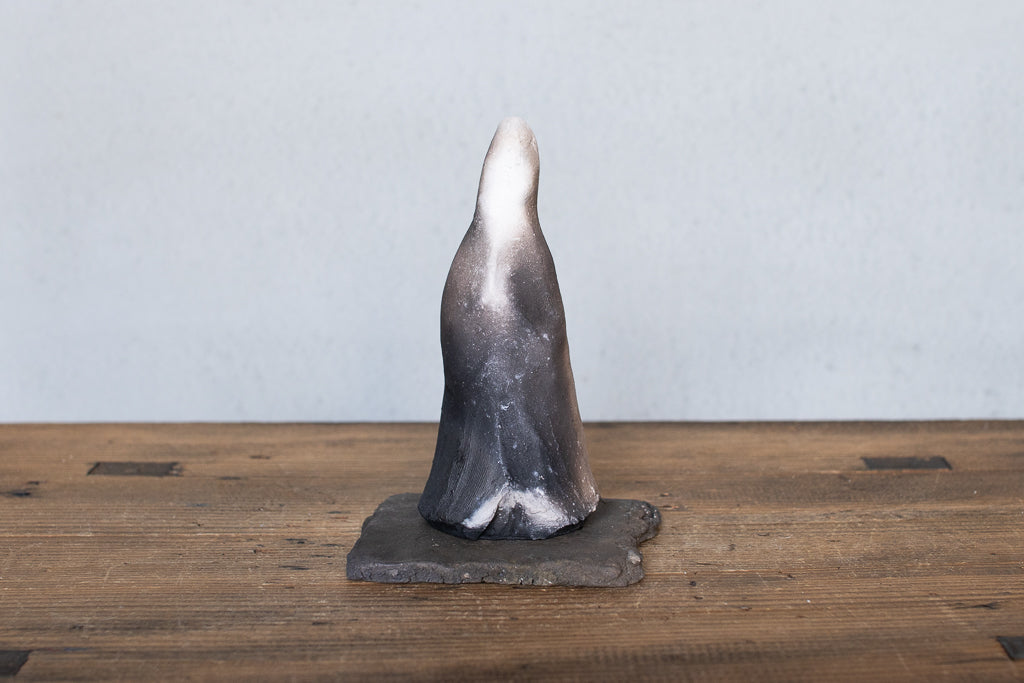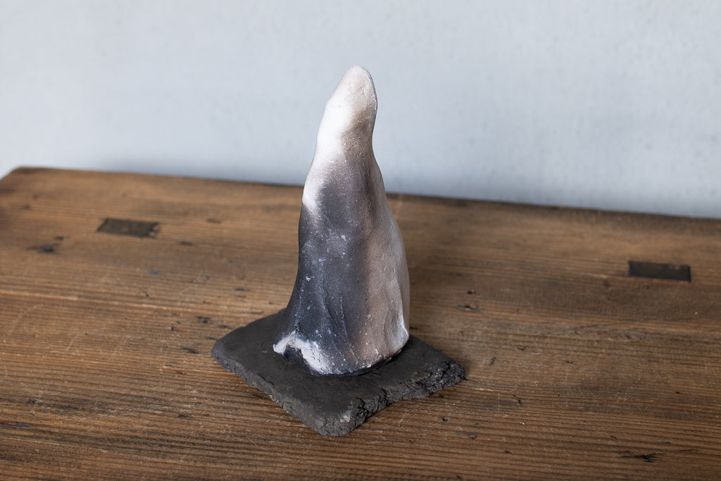 岐阜の市川恵大さんの野焼き焼成されたオブジェ”仏”です。白土にところどころ炭化のテクスチャが顕れて極めて渋い逸品に仕上がっています。