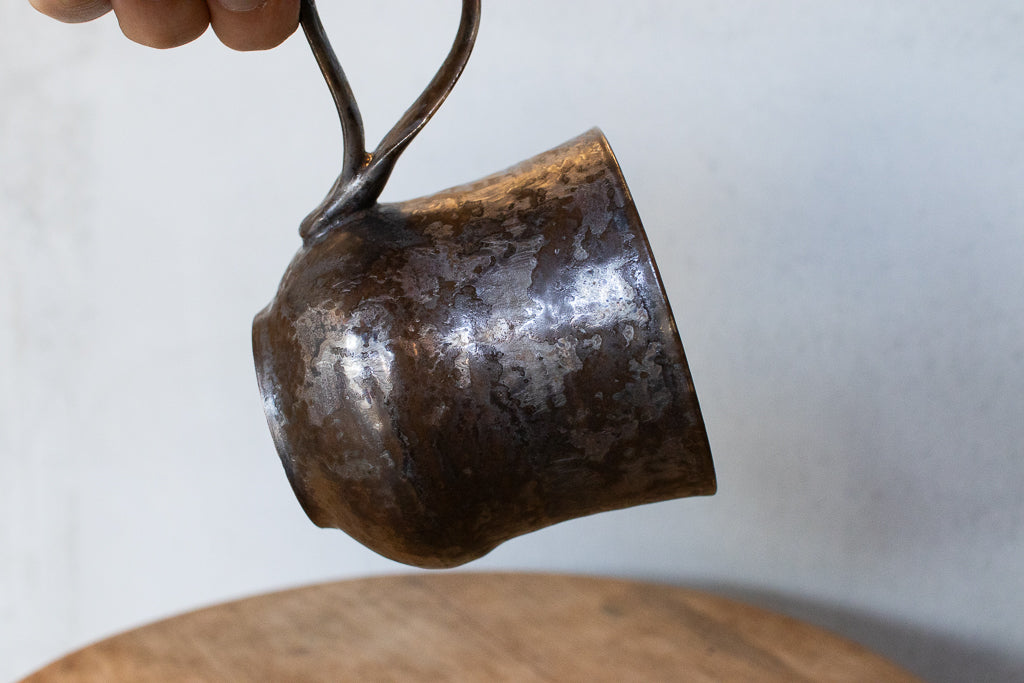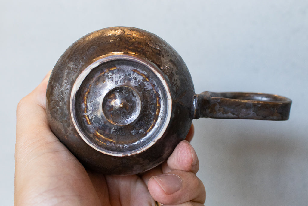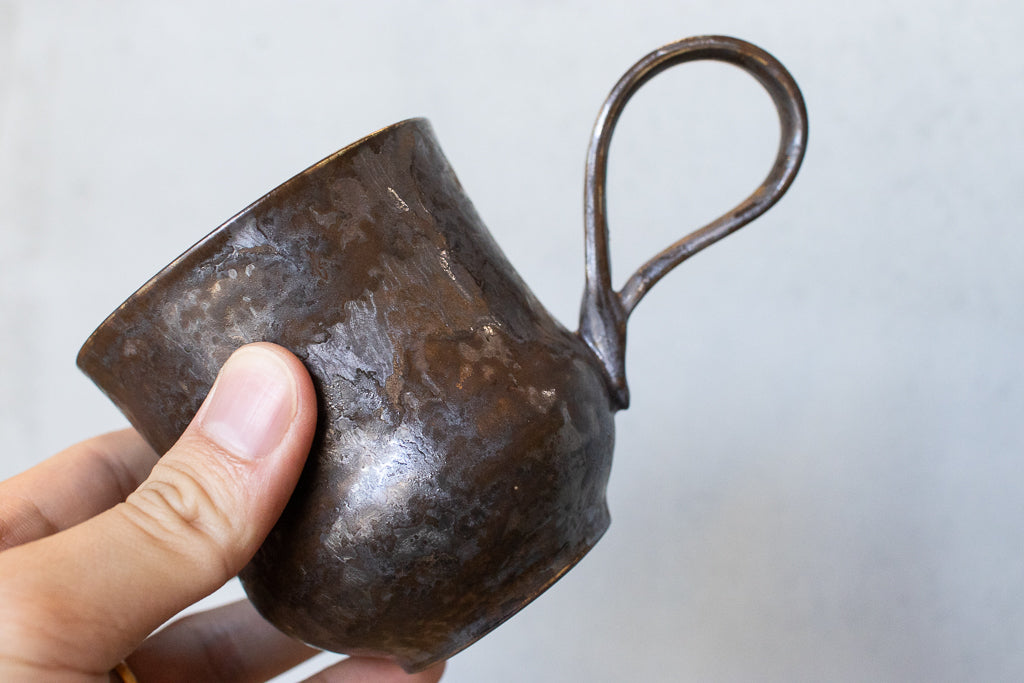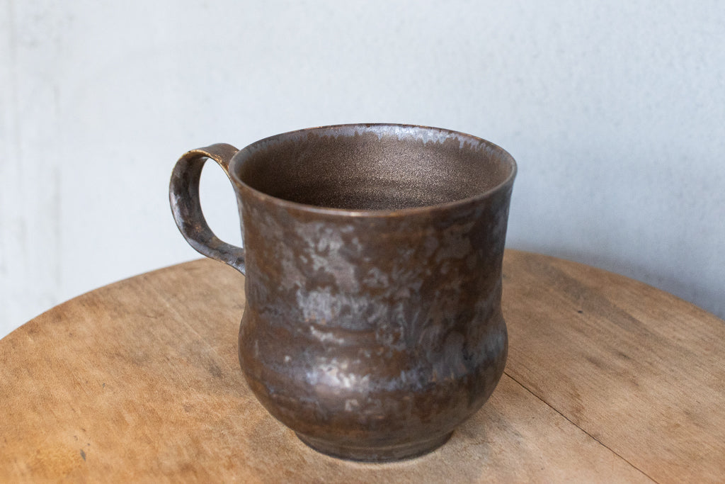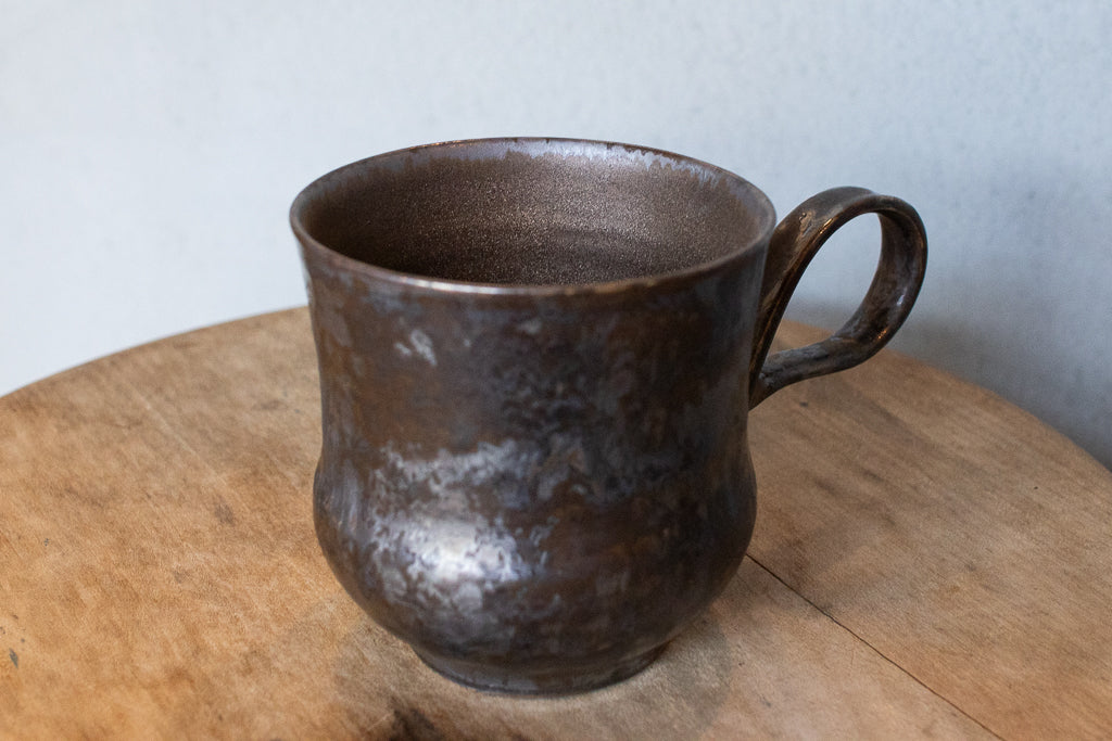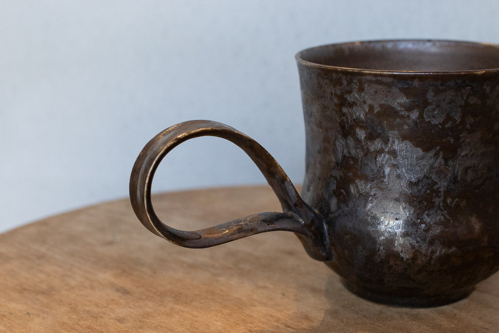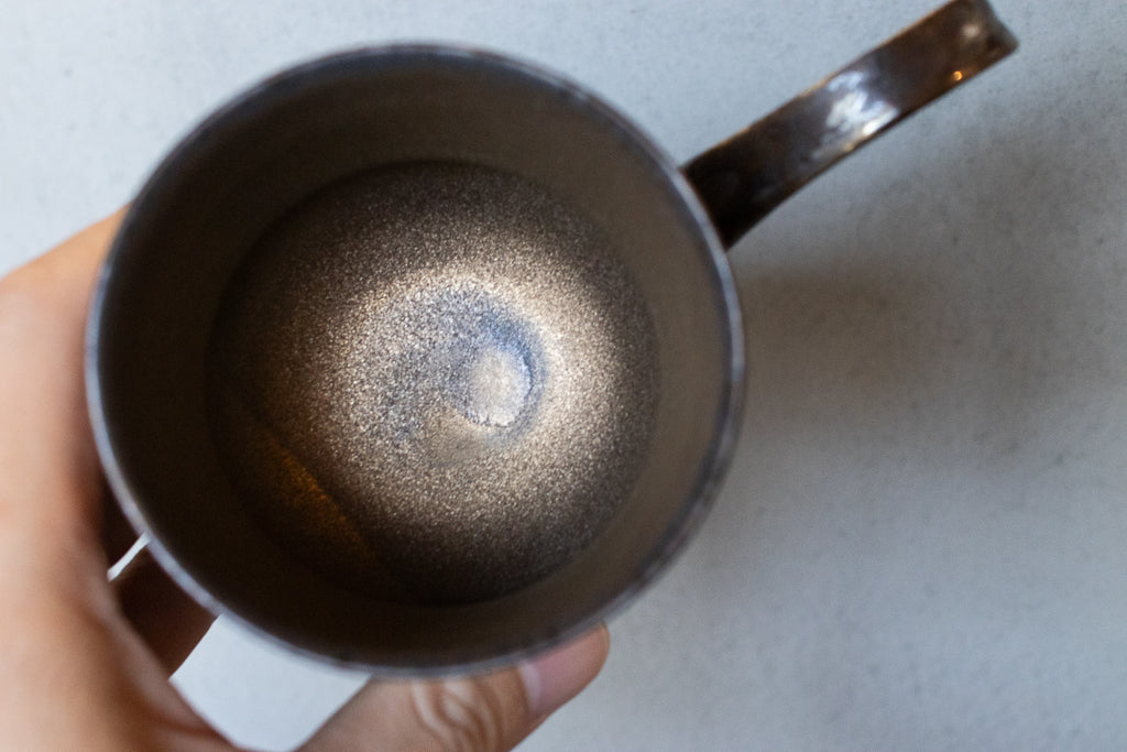「くろがね」と名付けられた金属質に鈍く輝く釉薬が非常に格好良いです。薄く仕上げられた口縁もコーヒーの切れの良い味わいに一役買ってくれそう。スポンジや筆を用いて施釉することで独特のレイヤー感のある表情に仕上げています。削りやハンドルの作りも含めて非常に手間のかかった一品。釉薬の種類・掛け方を変えた内側の流れるような表情・見込みの釉溜まりも素晴らしい。おすすめです。