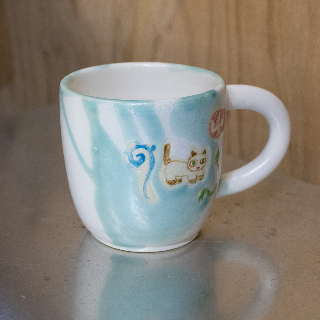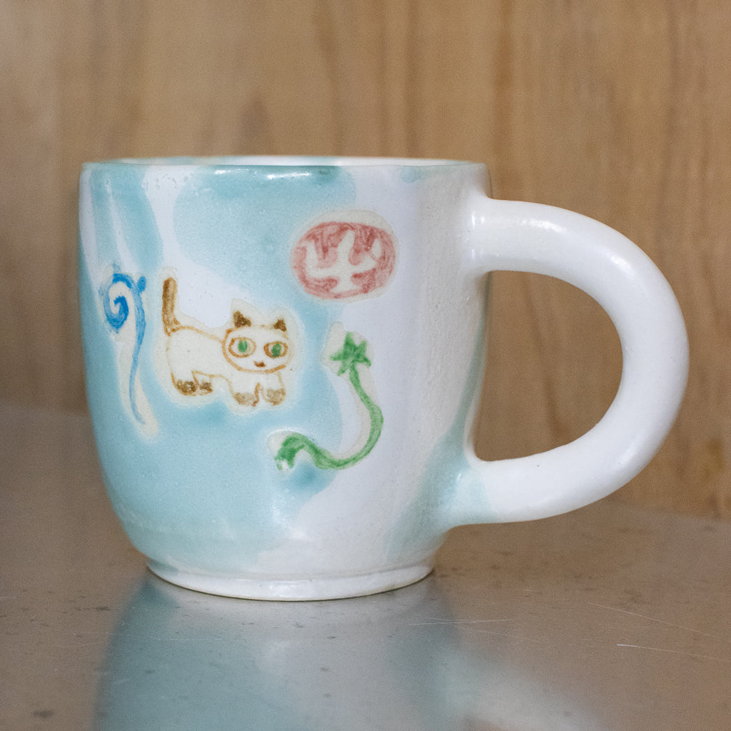 時山桜さんのマグカップです。人気のかわいい猫モチーフ。やや大きめのマグカップ。最近時山さんの技量が向上して大きめのサイズを製作できるようになったらしいですよ。ただでさえ所有欲を満たしてくれるカワイイアイテムを日常的にヘビーユースできるのはありがたいですね。