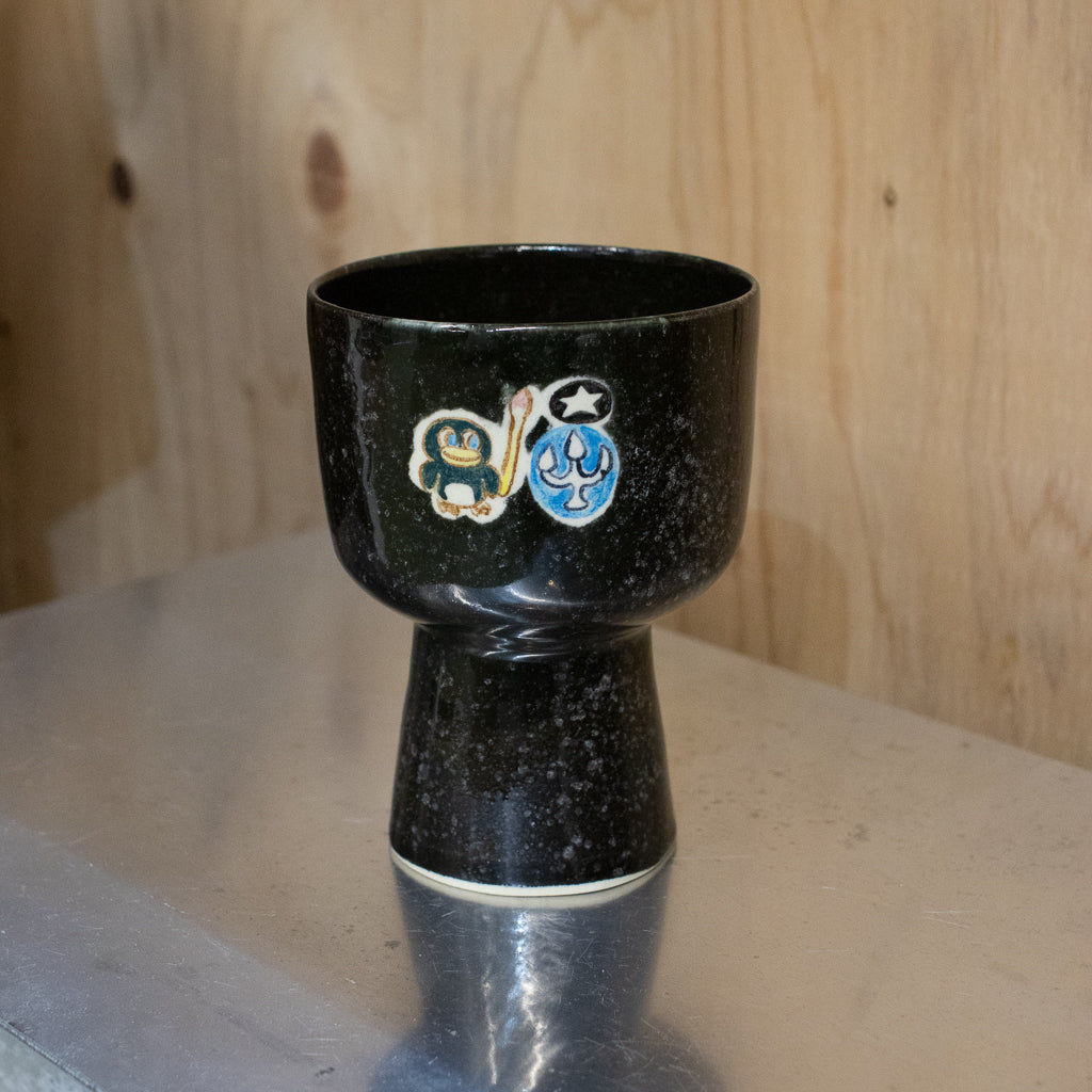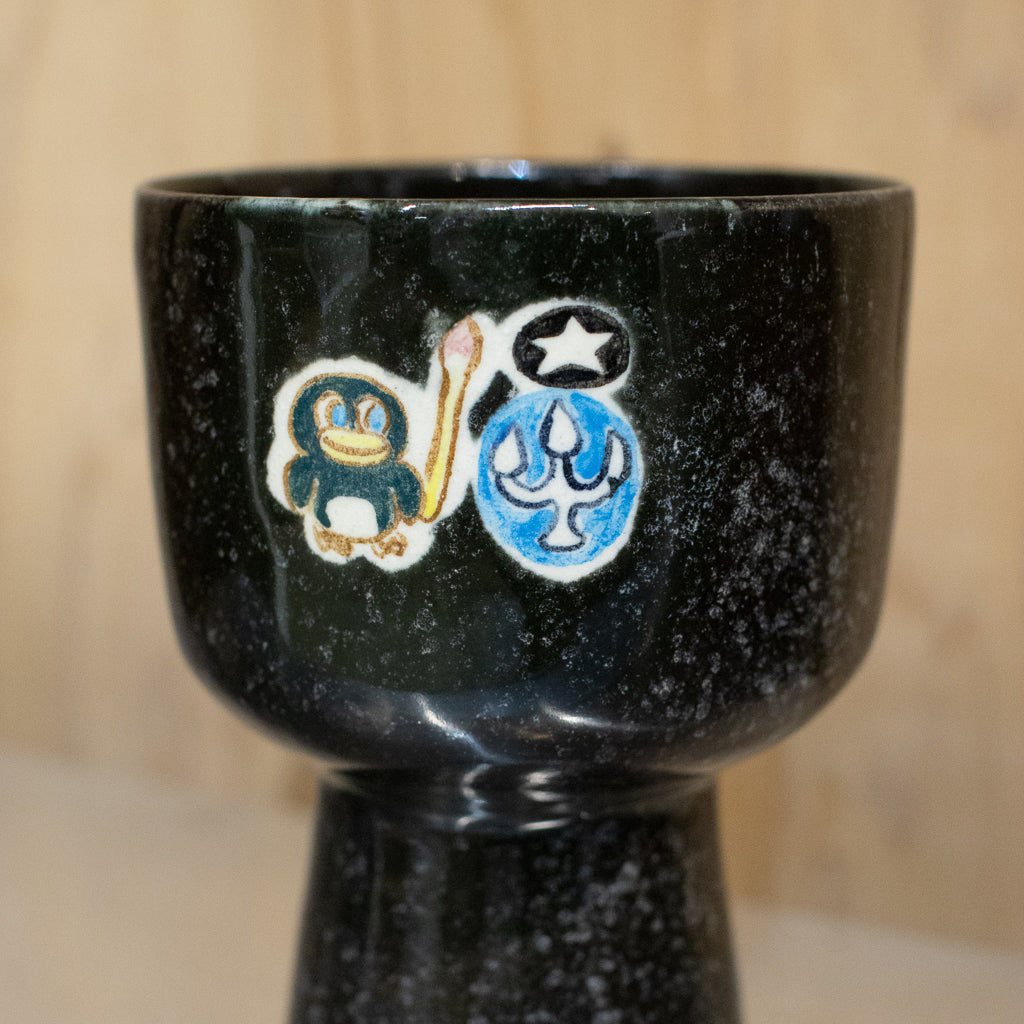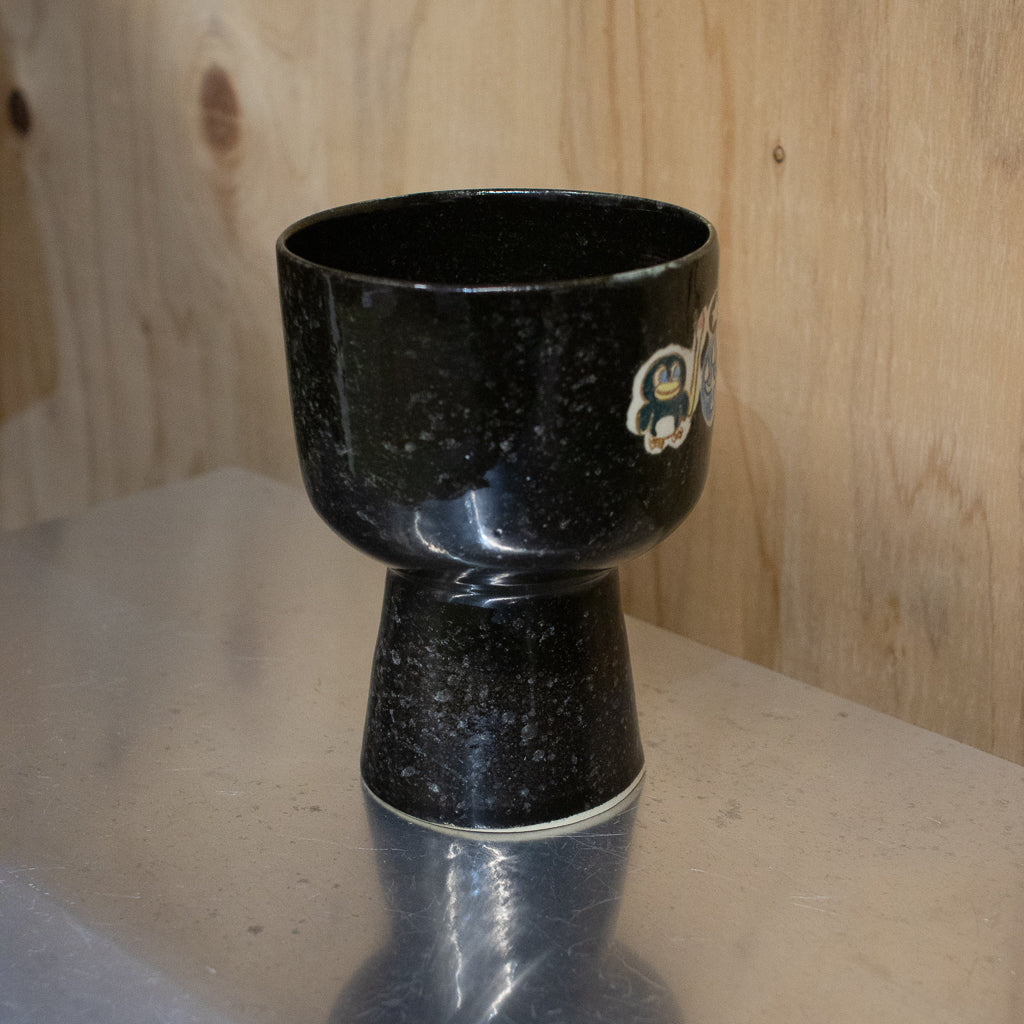 時山桜さんのしっかり目の容量が確保された高坏のゴブレット。キュートな絵付けが施された一点ものです。スペーシーなキラキラ感のあるブラックカラー。最近時山さんの技量が向上して大きめのサイズを製作できるようになったらしいですよ。ただでさえ所有欲を満たしてくれるカワイイアイテムを日常的にヘビーユースできるのはありがたいですね。