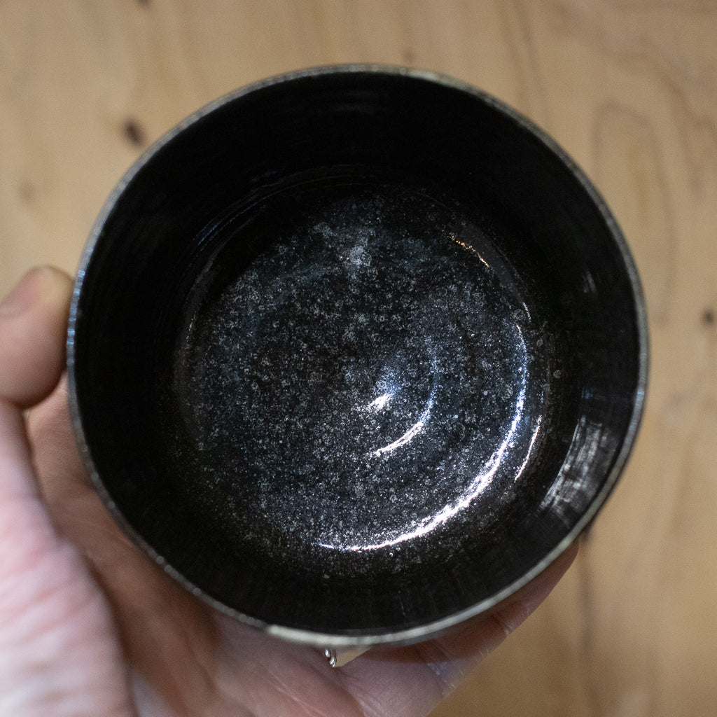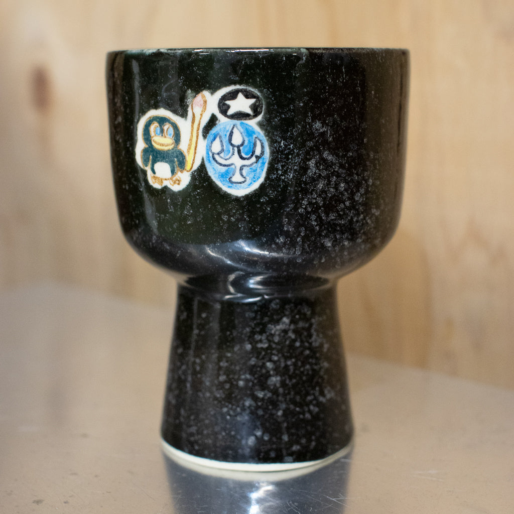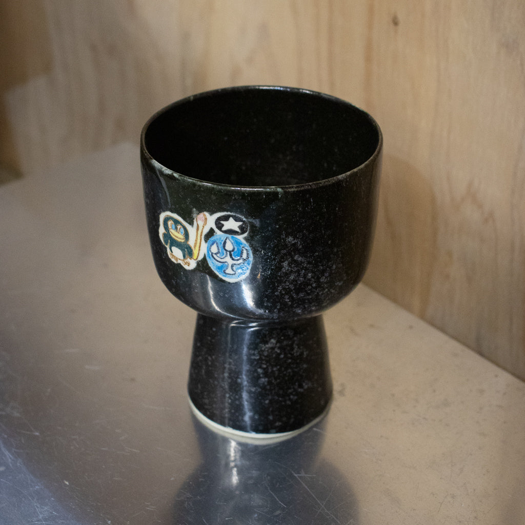 時山桜さんのしっかり目の容量が確保された高坏のゴブレット。キュートな絵付けが施された一点ものです。スペーシーなキラキラ感のあるブラックカラー。最近時山さんの技量が向上して大きめのサイズを製作できるようになったらしいですよ。ただでさえ所有欲を満たしてくれるカワイイアイテムを日常的にヘビーユースできるのはありがたいですね。