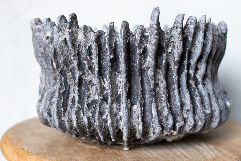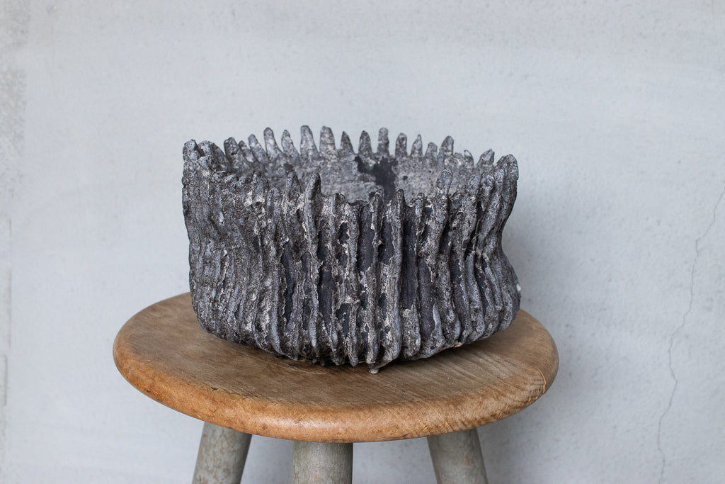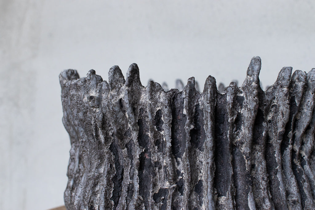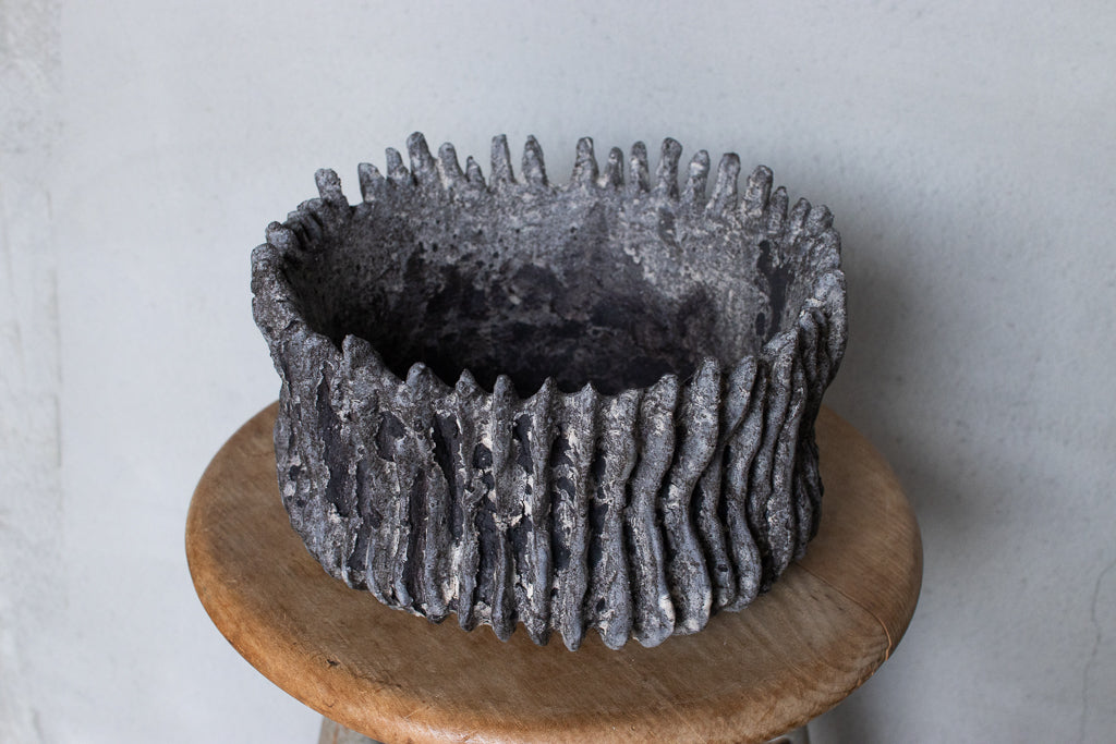 栁川晶子さんの大きめの植木鉢。ハードな造形と落ち着いた色目がグリーンを引き立たせそうです。顔料で色味をつけてから化粧土を掛けた無釉の焼締めの作品。独特の枯れた表情がとても素敵です。色の付け方、化粧土の掛け方によってひとつとして同じ表情のものはない魅力的な仕上がりです。