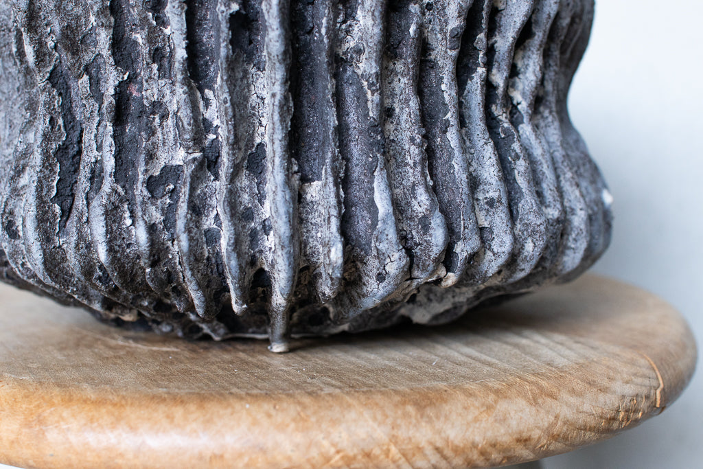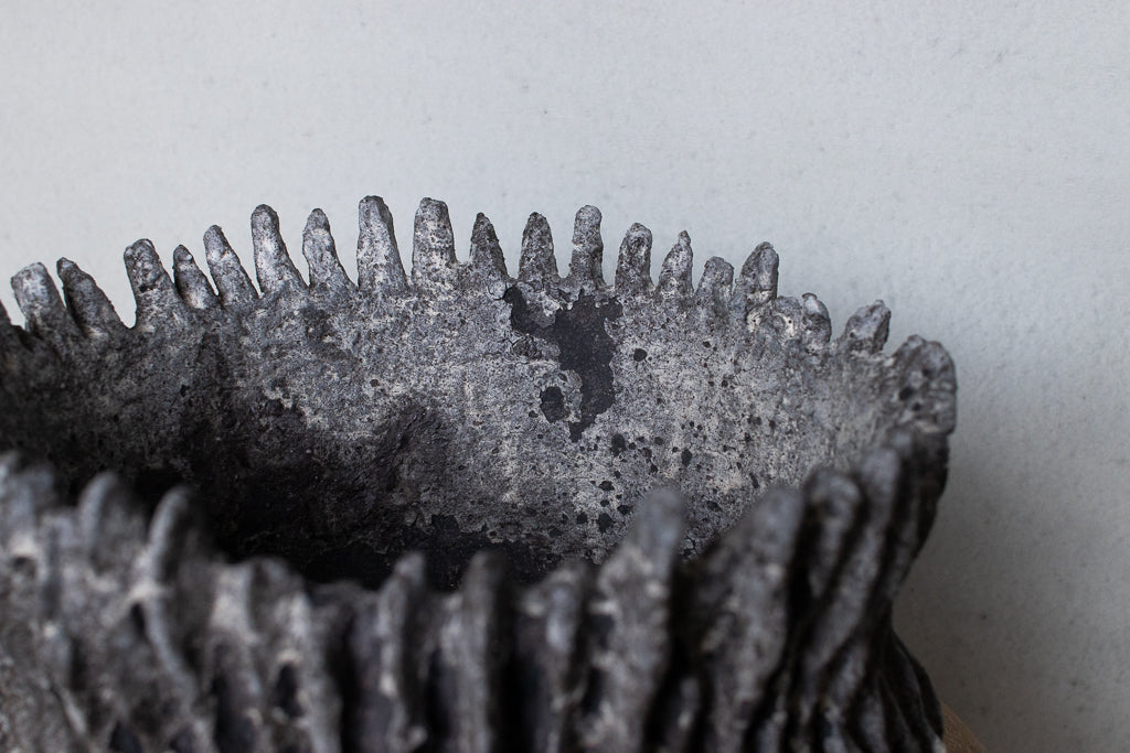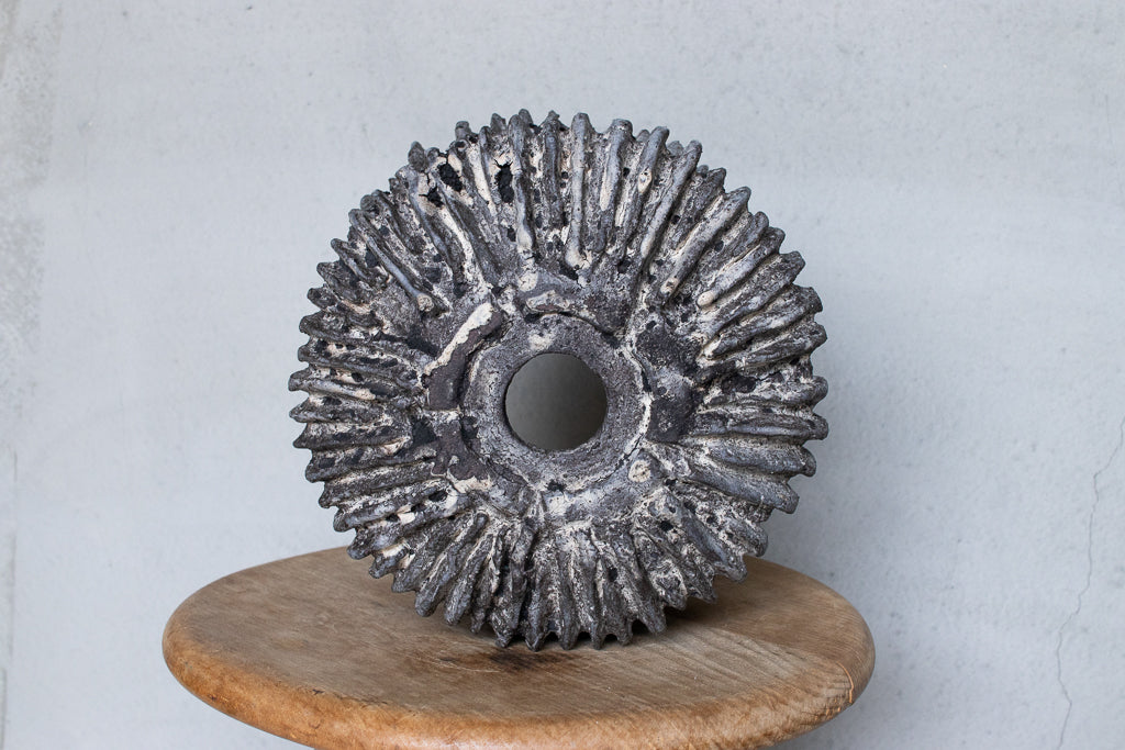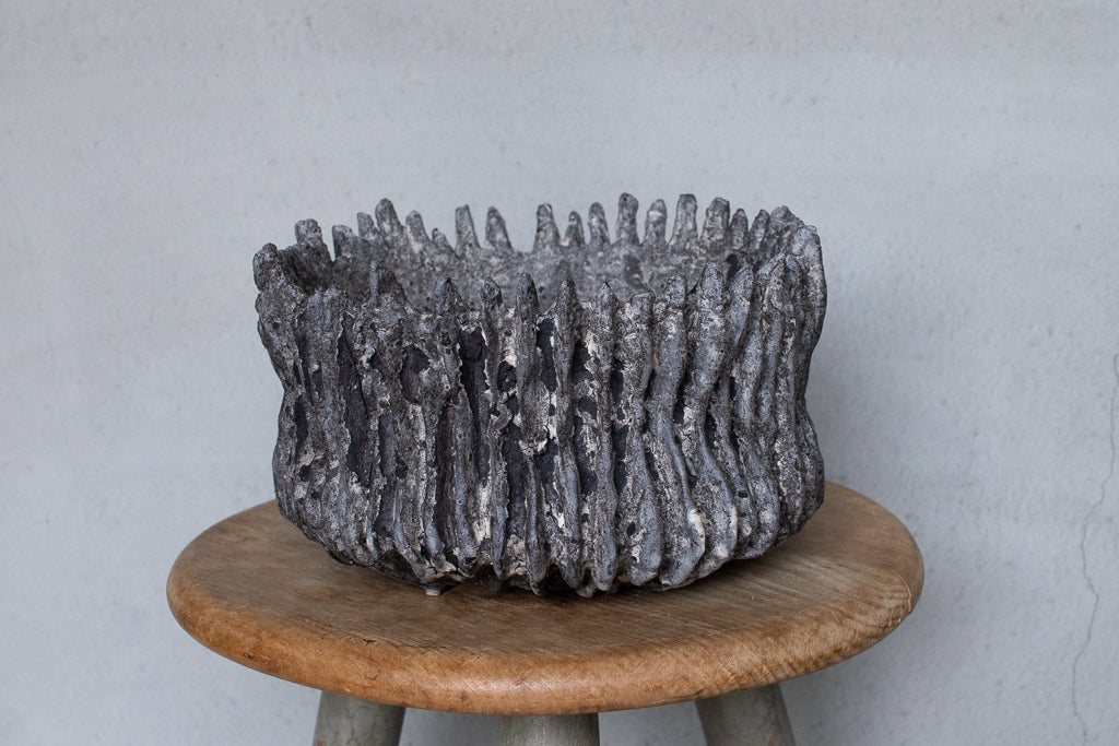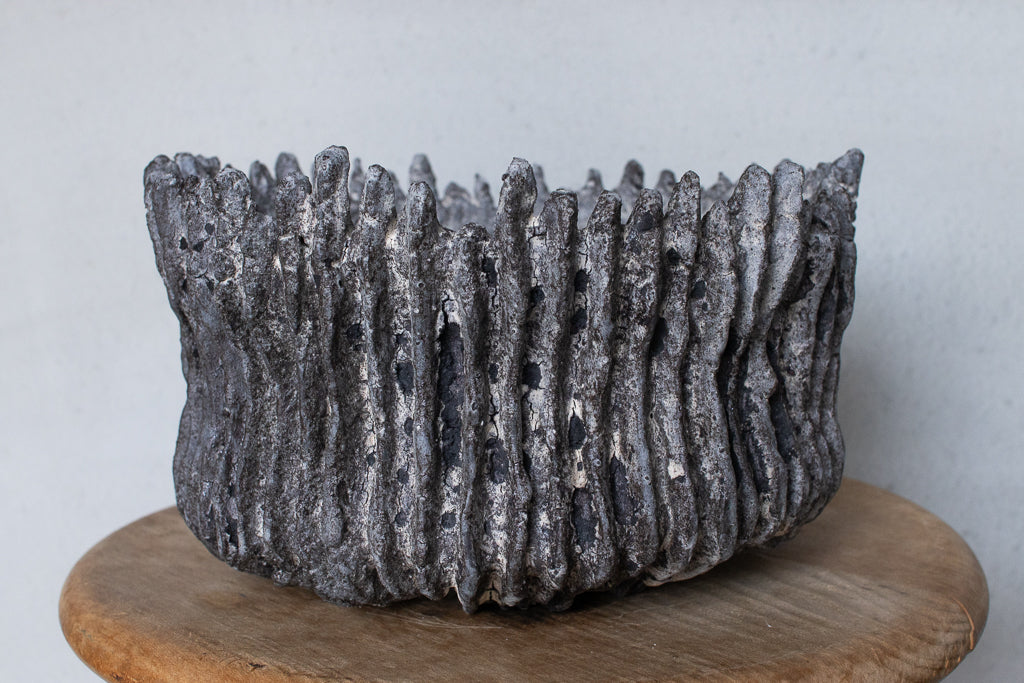 栁川晶子さんの大きめの植木鉢。ハードな造形と落ち着いた色目がグリーンを引き立たせそうです。顔料で色味をつけてから化粧土を掛けた無釉の焼締めの作品。独特の枯れた表情がとても素敵です。色の付け方、化粧土の掛け方によってひとつとして同じ表情のものはない魅力的な仕上がりです。