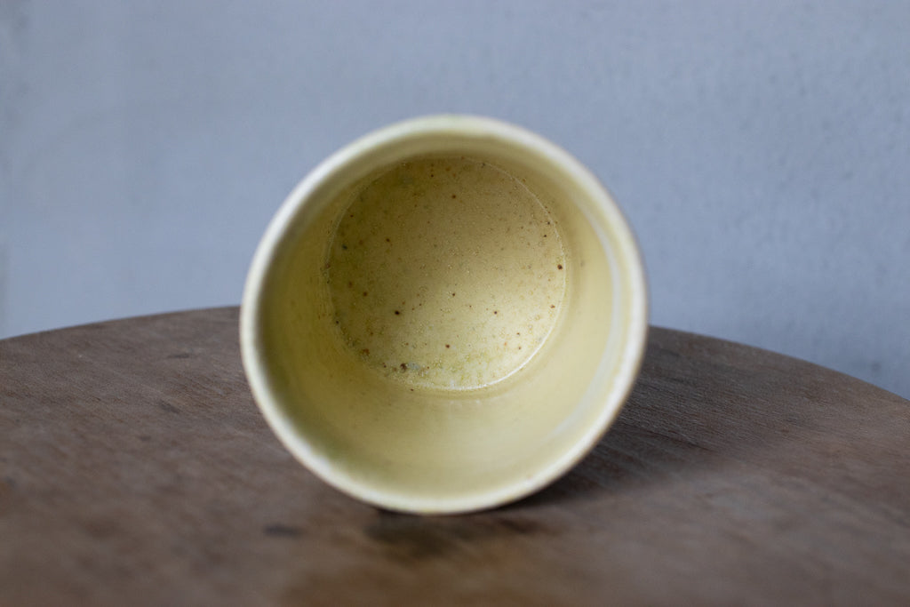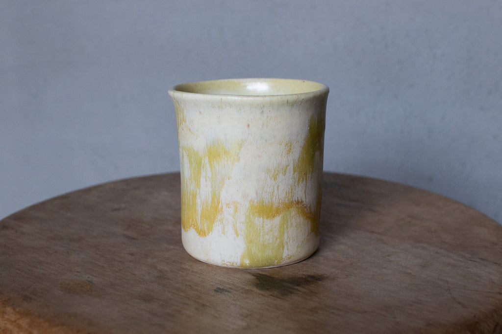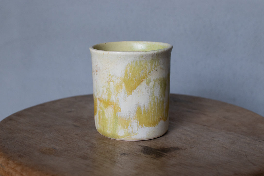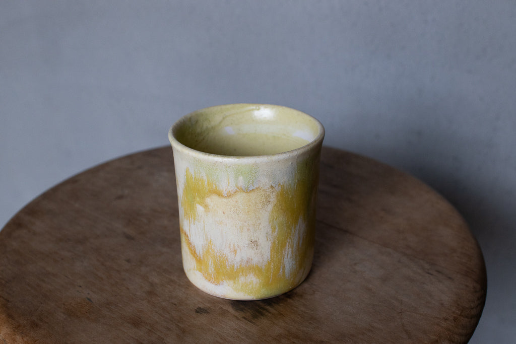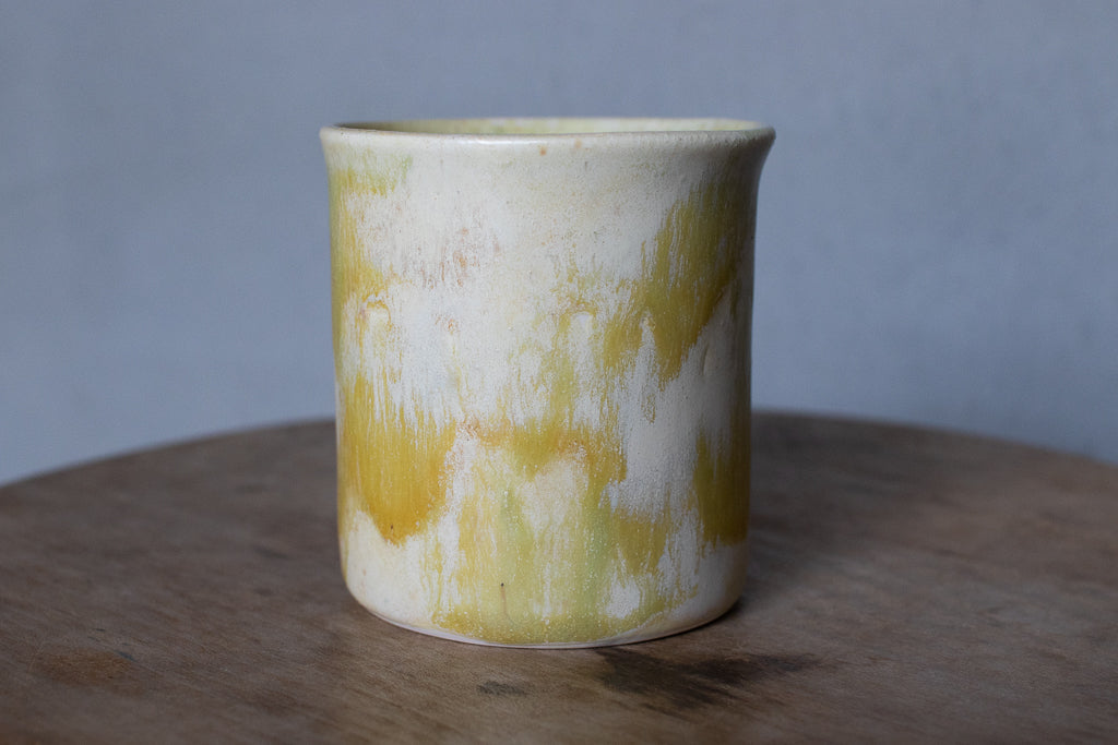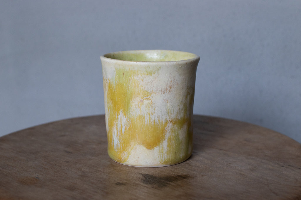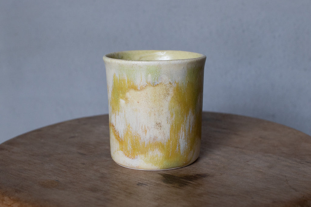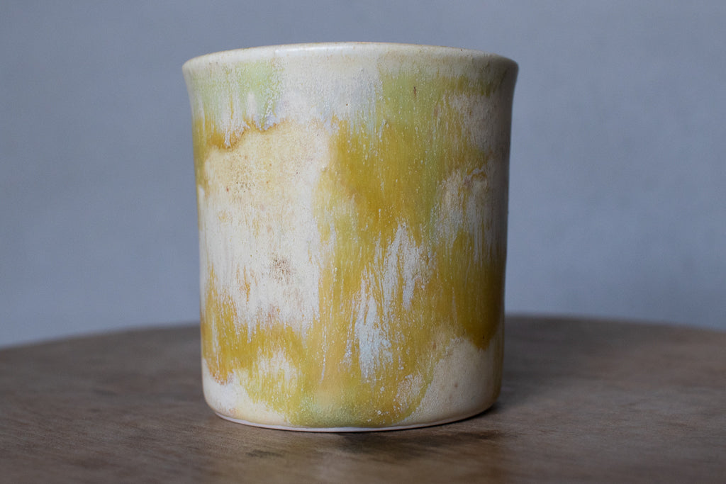 シンプルな筒型のコップです。ぷくっと反り返った口縁がキュート。複雑に重ね掛けられた釉薬の滲み感・垂れ感が素敵です。入荷のたびに色合いが変わるので毎回楽しみなのですが、今回も色とりどりでわくわくするラインナップになっています。