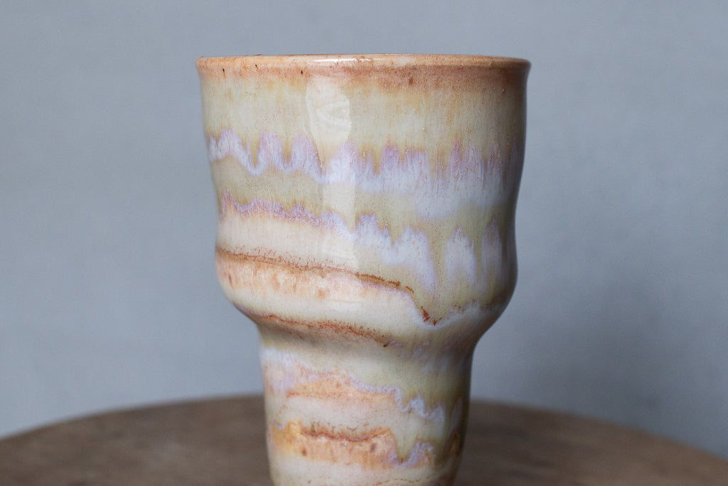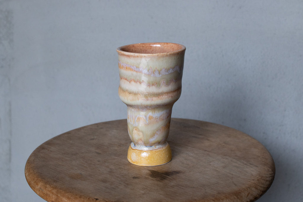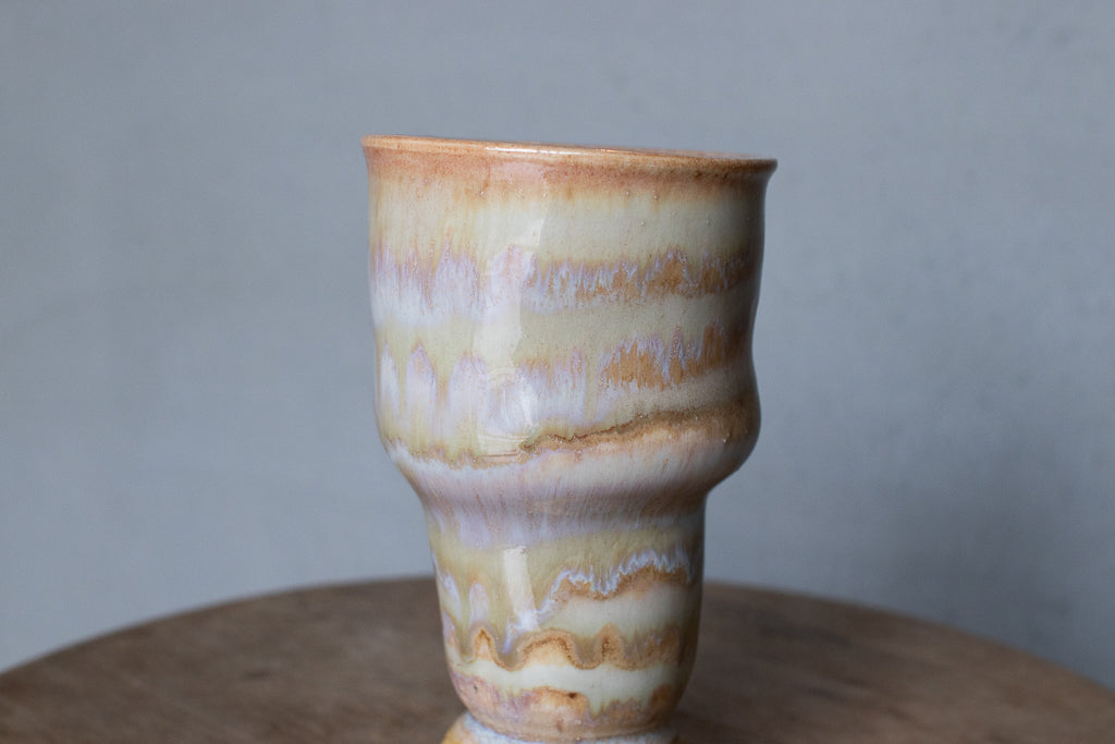 少し傾いたようなシルエットやとろけそうな口縁が愛らしいコップです。複雑に重ね掛けられた釉薬の滲み感・垂れ感が素敵です。入荷のたびに色合いが変わるので毎回楽しみなのですが、今回も色とりどりでわくわくするラインナップになっています。