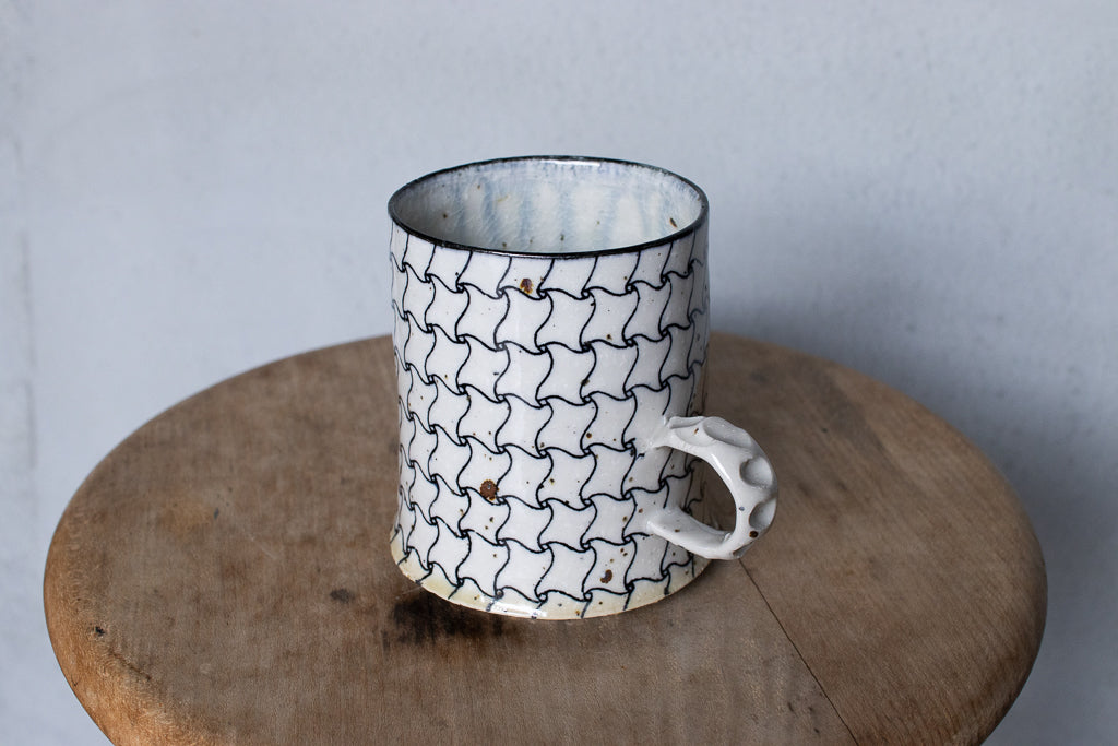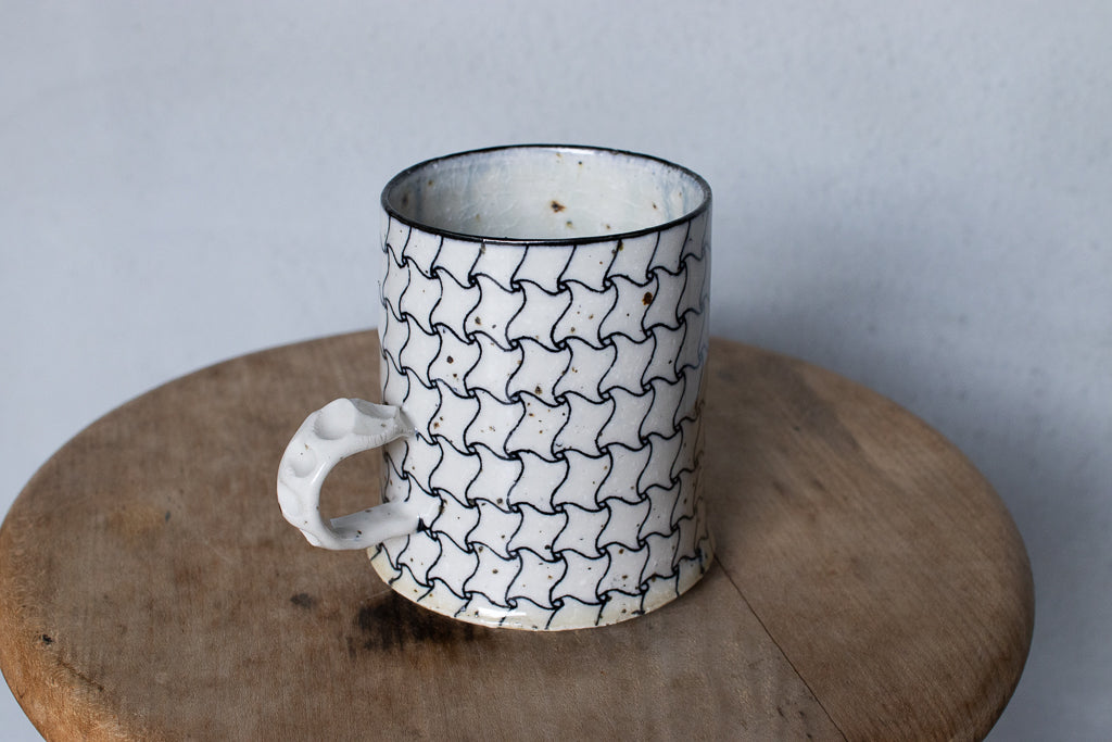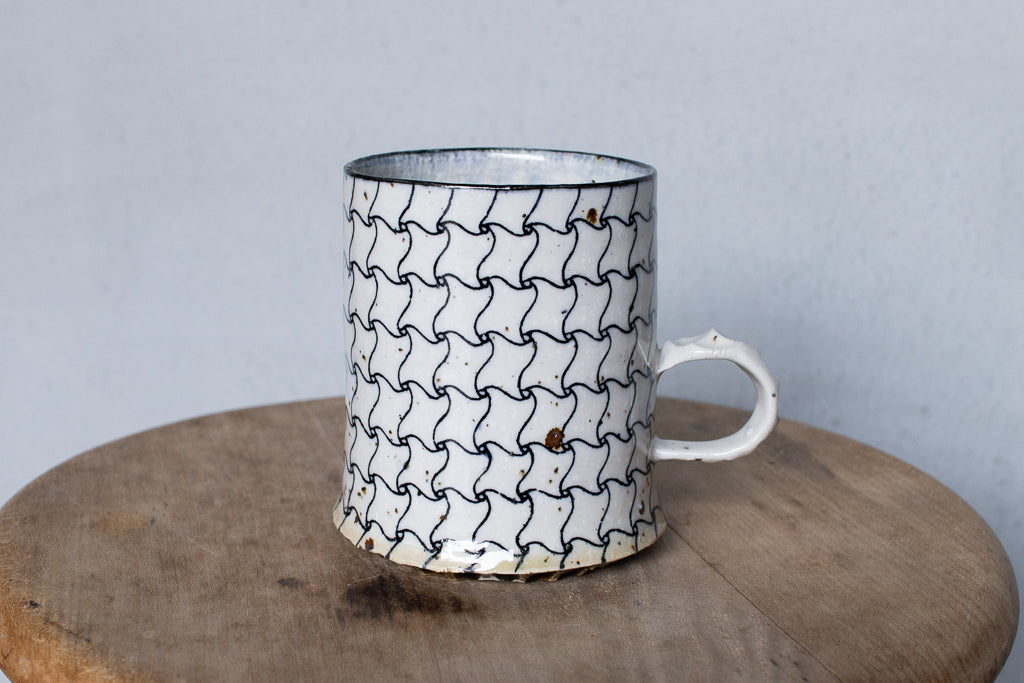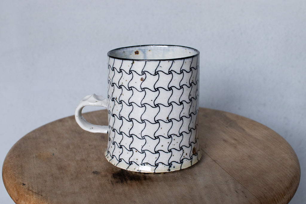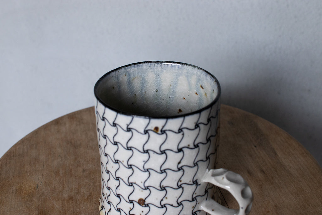 広島の槇原太郎氏の象嵌技法で模様をつけられたマグカップ。槇原さんの代表作です。一本一本の線を手作業で彫り込み、後から別色の泥を流し込み柄を際立たせています。多大な時間をかけ描かれた模様は極めて精緻ですが、しかしはっきりと手仕事の跡も見てとれ、胴やハンドルのほんの一癖ある造形とも相まって他にない魅力を放っています。