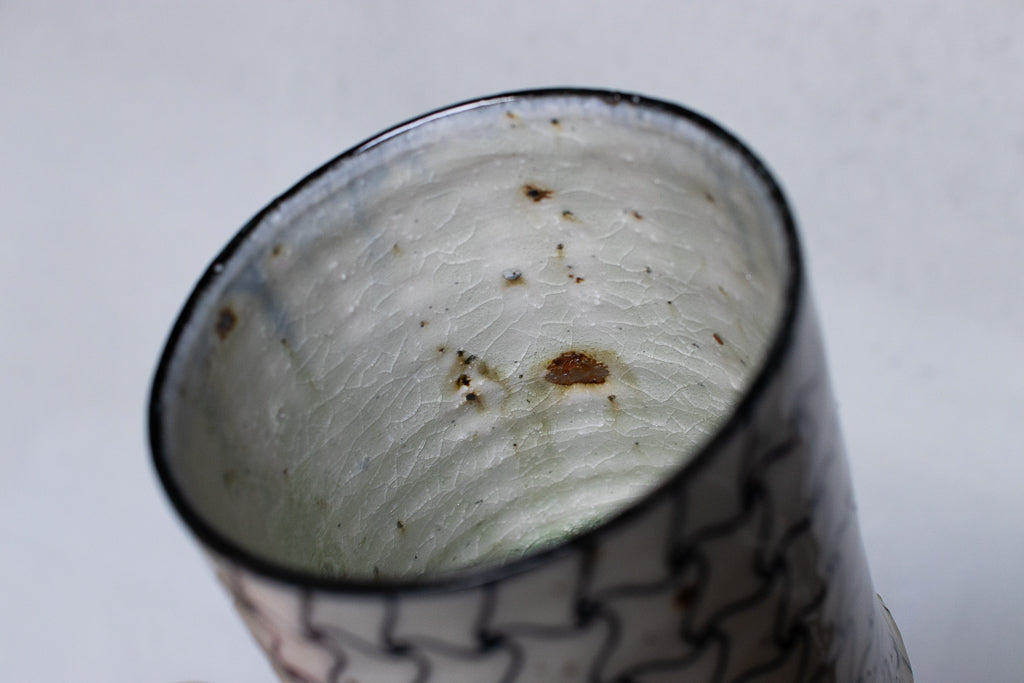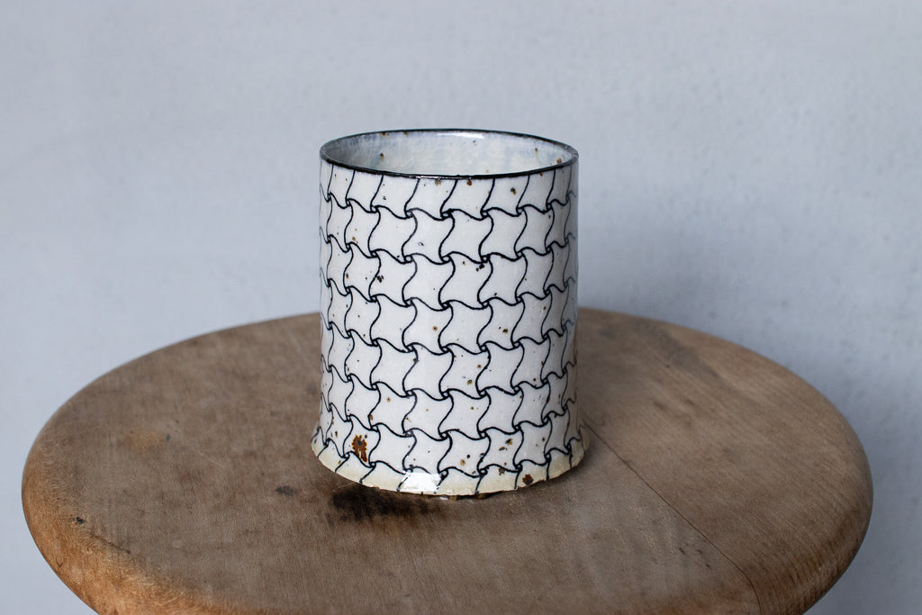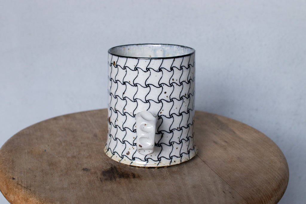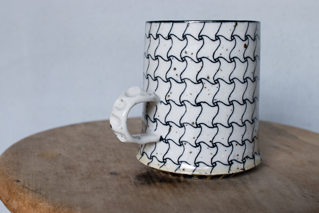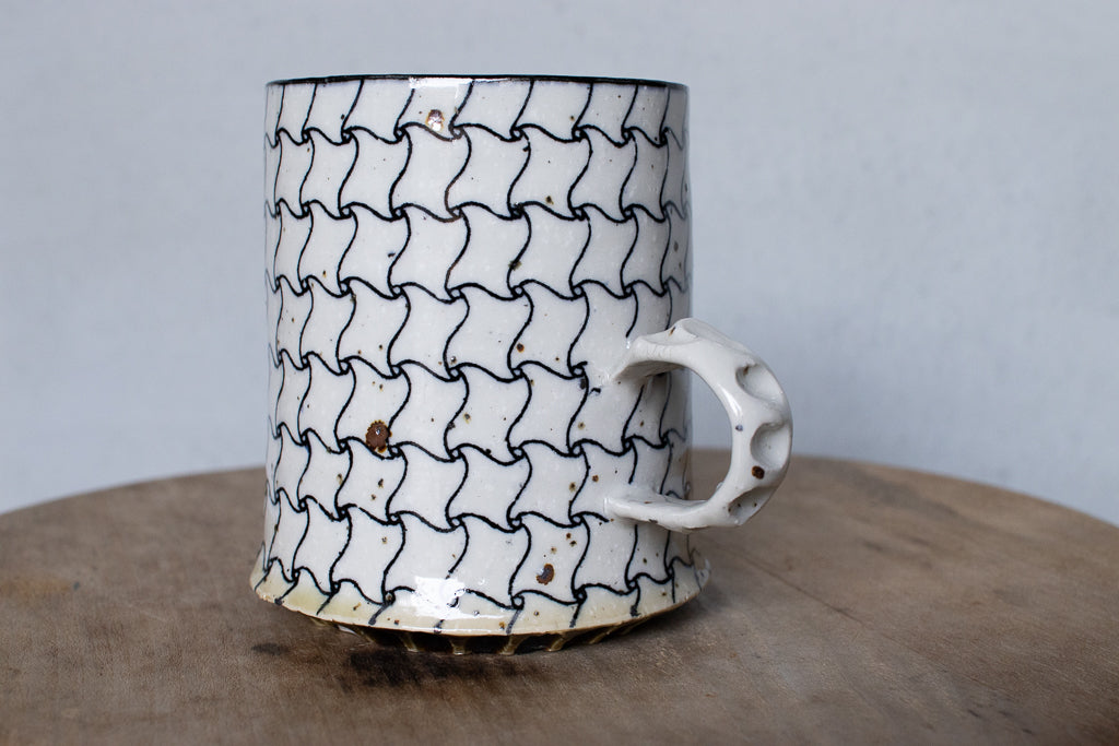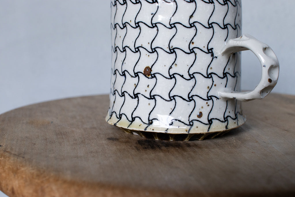 広島の槇原太郎氏の象嵌技法で模様をつけられたマグカップ。槇原さんの代表作です。一本一本の線を手作業で彫り込み、後から別色の泥を流し込み柄を際立たせています。多大な時間をかけ描かれた模様は極めて精緻ですが、しかしはっきりと手仕事の跡も見てとれ、胴やハンドルのほんの一癖ある造形とも相まって他にない魅力を放っています。