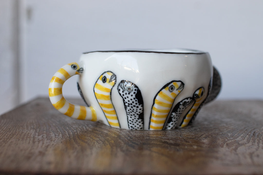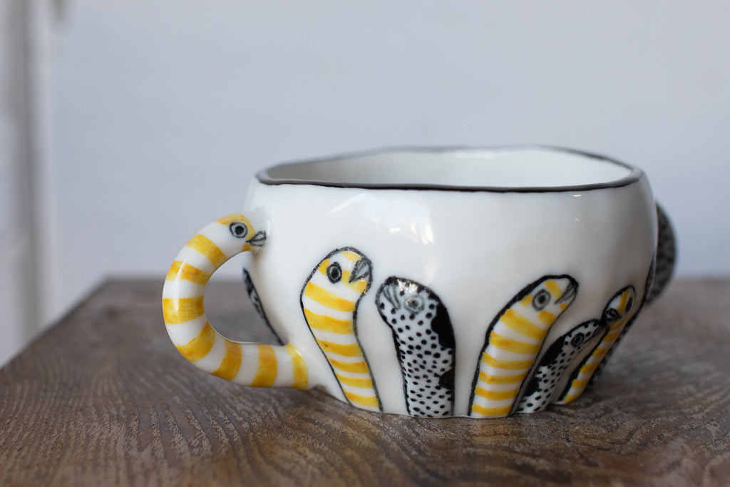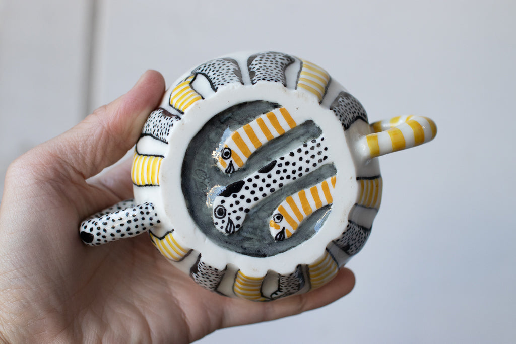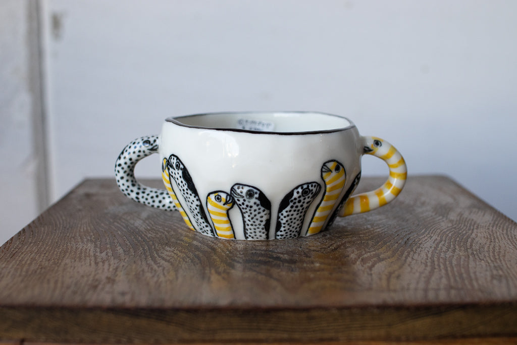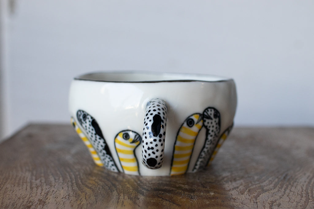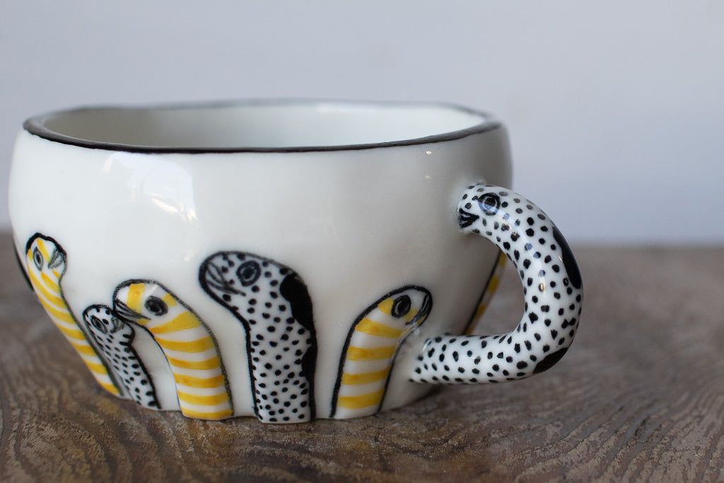手びねりのマグ。描かれたチンアナゴは実に17匹(ハンドルも含めれば19匹)。