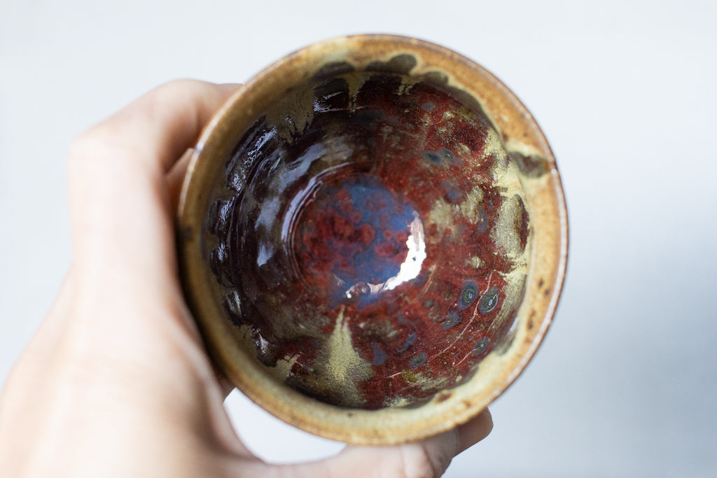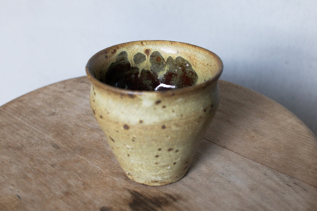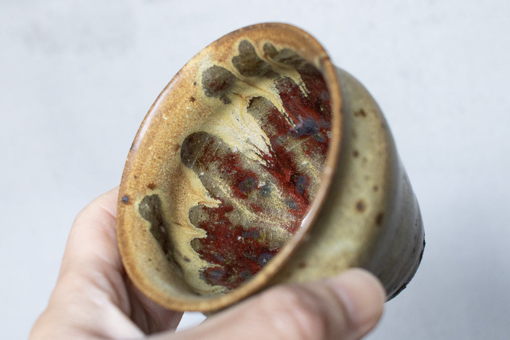 京都の田中大輝さんのチャイカップです。こちらはインドの素焼きのチャイカップを模した作品。本場のものは簡素な素焼きで、一度使ったら飲み捨てたりするらしいですが、それを薪窯焼成するところにタナカさんの遊び心を感じます。黄土色に近い外側の色合いと内側に流されたガラスの釉薬のコントラストが見事。なかなか見ない逸品に仕上がっています。