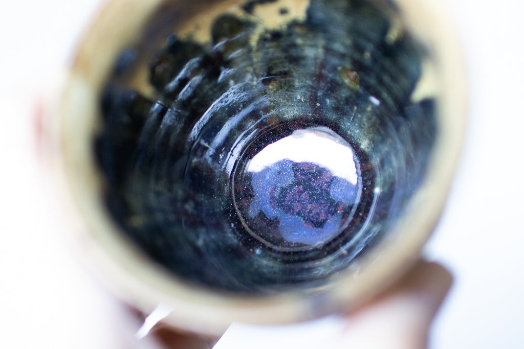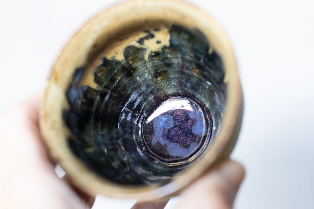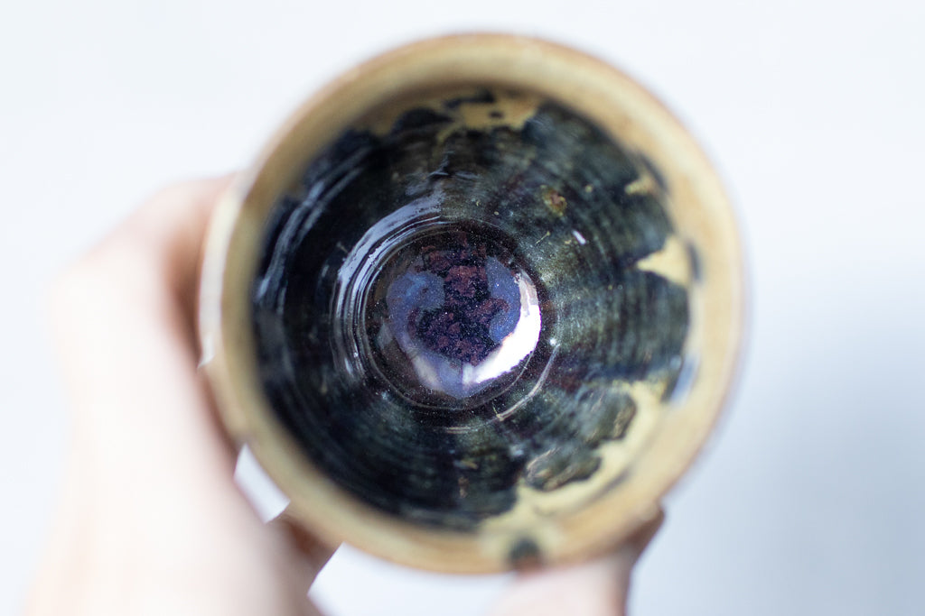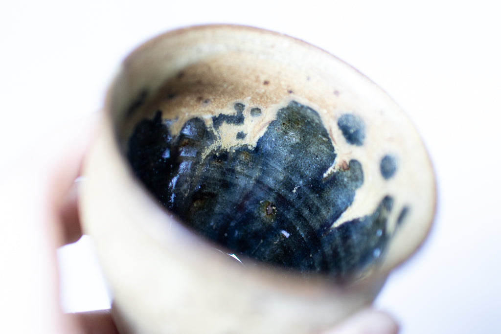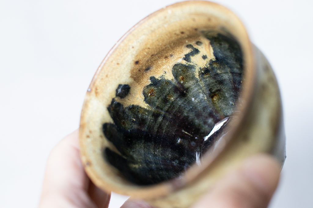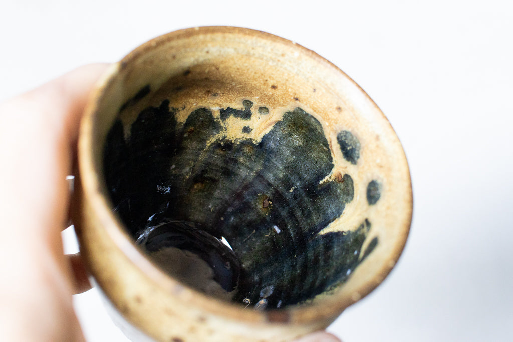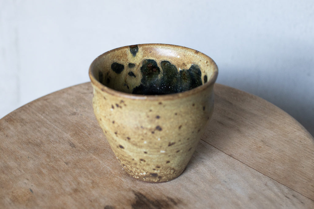 京都の田中大輝さんのチャイカップです。こちらはインドの素焼きのチャイカップを模した作品。本場のものは簡素な素焼きで、一度使ったら飲み捨てたりするらしいですが、それを薪窯焼成するところにタナカさんの遊び心を感じます。黄土色に近い外側の色合いと内側に流されたガラスの釉薬のコントラストが見事。なかなか見ない逸品に仕上がっています。