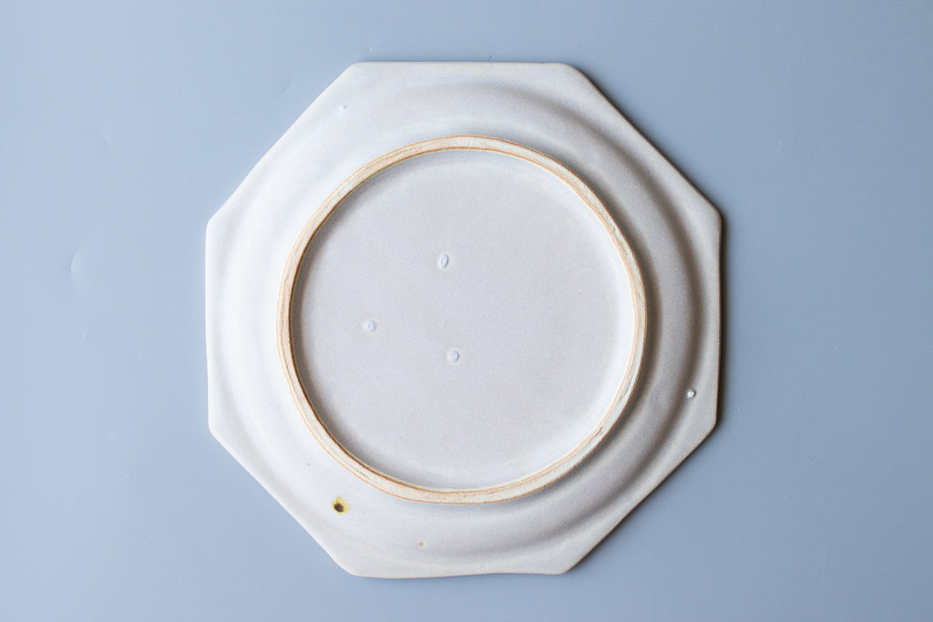 京都の田中大輝さんの八角皿 約8寸のサイズです。見込みはやや深さがあるので、汁気のある料理もしっかり盛り付け可能です。炒飯や焼きそばなど簡素な料理を盛っても見栄えが良いですよ。すべすべの白い磁土に美しいガラス釉が映えて非常にインパクトの強い作品に仕上がっています。