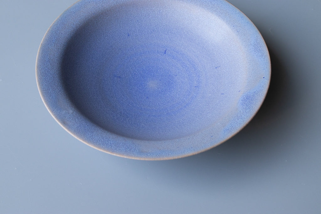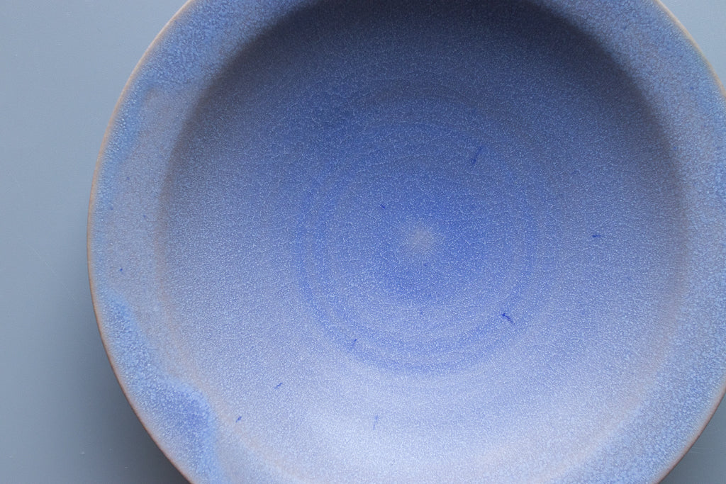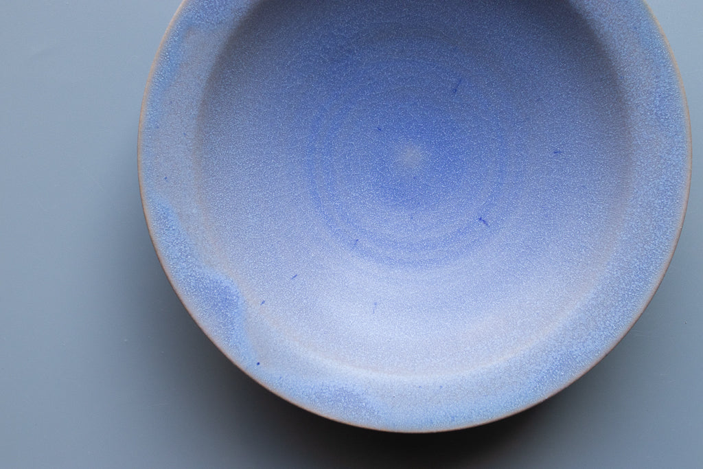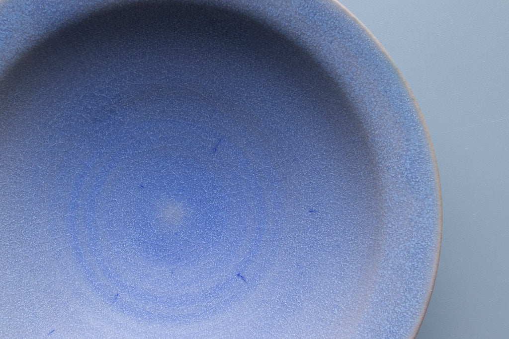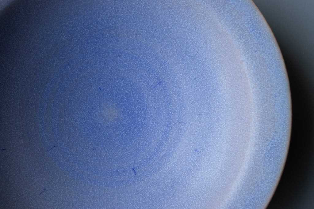 薄く透け感のある青。釉薬がよく流れており、上から下にかけて薄いところと厚めに溜まって結晶化しているところがあって綺麗です。