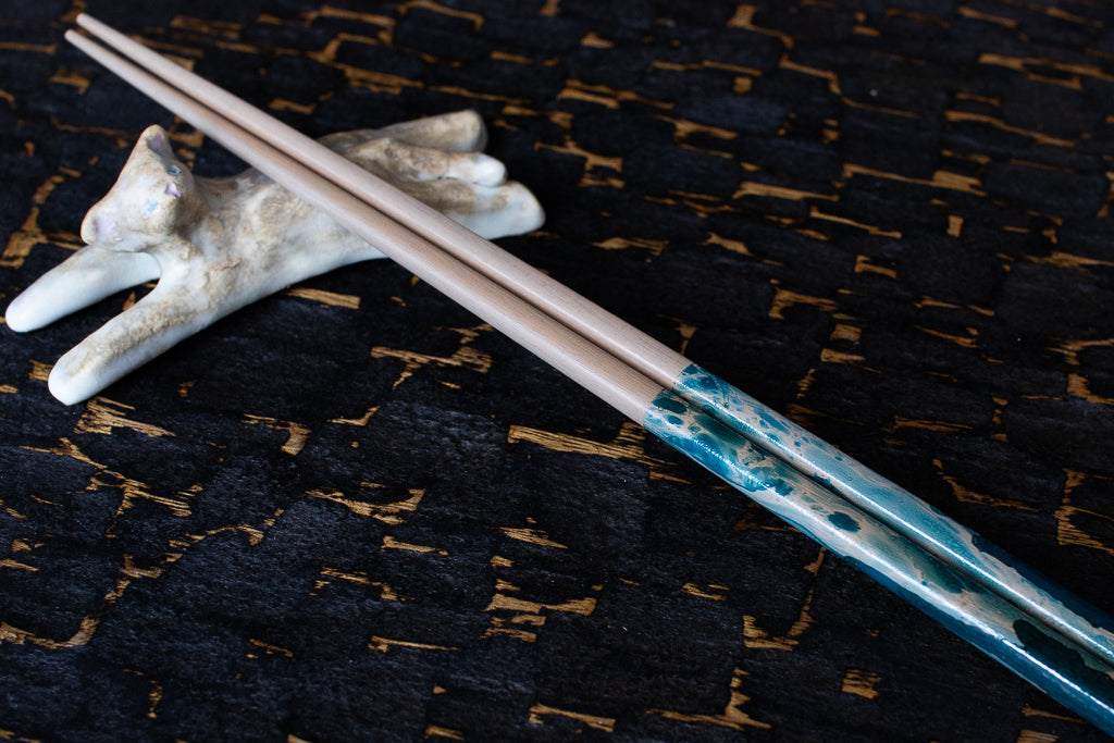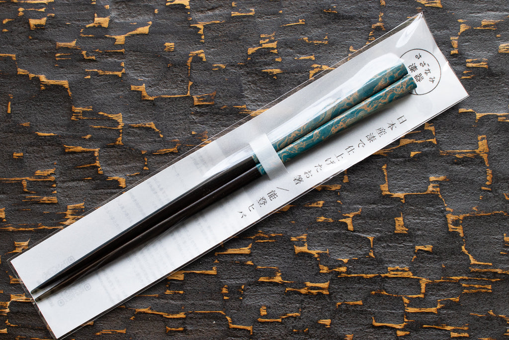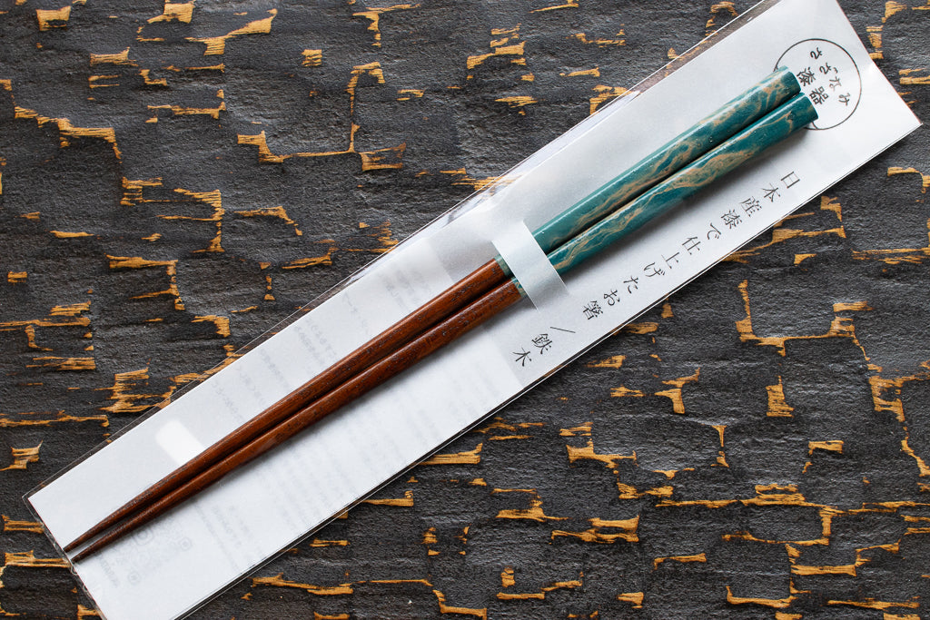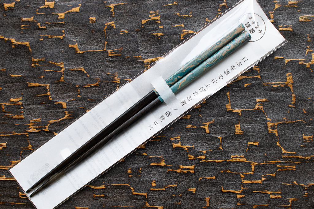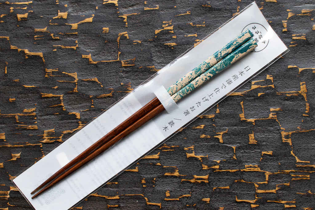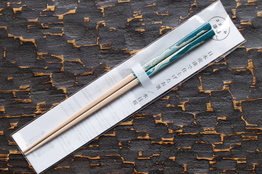 天然木のベースに何度も漆を塗り込んだお箸です。木の素地に見える部分も漆で拭き上げられており、非常に手の込んだ作品です。普通のお箸より長くお使い頂けると思います。木の種類も色々、”墨流し”の技法で仕上げられた柄の部分の表情は一点一点異なりますので、気に入ったものをお選びください。