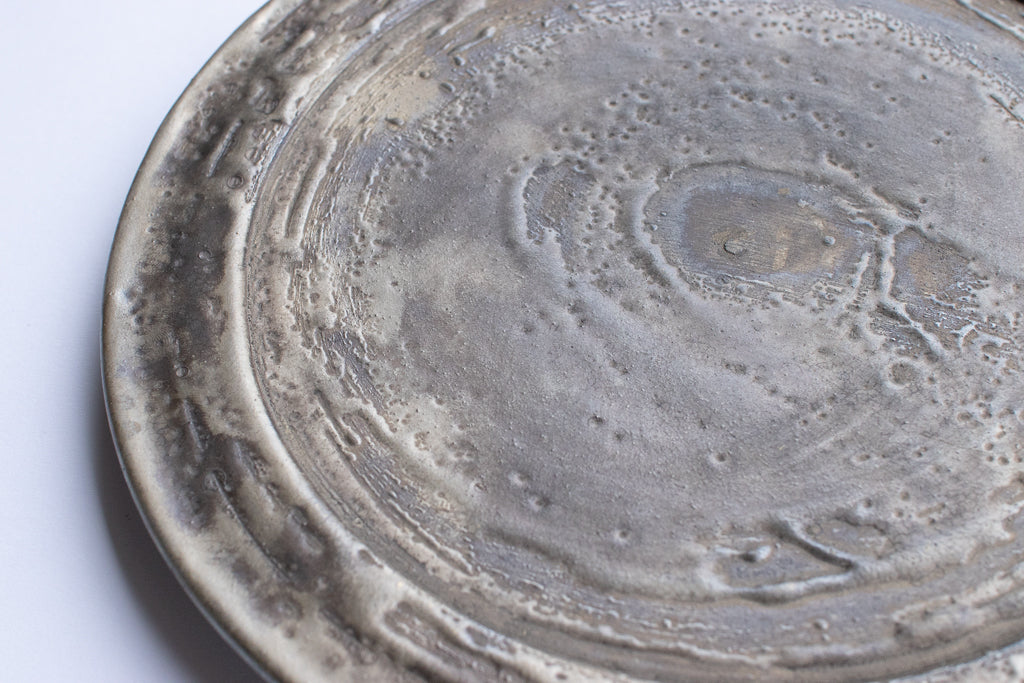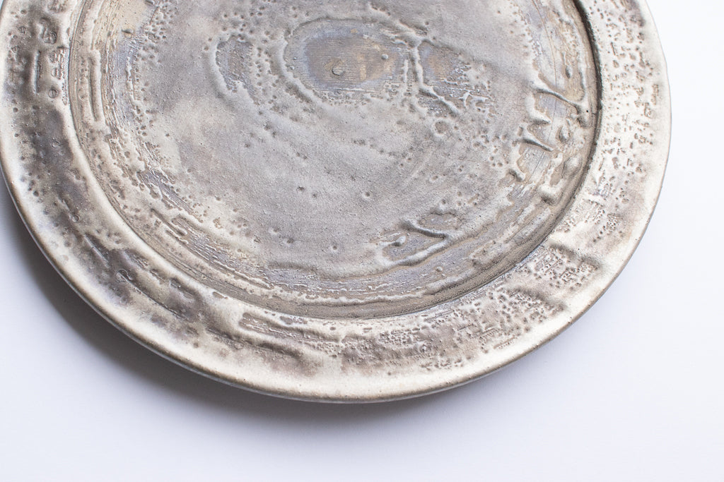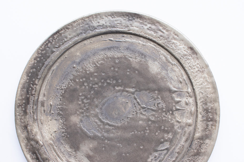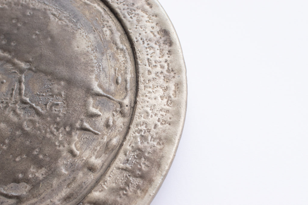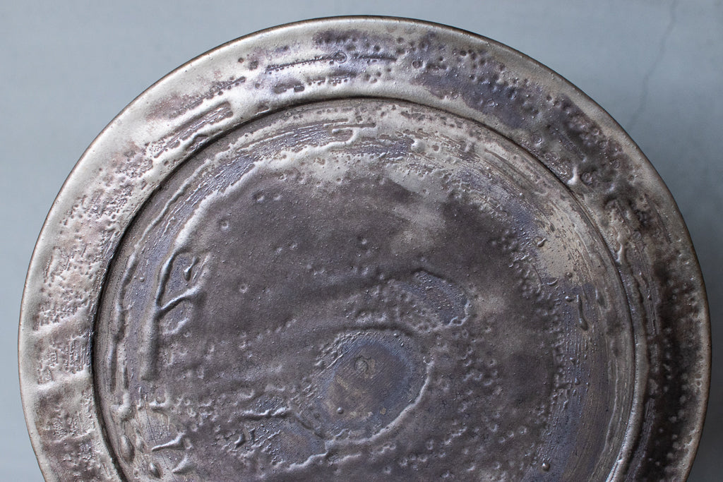 広島の芳賀稔氏の銀彩のプレートです。動きのある表情が非常に格好良い作品です。銀ならではの、時間経過とともに風合いが変化するさまをお楽しみいただけます。