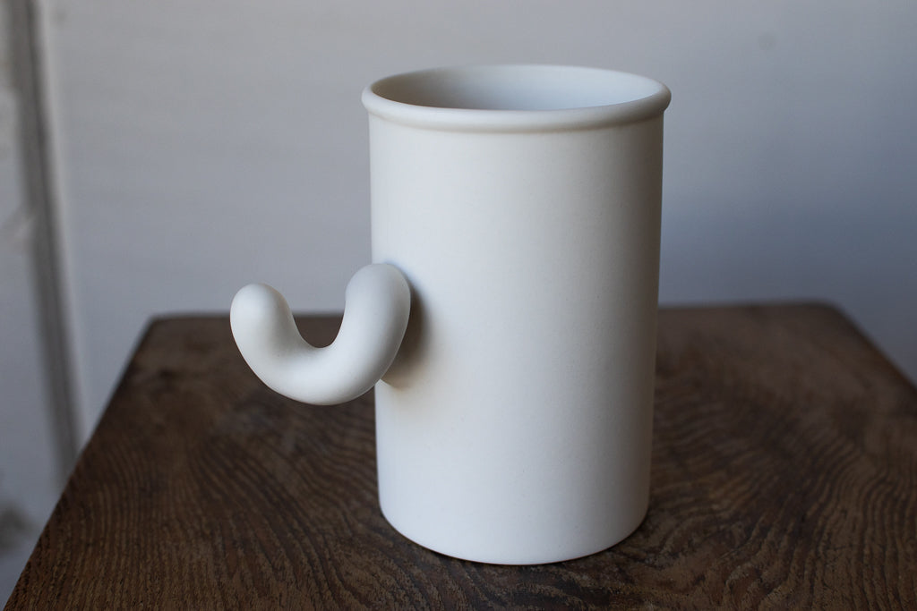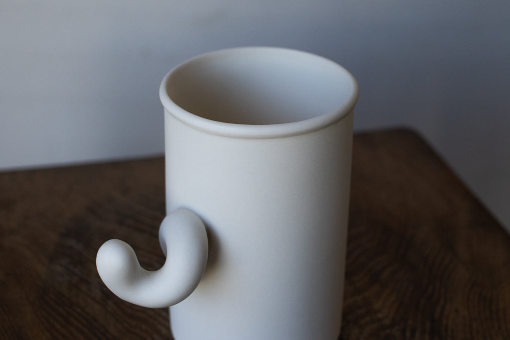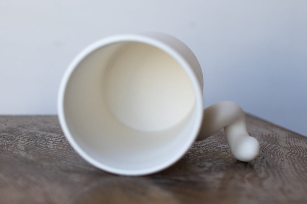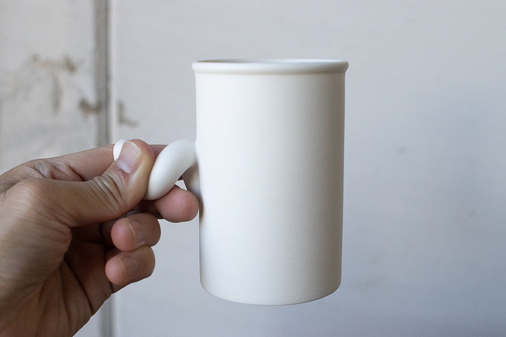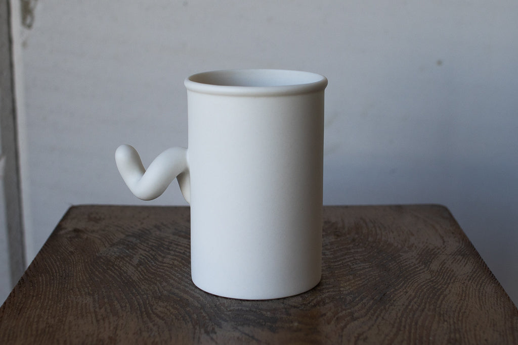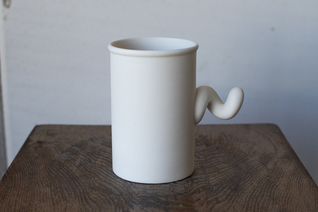 Sマグと呼ばれるにょろにょろしたハンドルが特徴的なカップ。握手するように握り込んで見てください。何度か試すとしっくりくる角度が見つかるはずです。