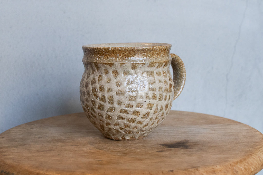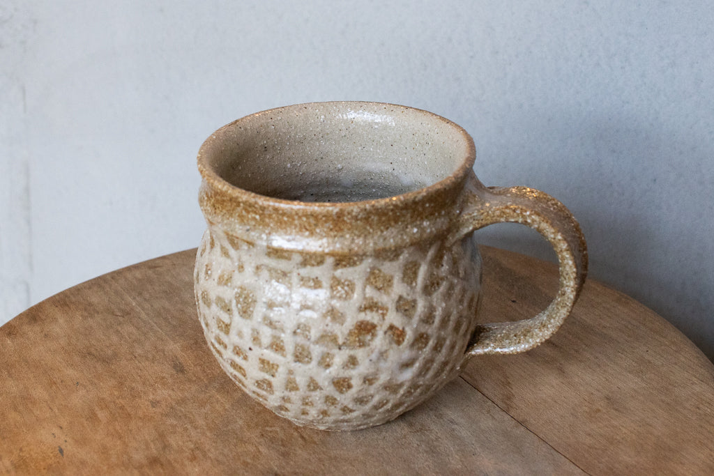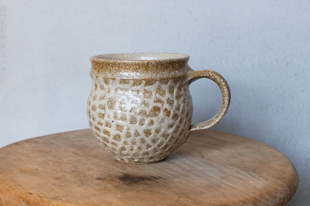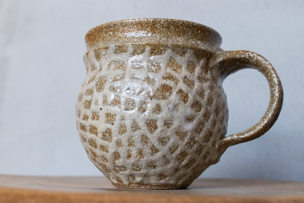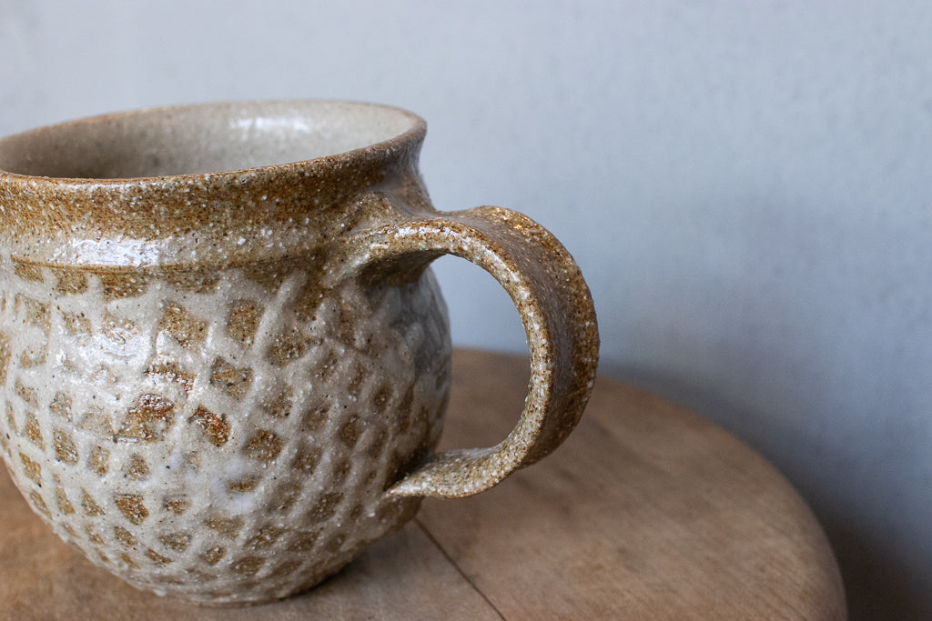 西川真衣さんのマグカップ。まるっこいフォルムと渋い表情が良いバランスです。イッチン技法によって細くランダムな文様を表現しています。