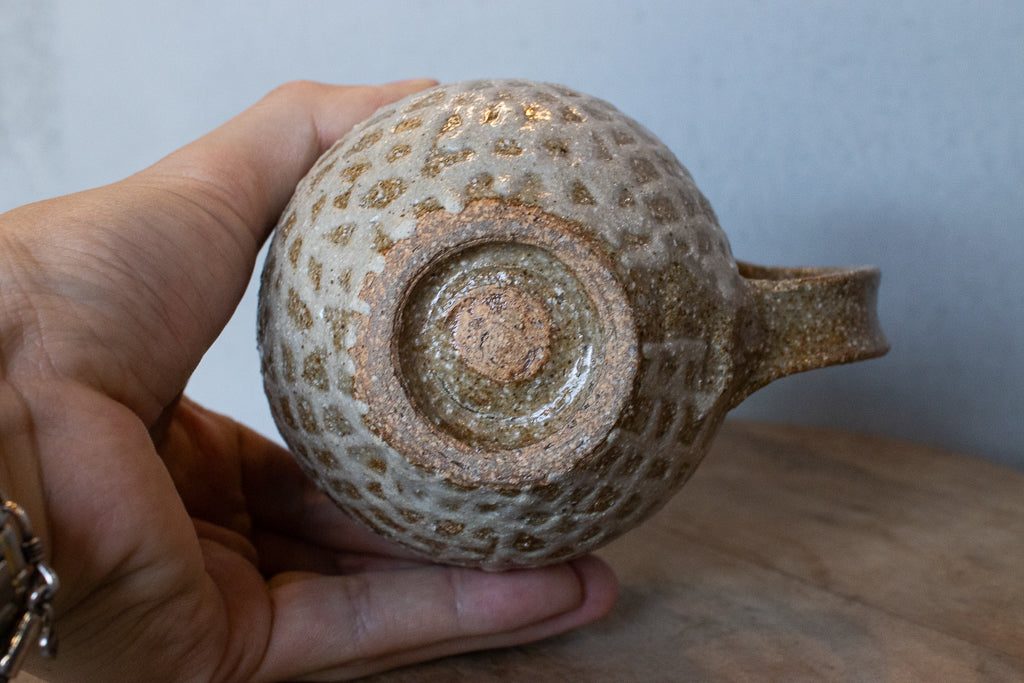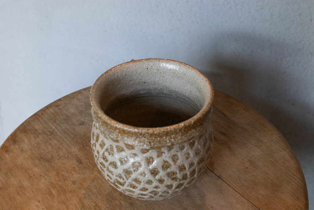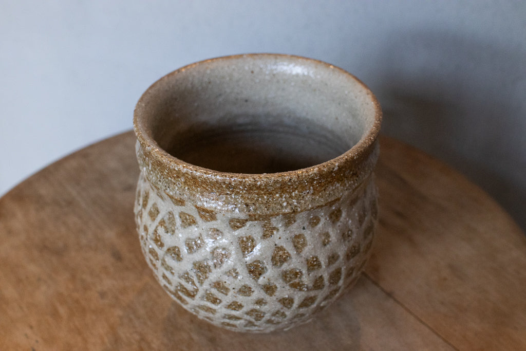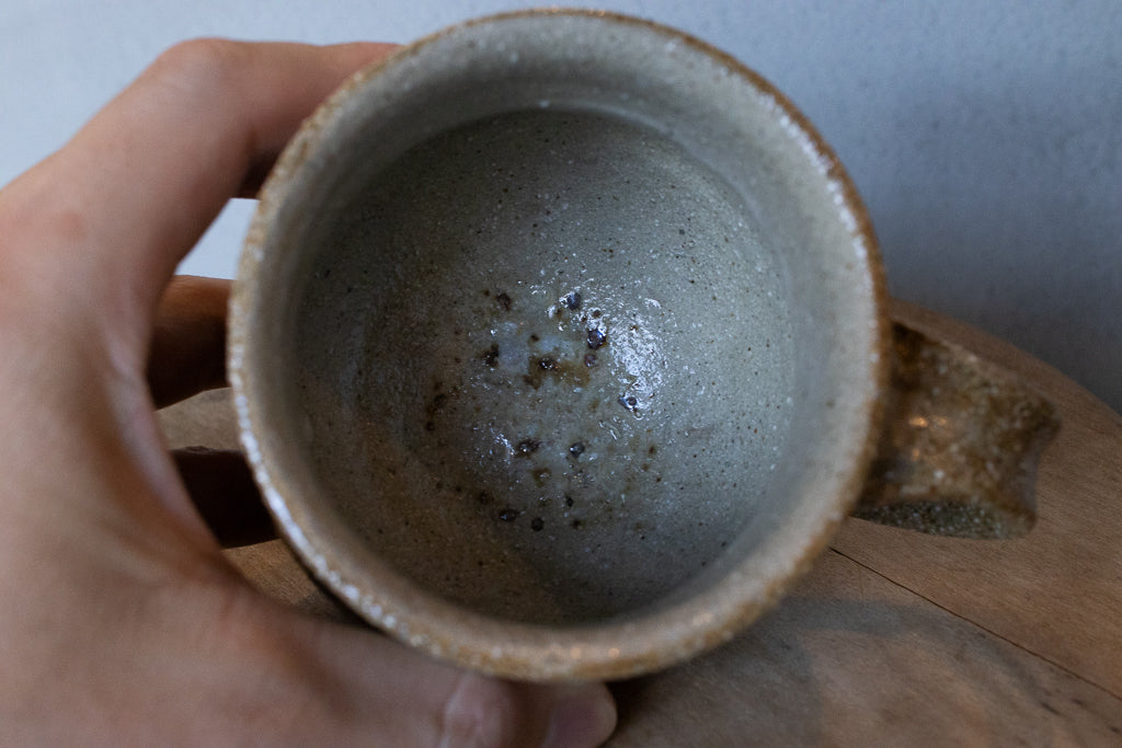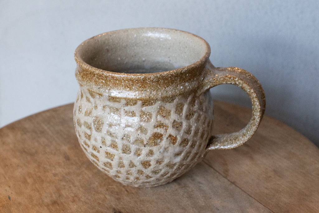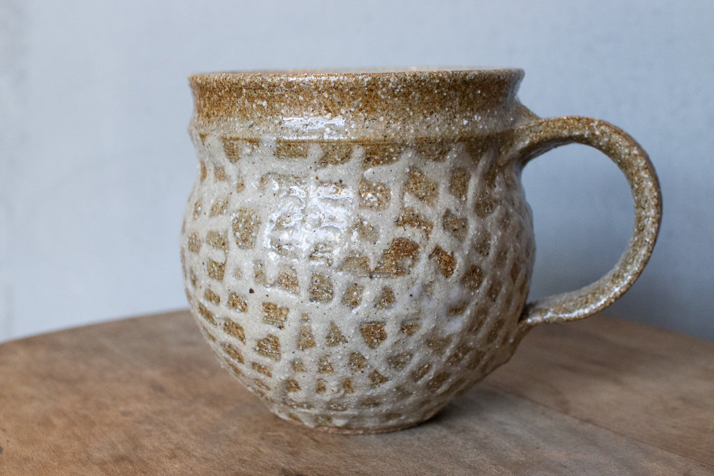 西川真衣さんのマグカップ。まるっこいフォルムと渋い表情が良いバランスです。イッチン技法によって細くランダムな文様を表現しています。