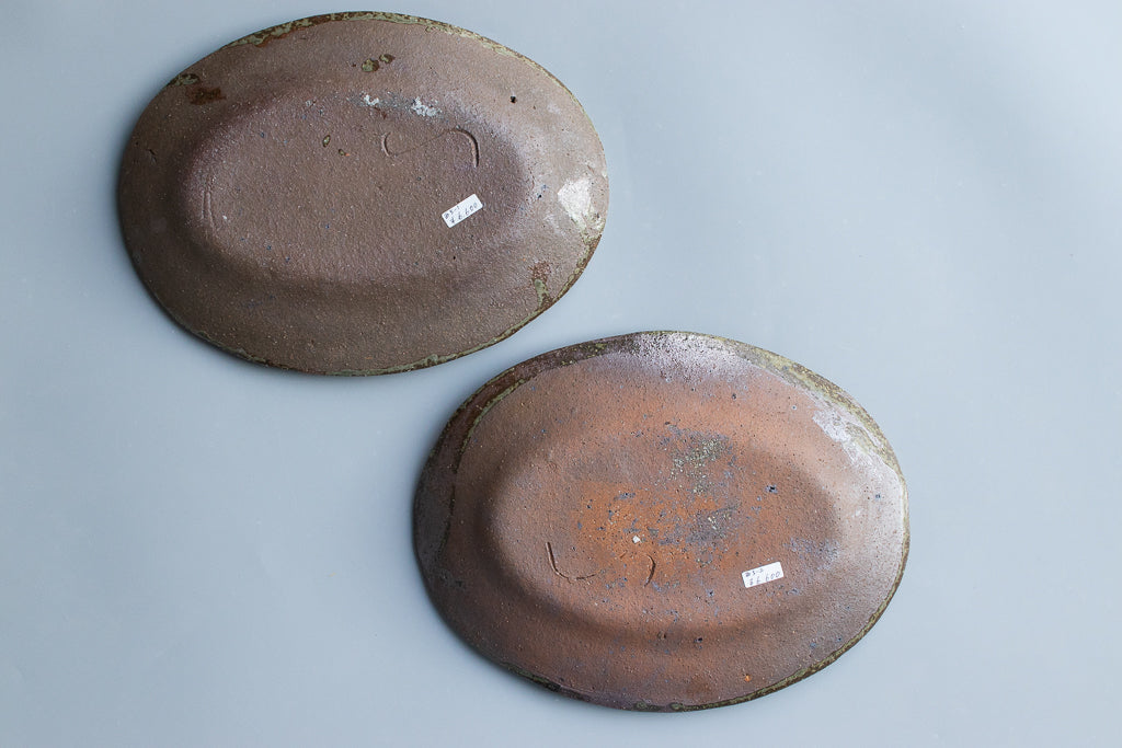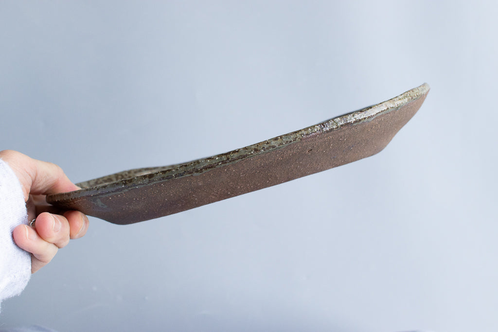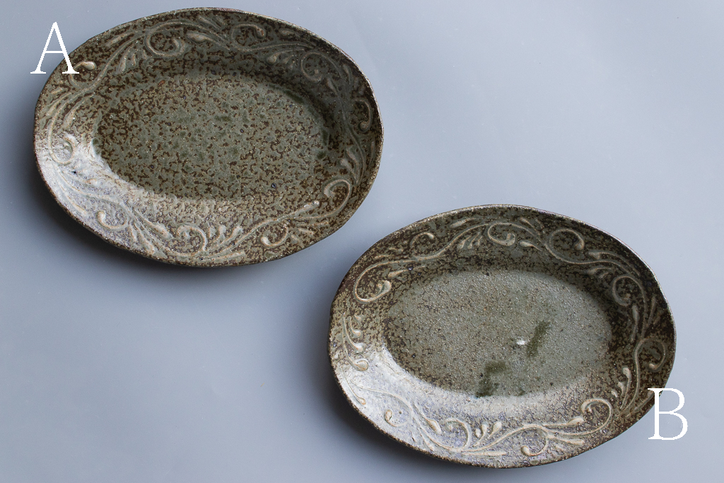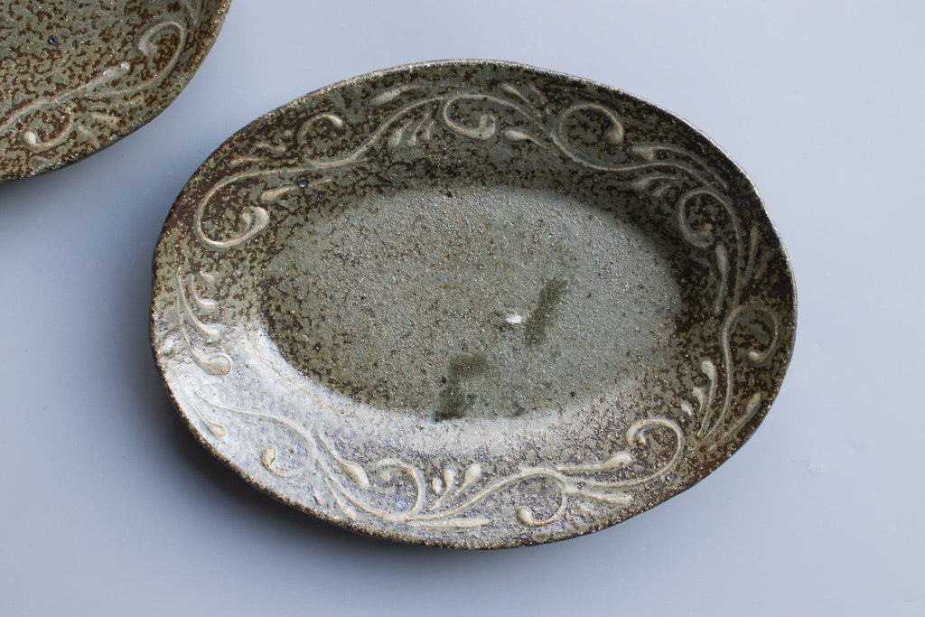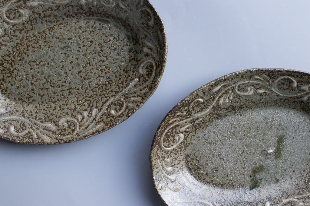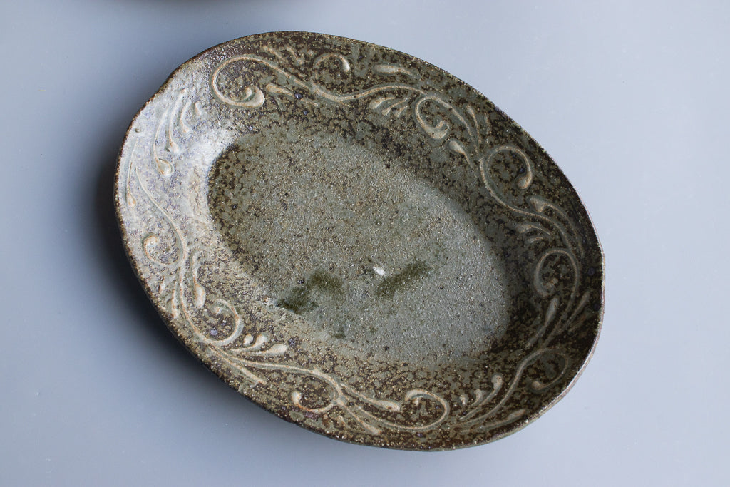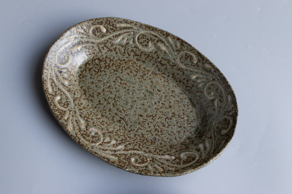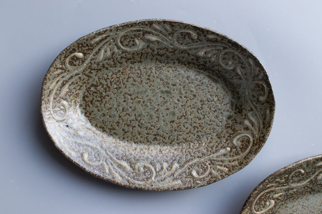 西川真衣さんのオーバル皿 大サイズです。メイン料理でも1人分のワンプレート飯でもなんでも受け止めてくれそうなサイズ感。オリーブグリーンの渋い色合いにイッチンで施された唐草柄がキュート。渋くてかわいい作品です。