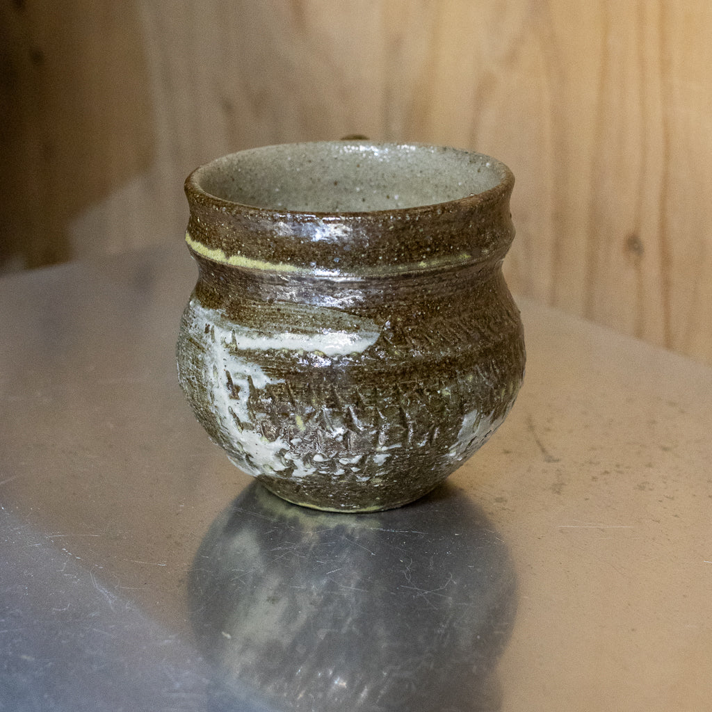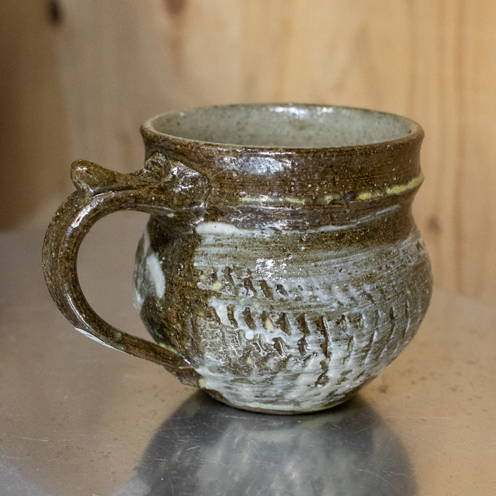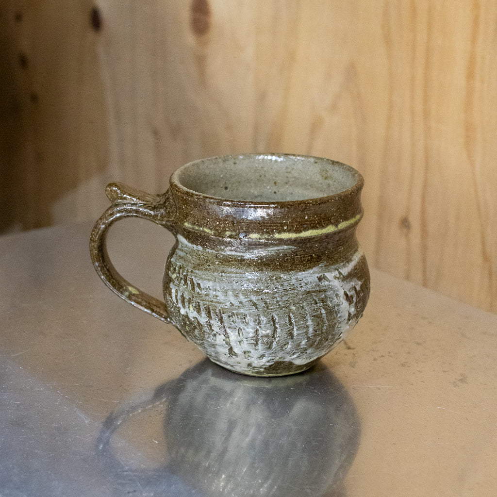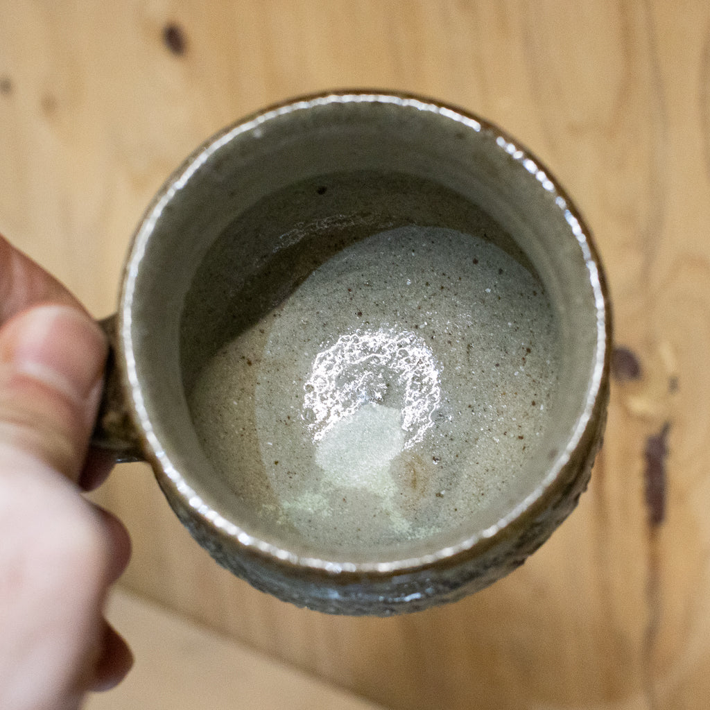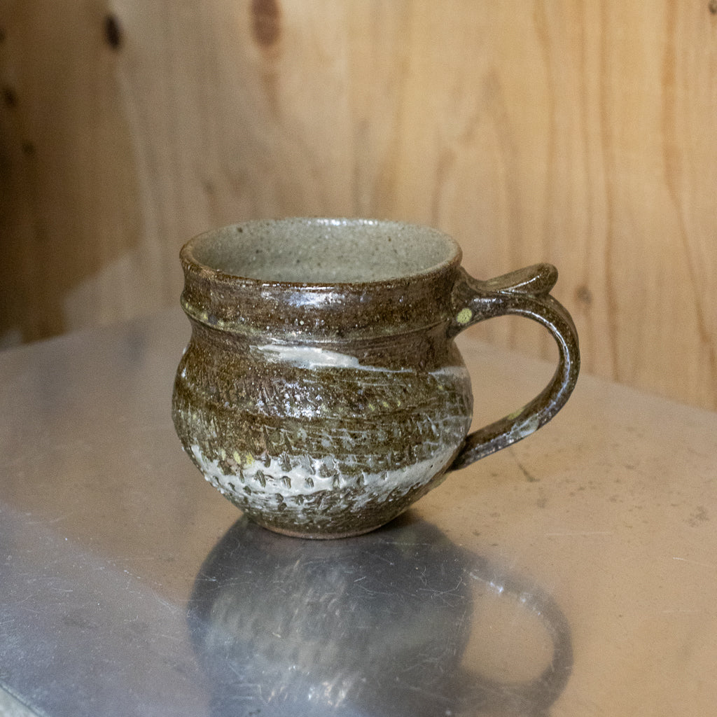 西川真衣さんのマグカップ。西川さんお得意のまるっこいフォルムと渋い表情が良いバランスです。飛び鉋と刷毛目の装飾が光ります。原始的な雰囲気をまとった格好良い作品。