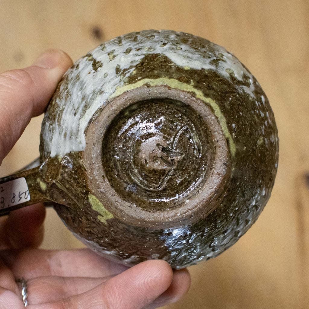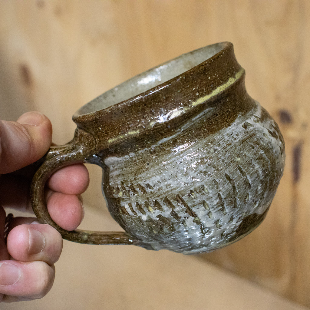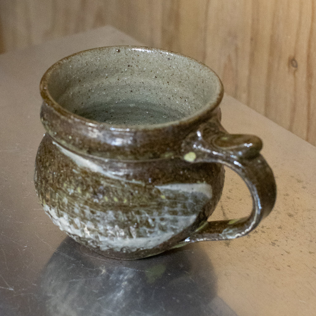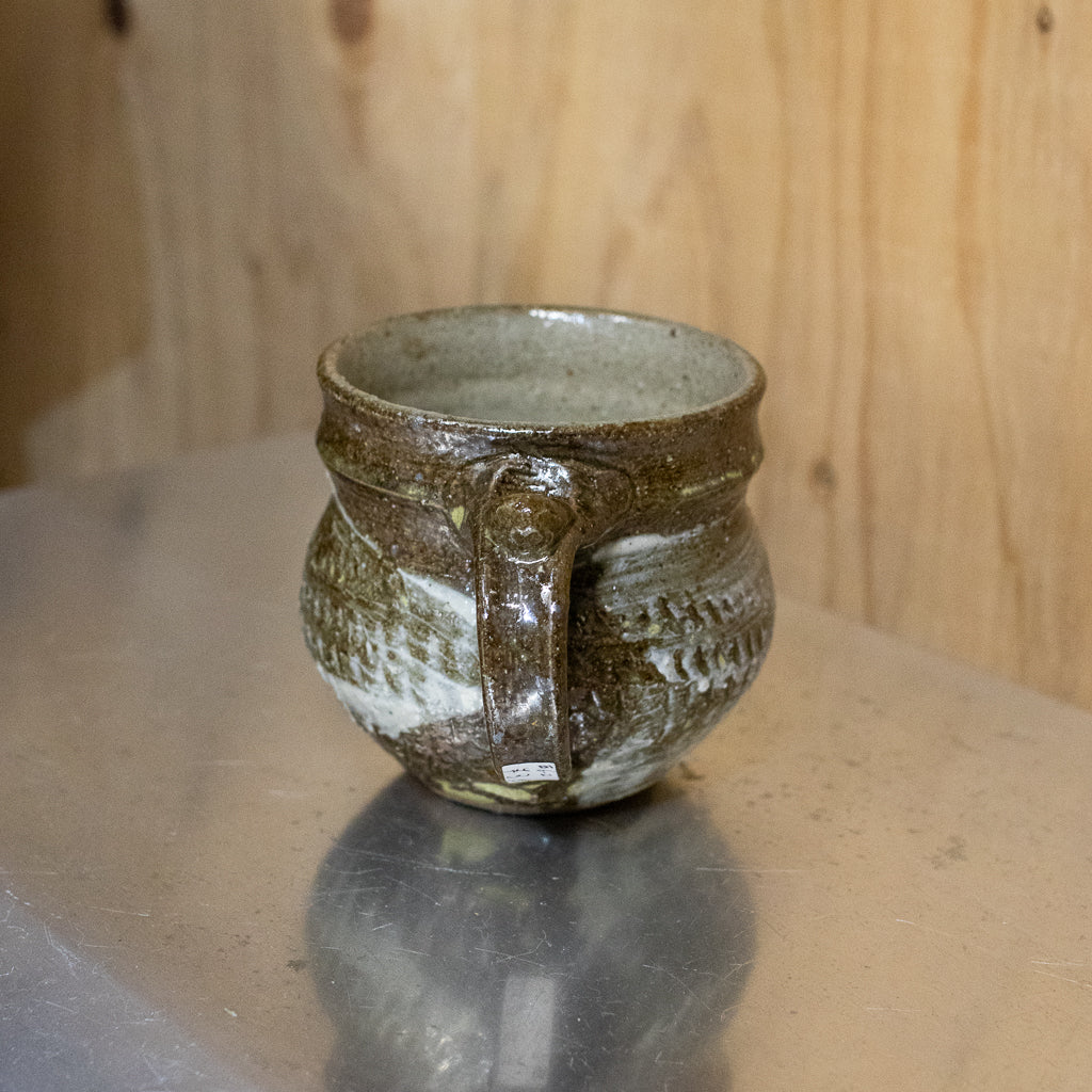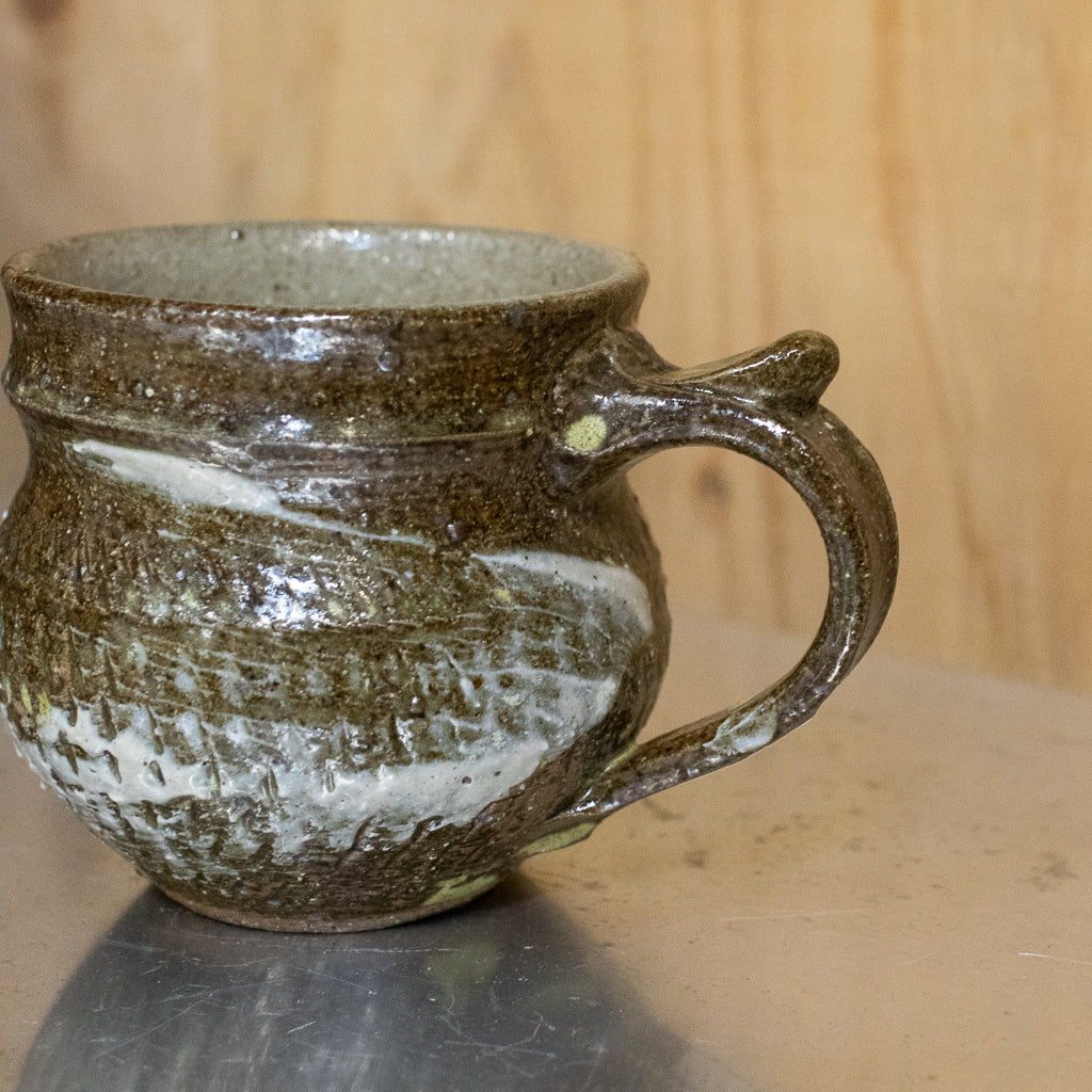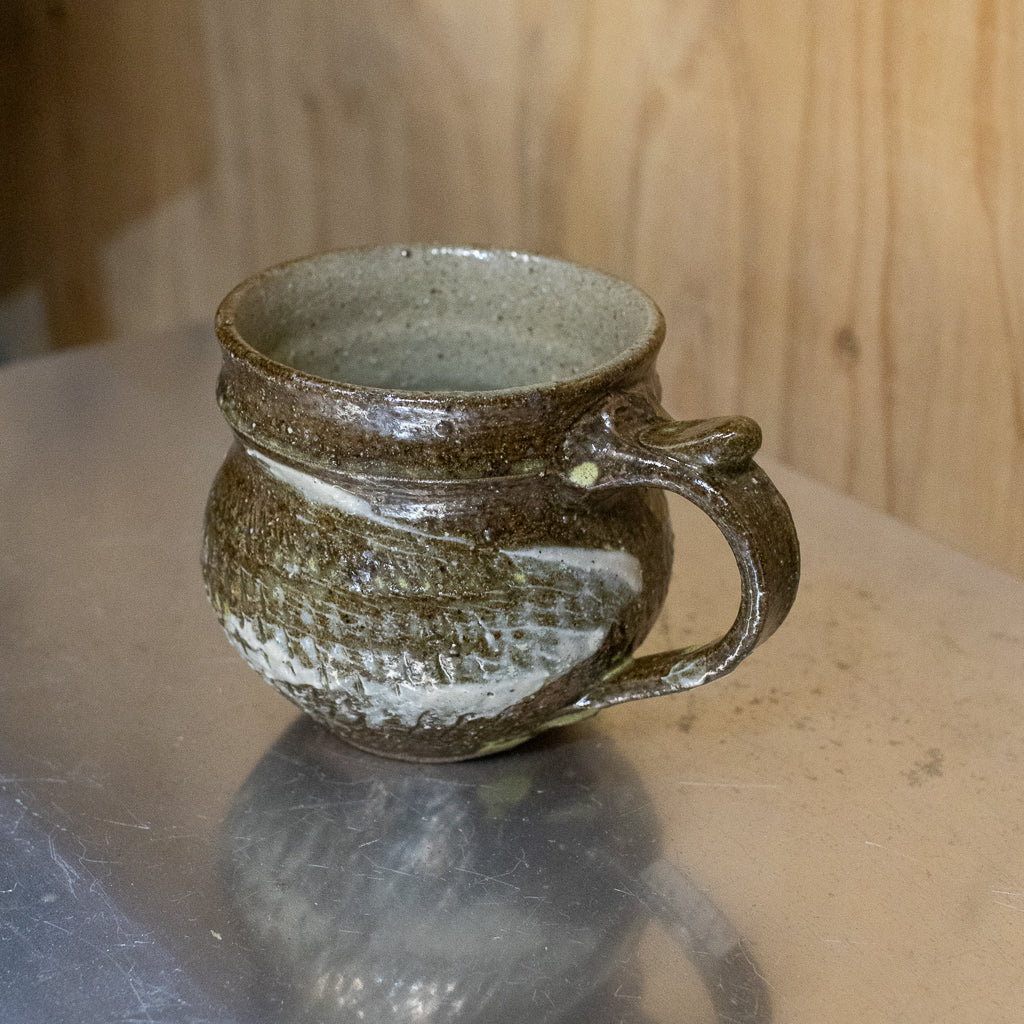 西川真衣さんのマグカップ。西川さんお得意のまるっこいフォルムと渋い表情が良いバランスです。飛び鉋と刷毛目の装飾が光ります。原始的な雰囲気をまとった格好良い作品。
