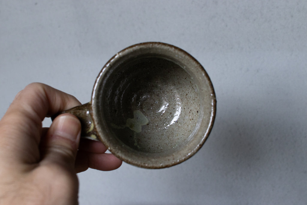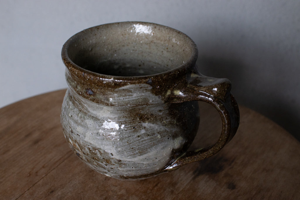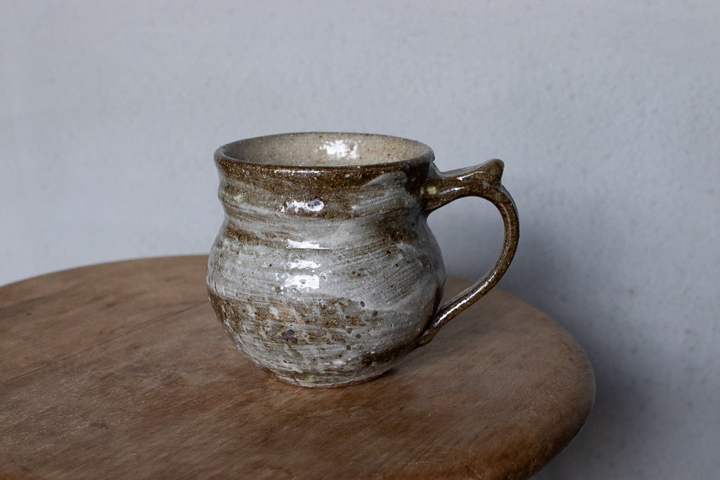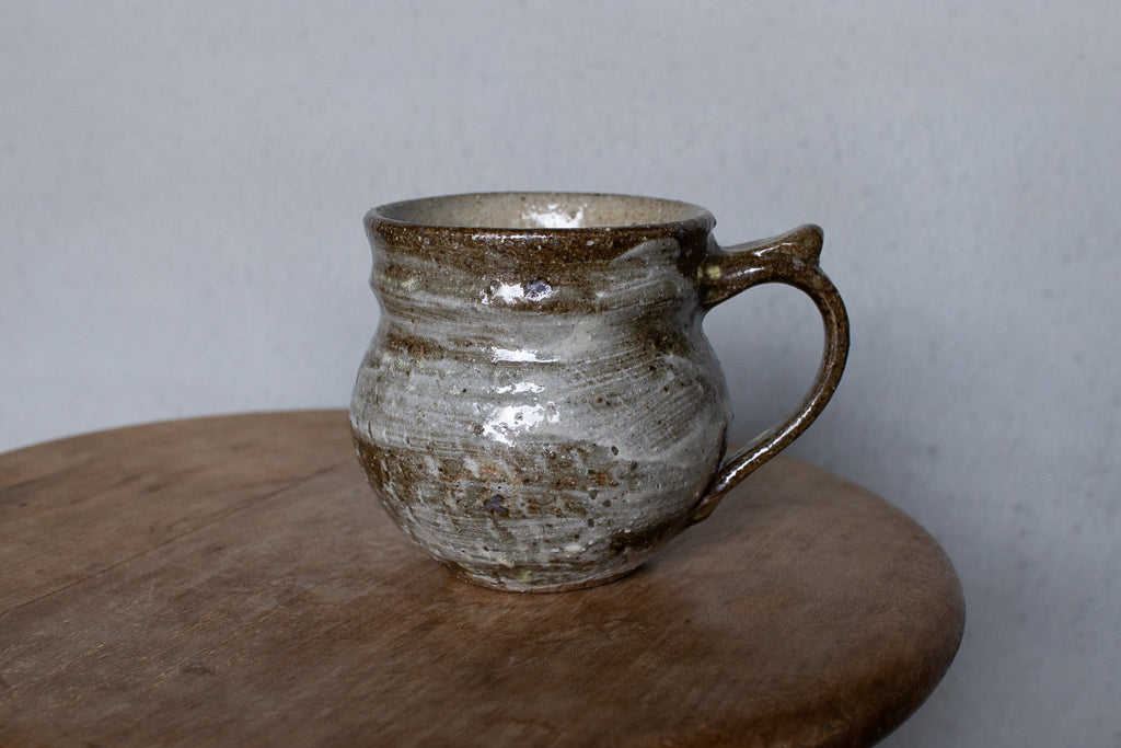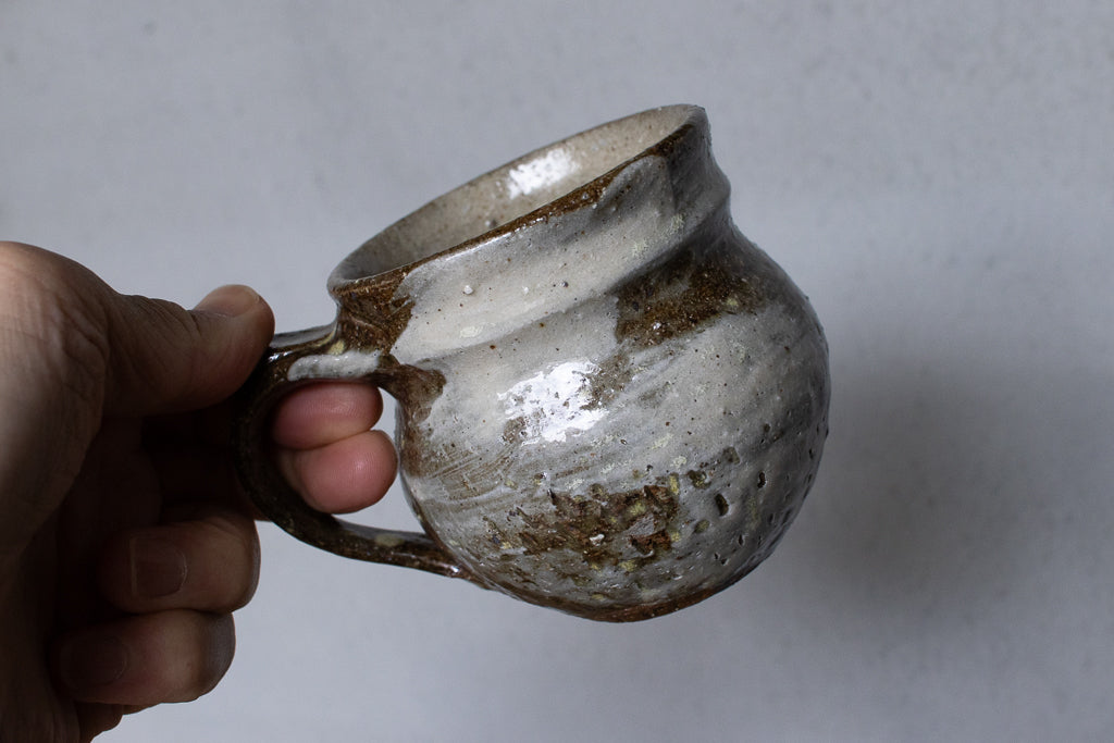 西川真衣さんのマグカップ。西川さんお得意のまるっこいフォルムと渋い表情が良いバランスです。飛び鉋と刷毛目の装飾が光ります。原始的な雰囲気をまとった格好良い作品。