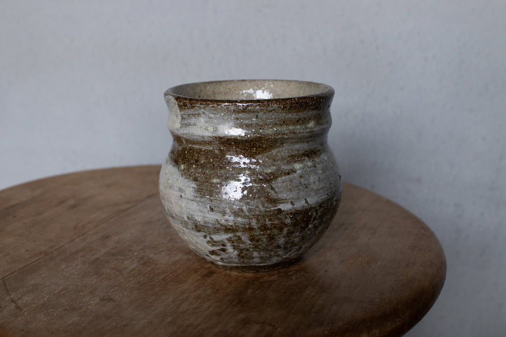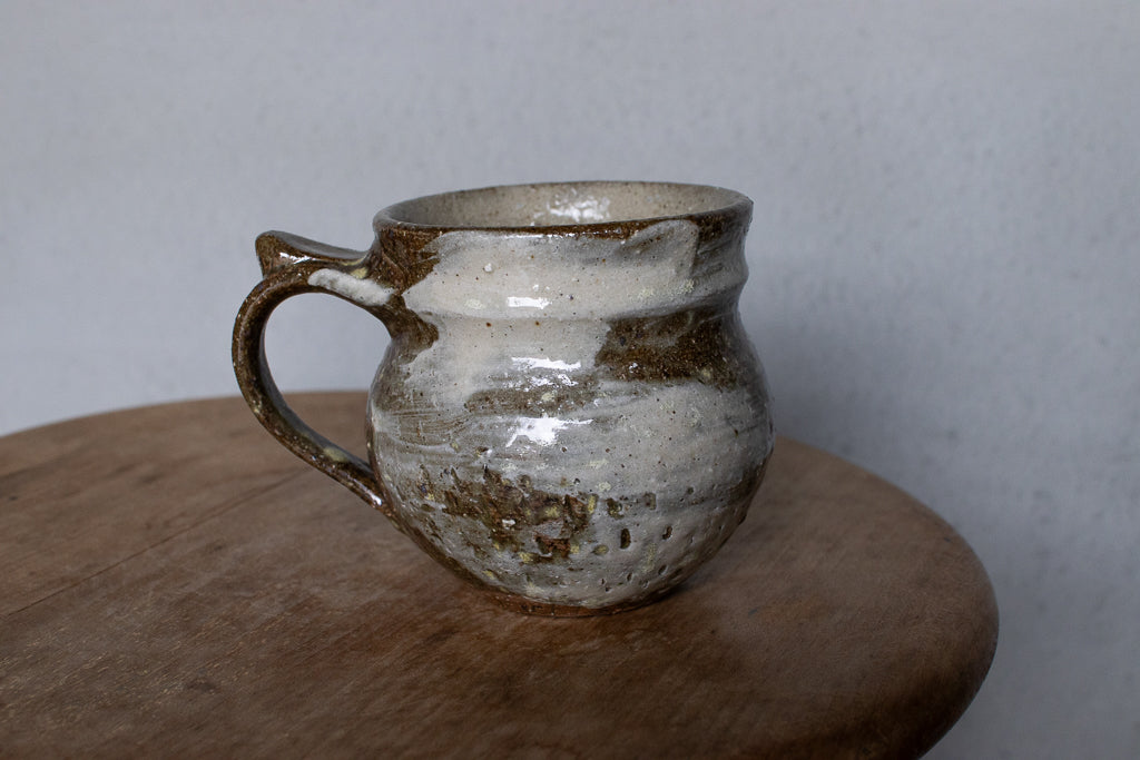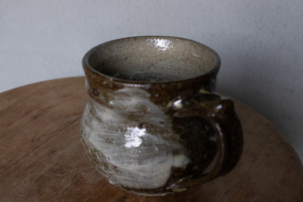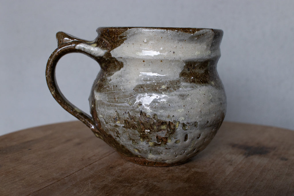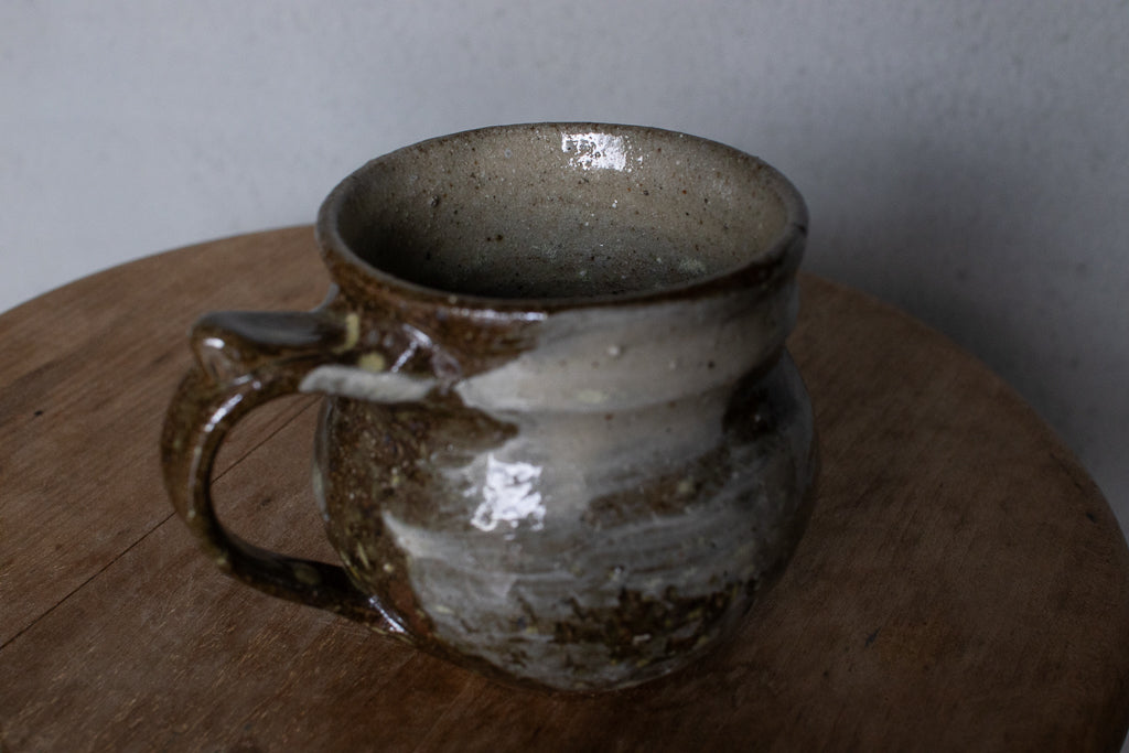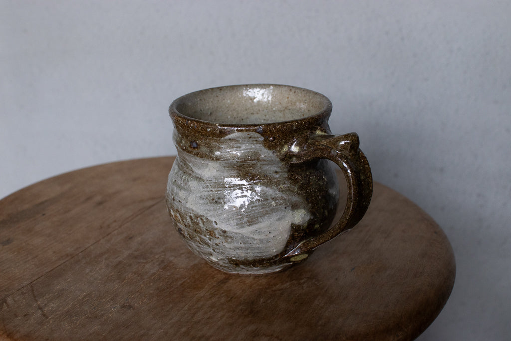 西川真衣さんのマグカップ。西川さんお得意のまるっこいフォルムと渋い表情が良いバランスです。飛び鉋と刷毛目の装飾が光ります。原始的な雰囲気をまとった格好良い作品。