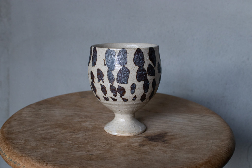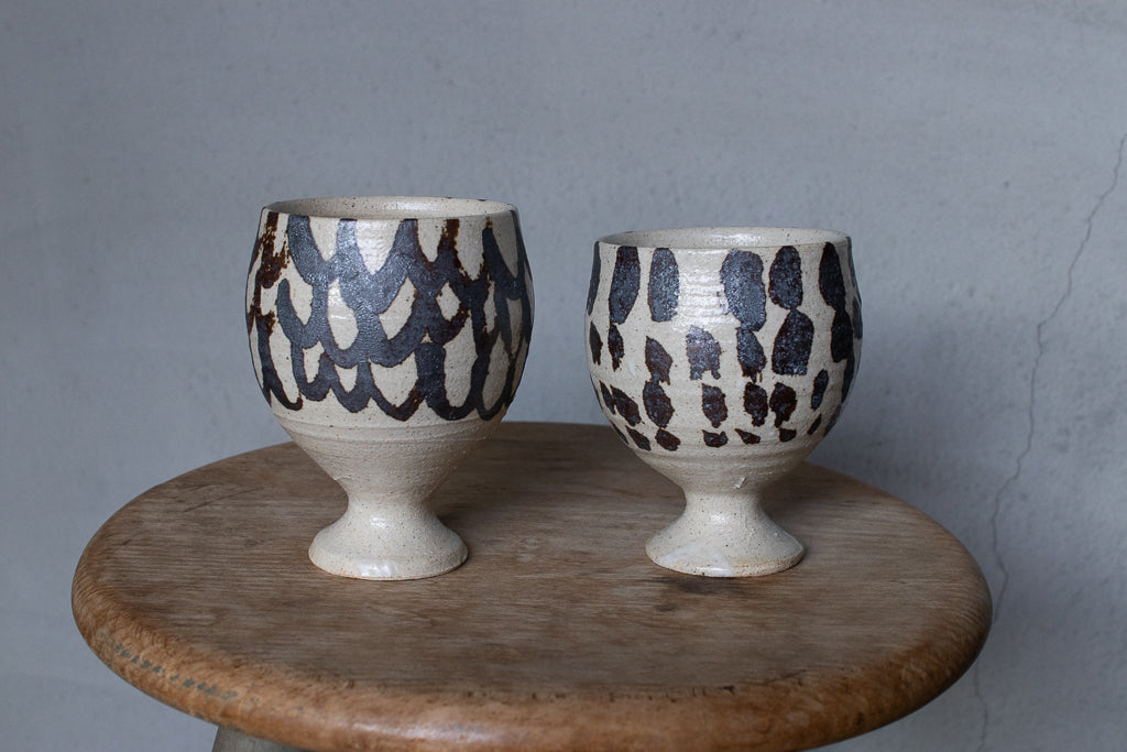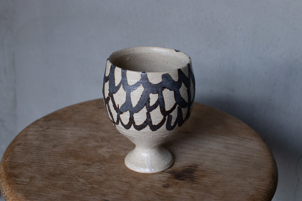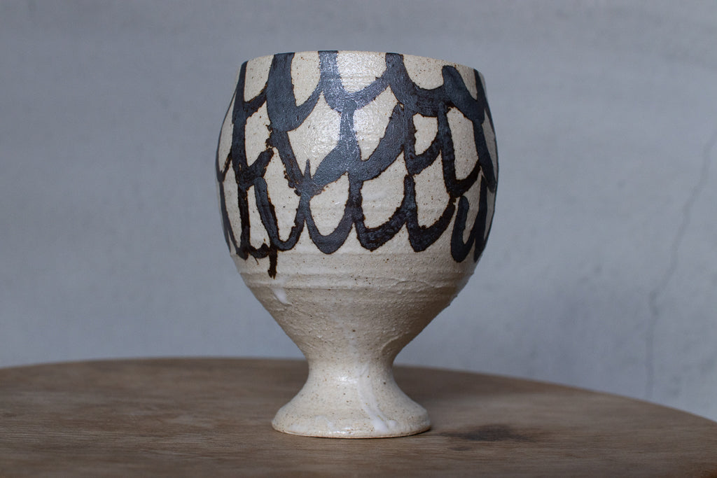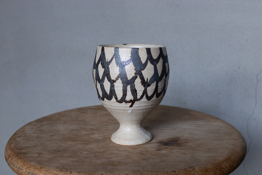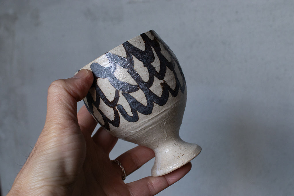 西川真衣さんのゴブレット。足元を小さめに仕上げた見た目のバランスがよく、鉄絵の柄も手仕事感に溢れており、モダンさと素朴さが同居した良い塩梅の作品です。