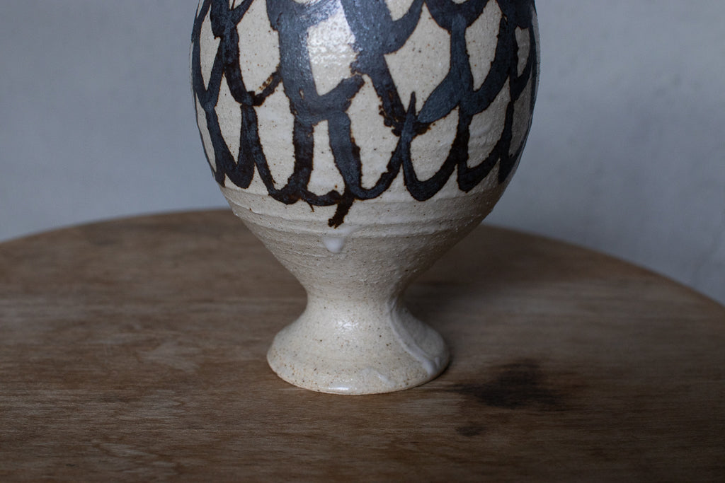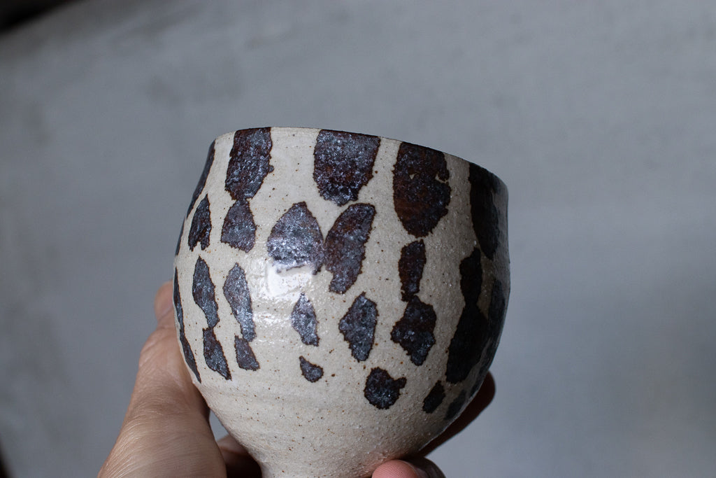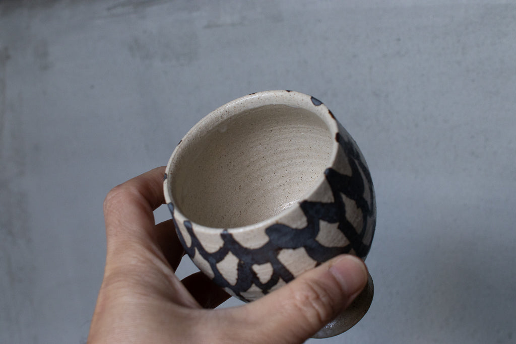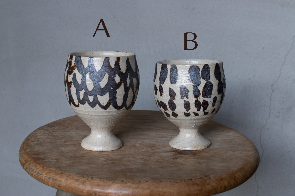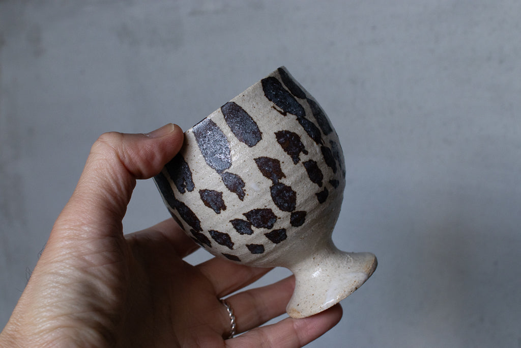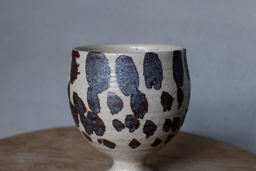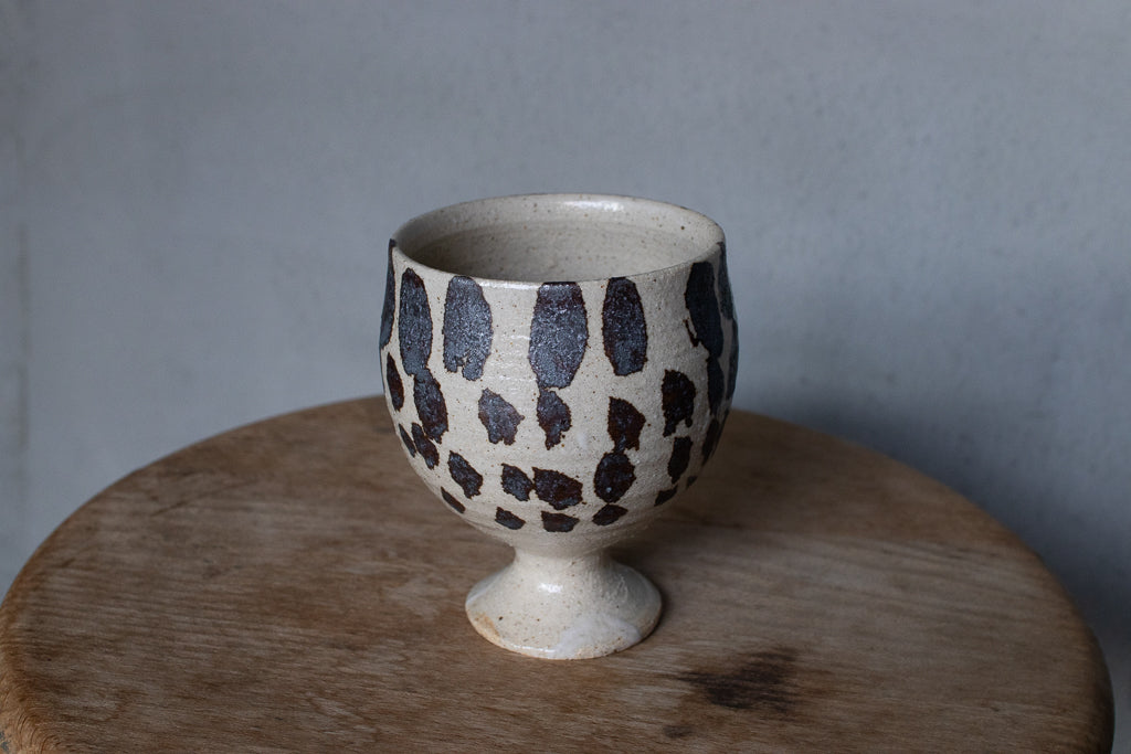西川真衣さんのゴブレット。足元を小さめに仕上げた見た目のバランスがよく、鉄絵の柄も手仕事感に溢れており、モダンさと素朴さが同居した良い塩梅の作品です。