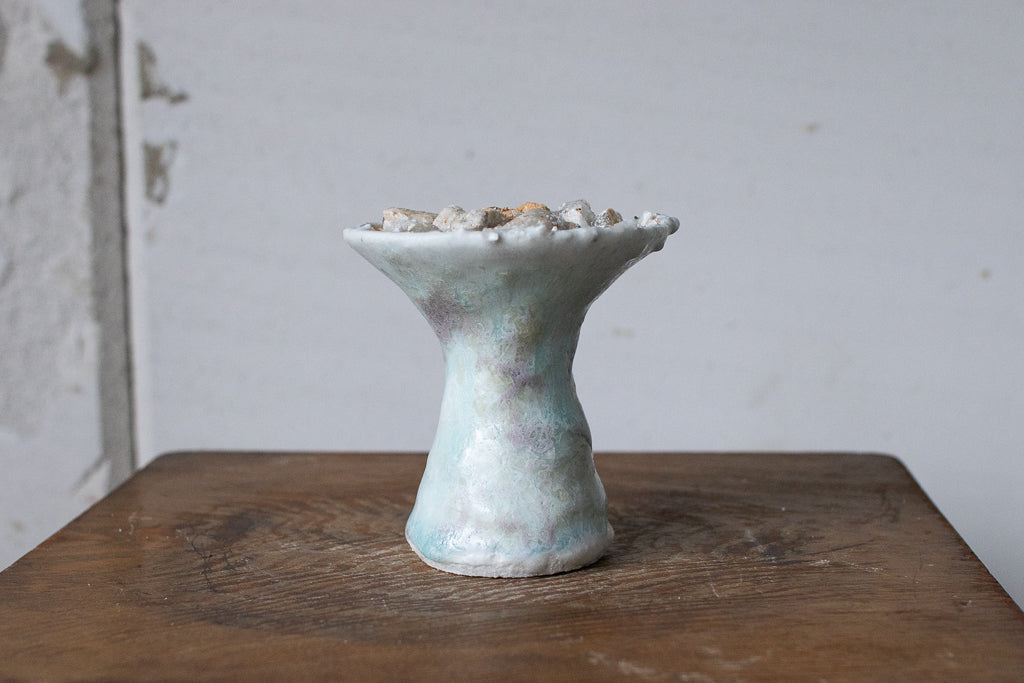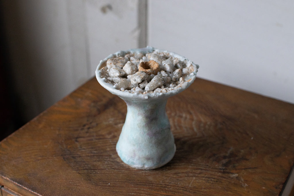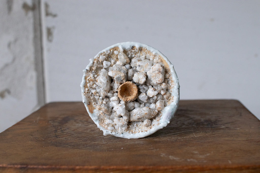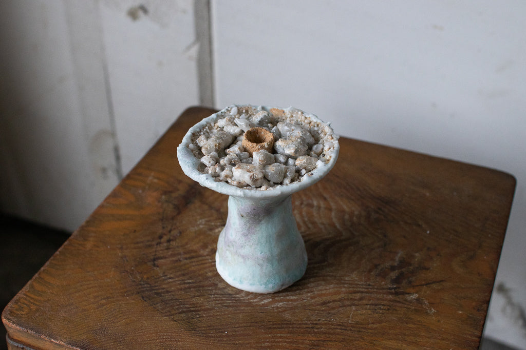 釉薬の原料となる石を散りばめ・溶かした石シリーズの作品です。お香立てと言っても、中央の穴は広くて浅いのでマッチ棒タイプのお香くらいしか適合しなさそうです。コーン型のお香でも良さそう。お客さまによっては単にオブジェとして飾りたいという方や指輪を置くのに使うと言う方も…!