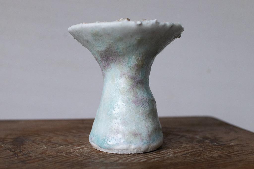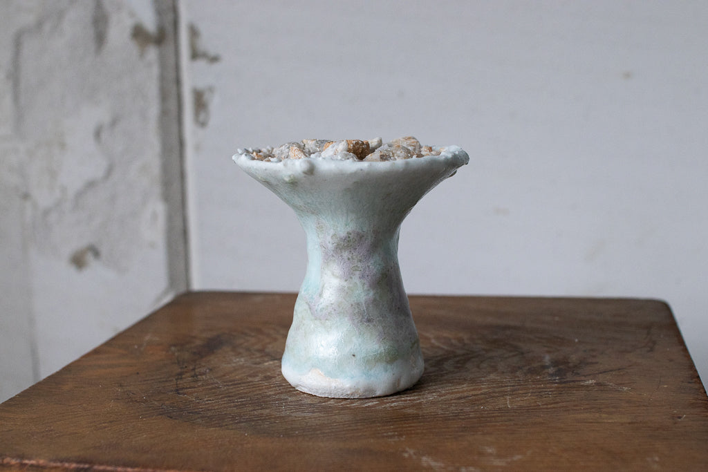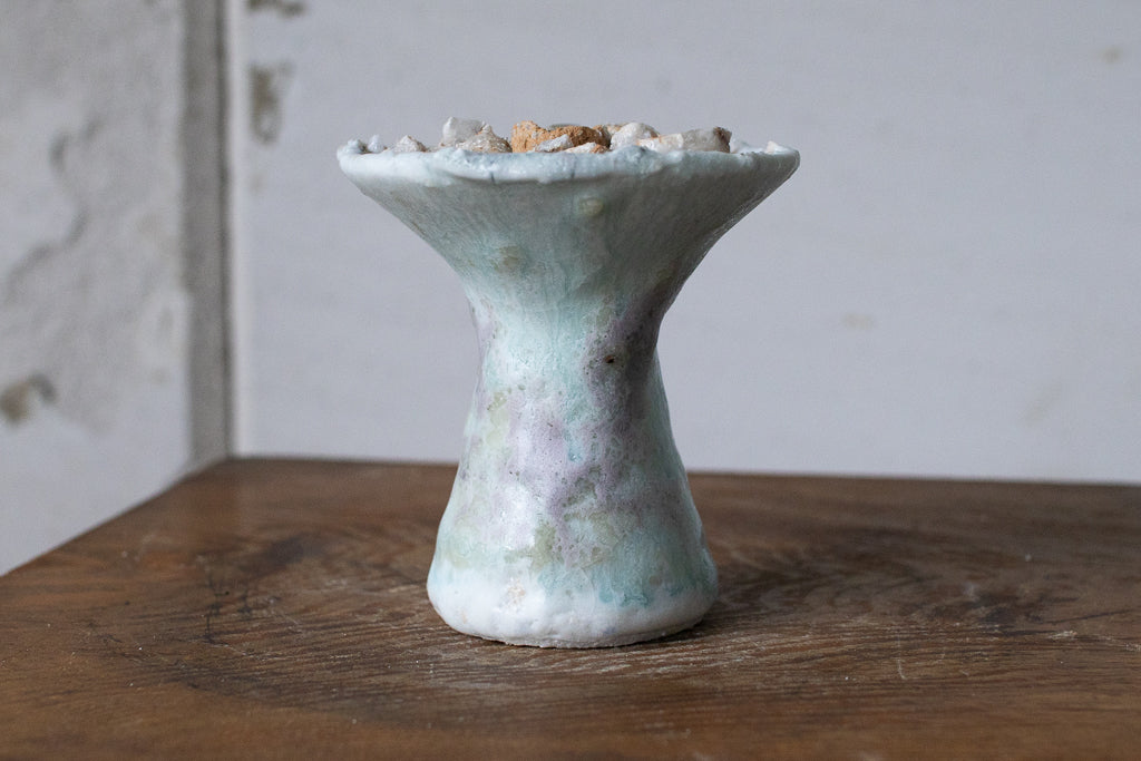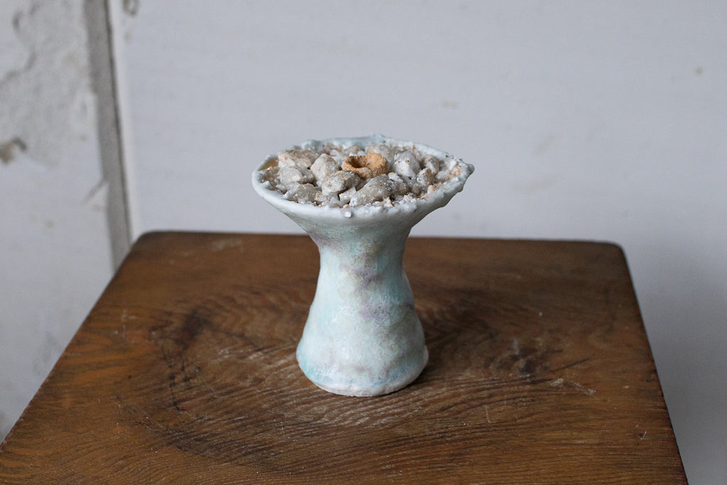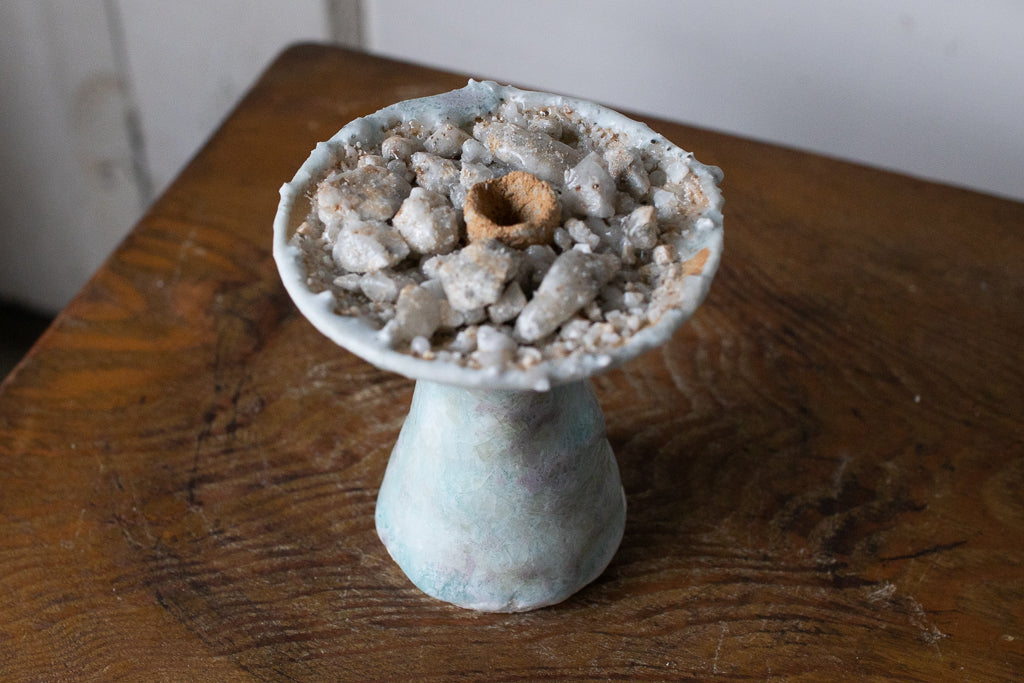 釉薬の原料となる石を散りばめ・溶かした石シリーズの作品です。お香立てと言っても、中央の穴は広くて浅いのでマッチ棒タイプのお香くらいしか適合しなさそうです。コーン型のお香でも良さそう。お客さまによっては単にオブジェとして飾りたいという方や指輪を置くのに使うと言う方も…!