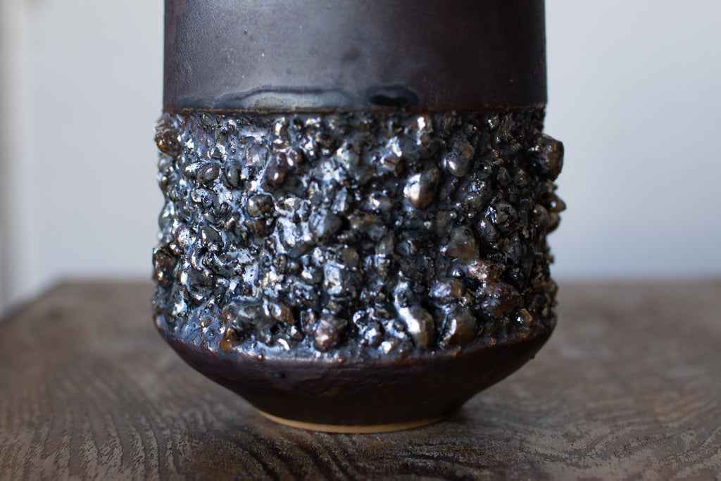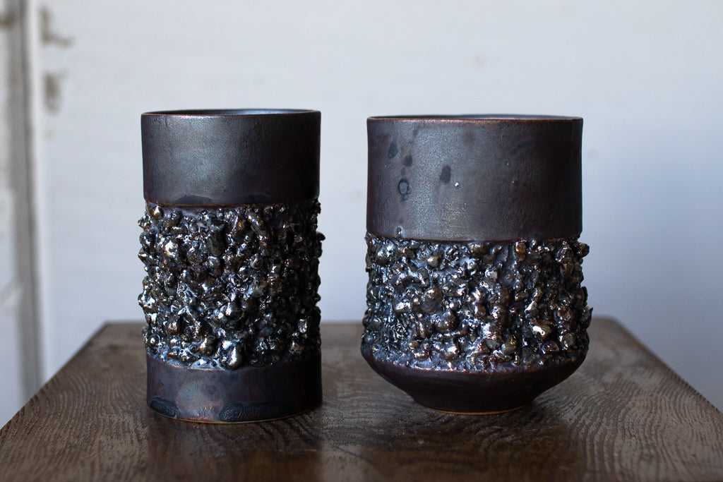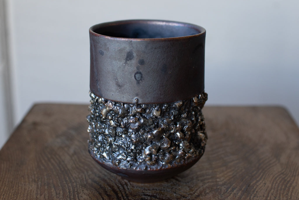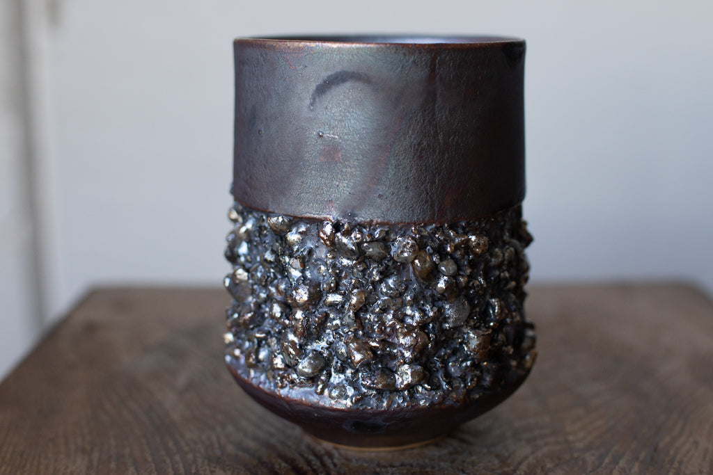 普通のカップに飽きた方に。石部分は普通にゴツゴツしていますし熱伝導も結構高いです。五感を刺激してくれる作品です。メタリックな質感が格好良い。