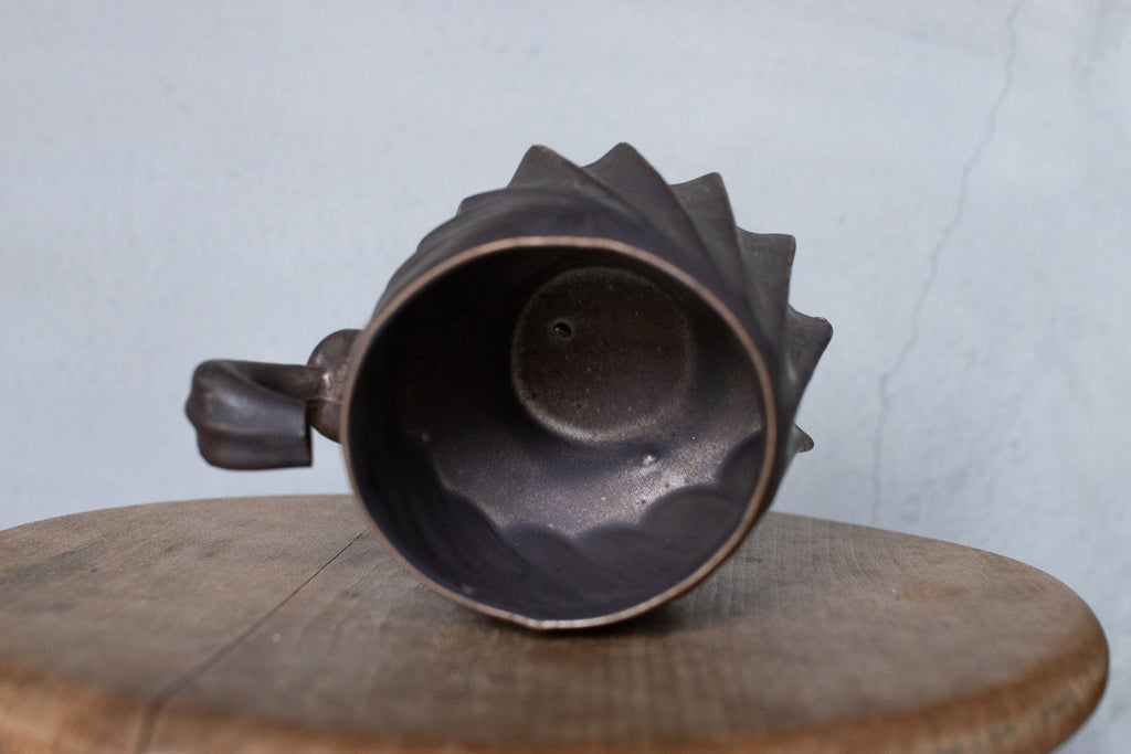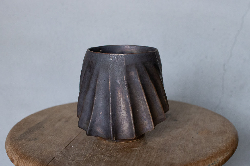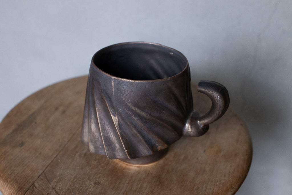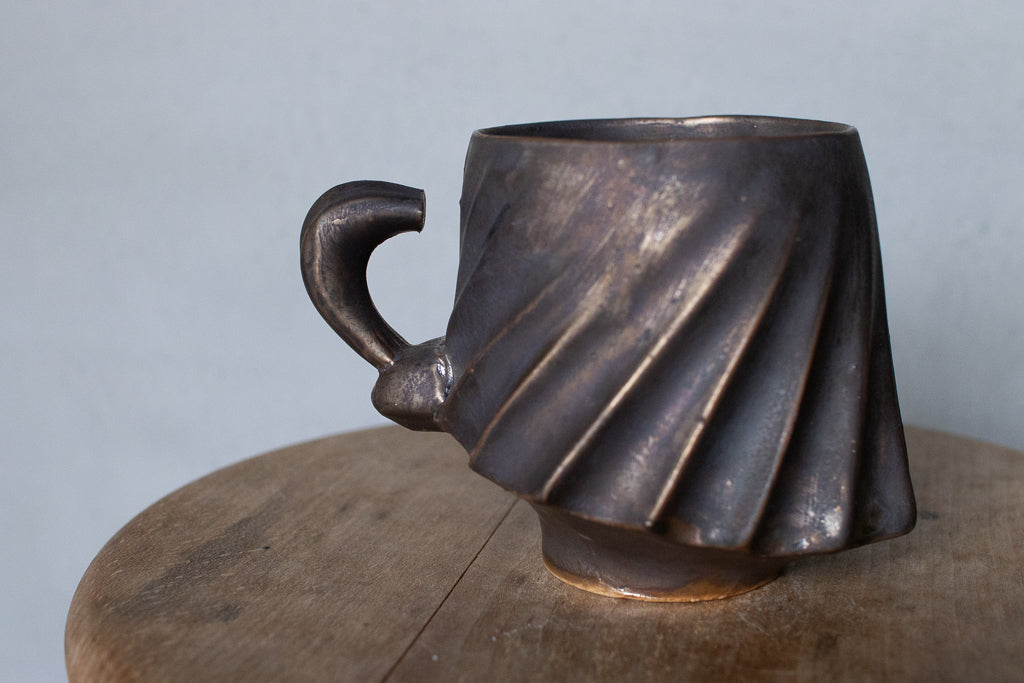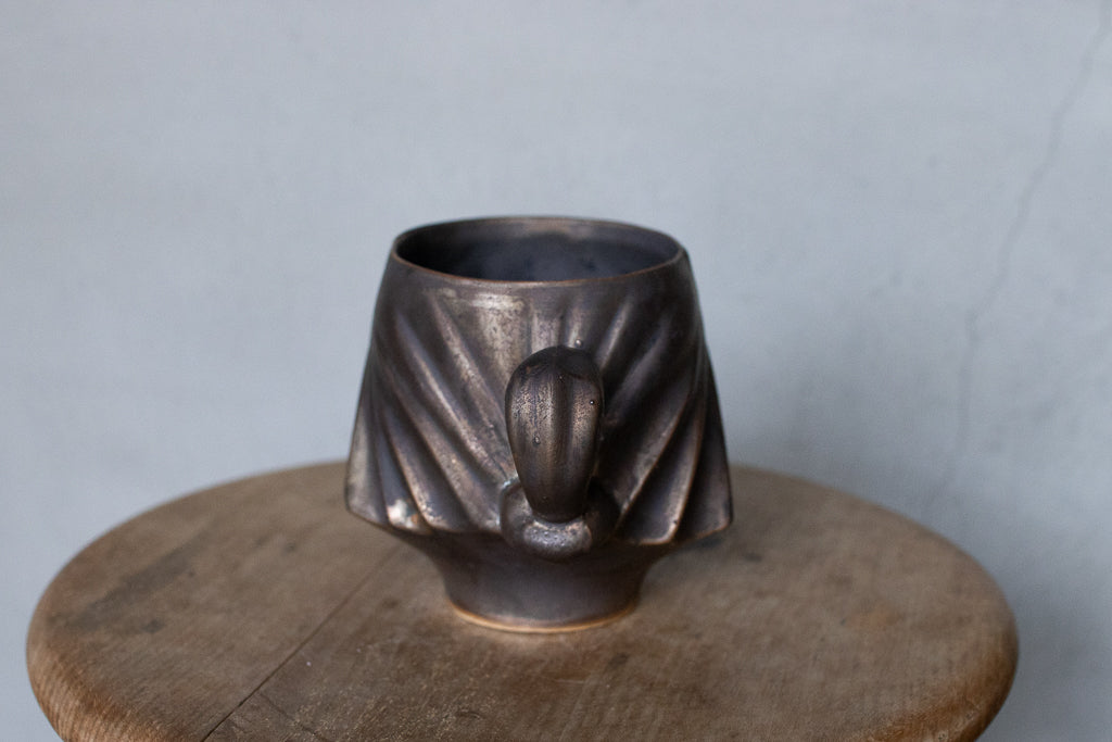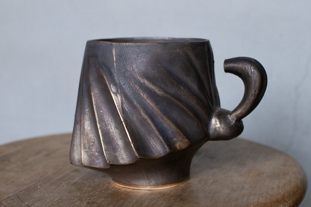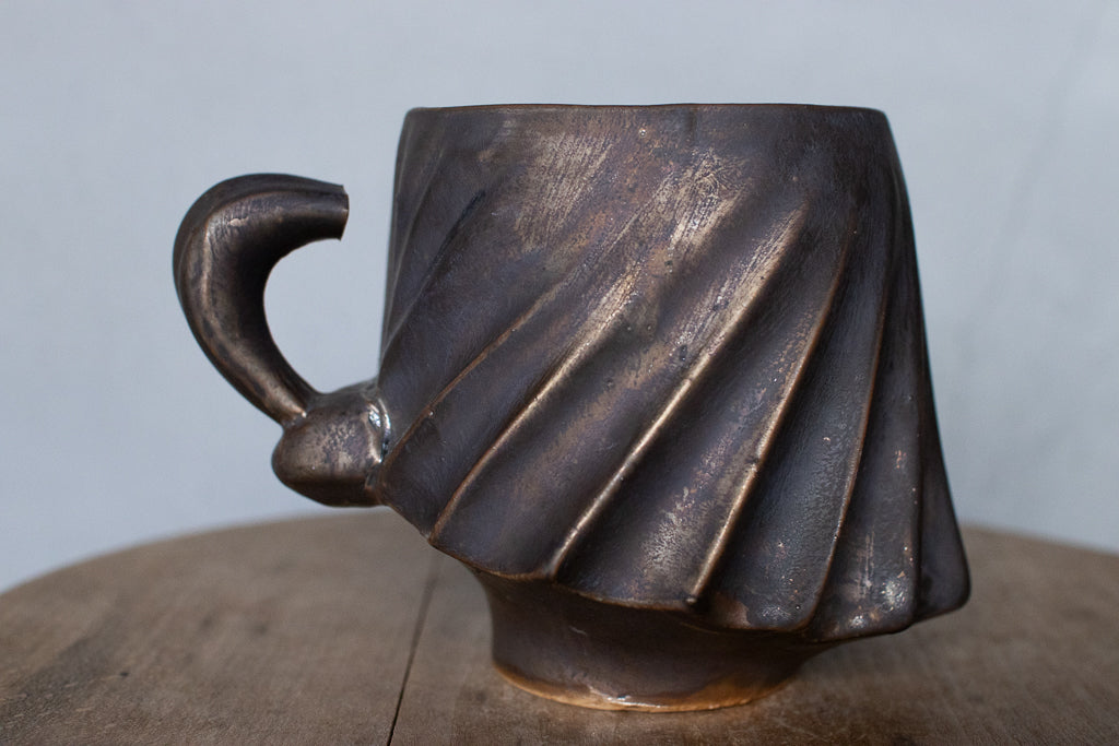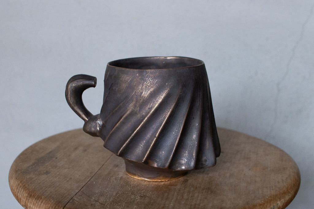 布をモチーフに制作されたカップ。フリル状の造形とその上を流れる釉薬の質感がなんとも美しい作品です。
