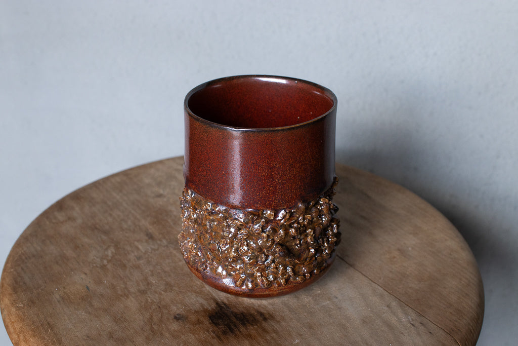 野中麟太郎さんのstoneシリーズより人気のフリーカップです。釉薬の原料となる長石系の原料を散りばめ・溶かした石シリーズの作品。普通のカップに飽きた方に。石部分は普通にゴツゴツしていますし熱伝導も結構高いです。五感を刺激してくれる作品です。こちらは新色の赤。ワインレッドといった風合いで渋いです。