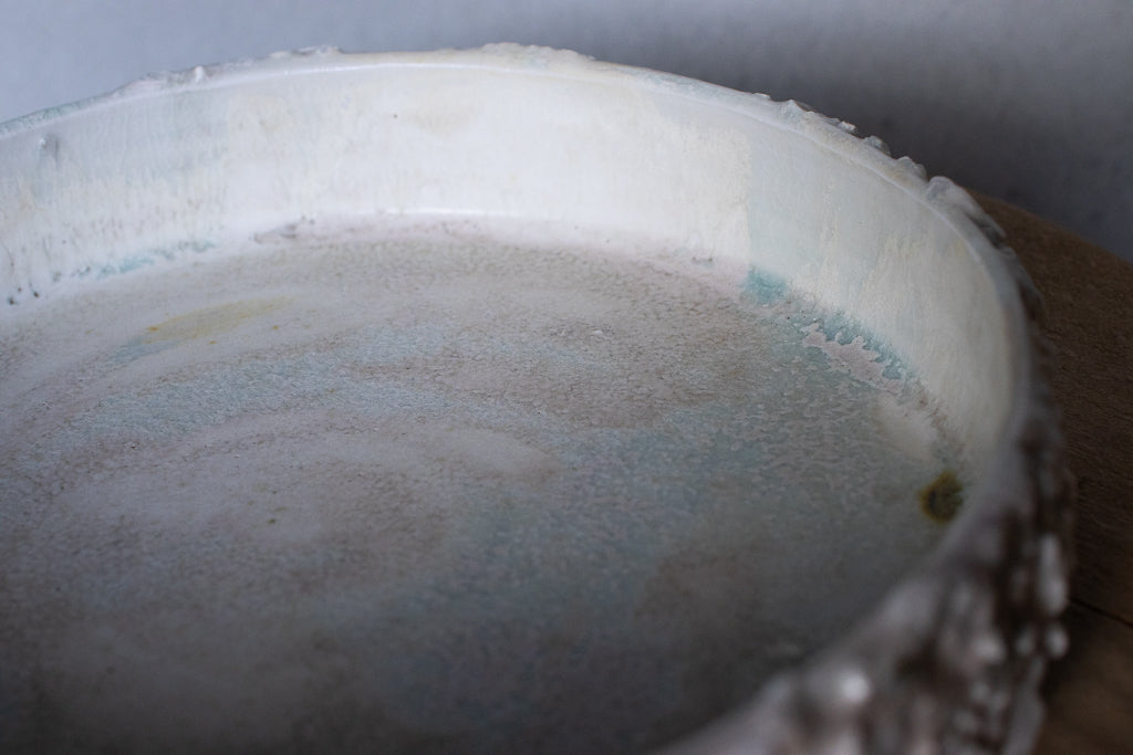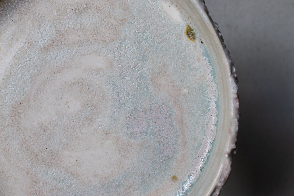 野中麟太郎さんのstoneシリーズより銅鑼鉢です。釉薬の原料となる長石系の原料を散りばめ・溶かした石シリーズの作品。見込みの緑やピンクが溶け込んだような表情がとても美しいです。