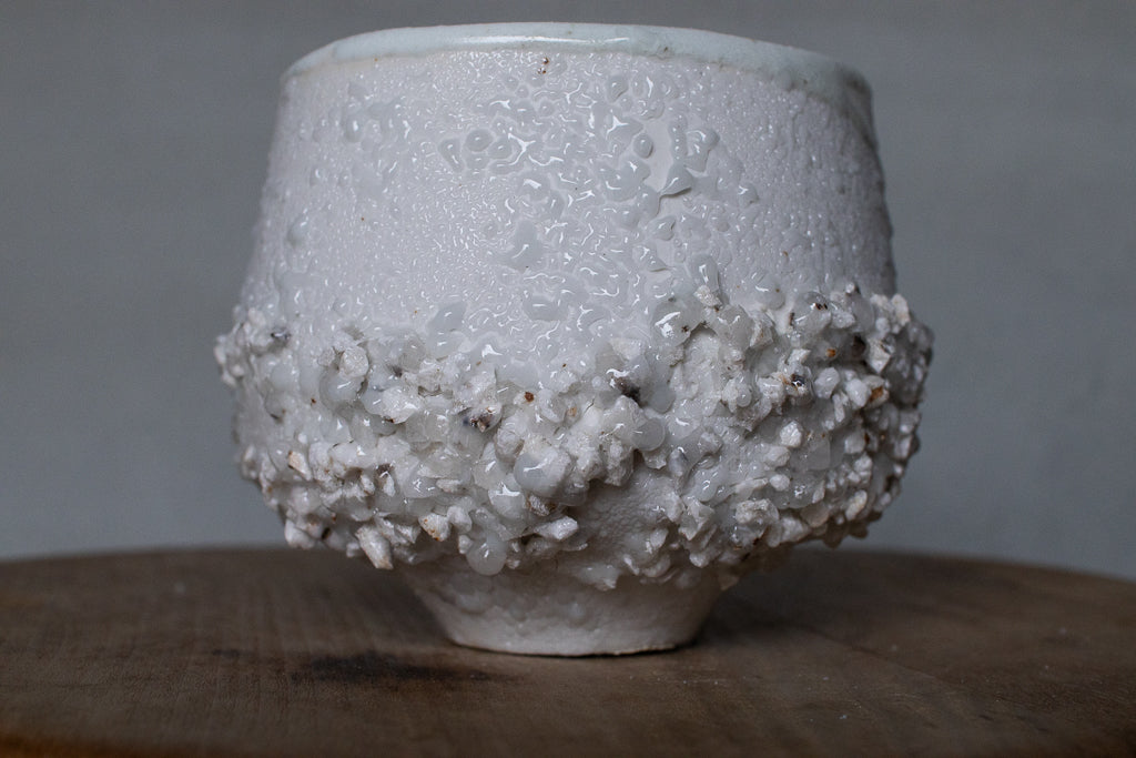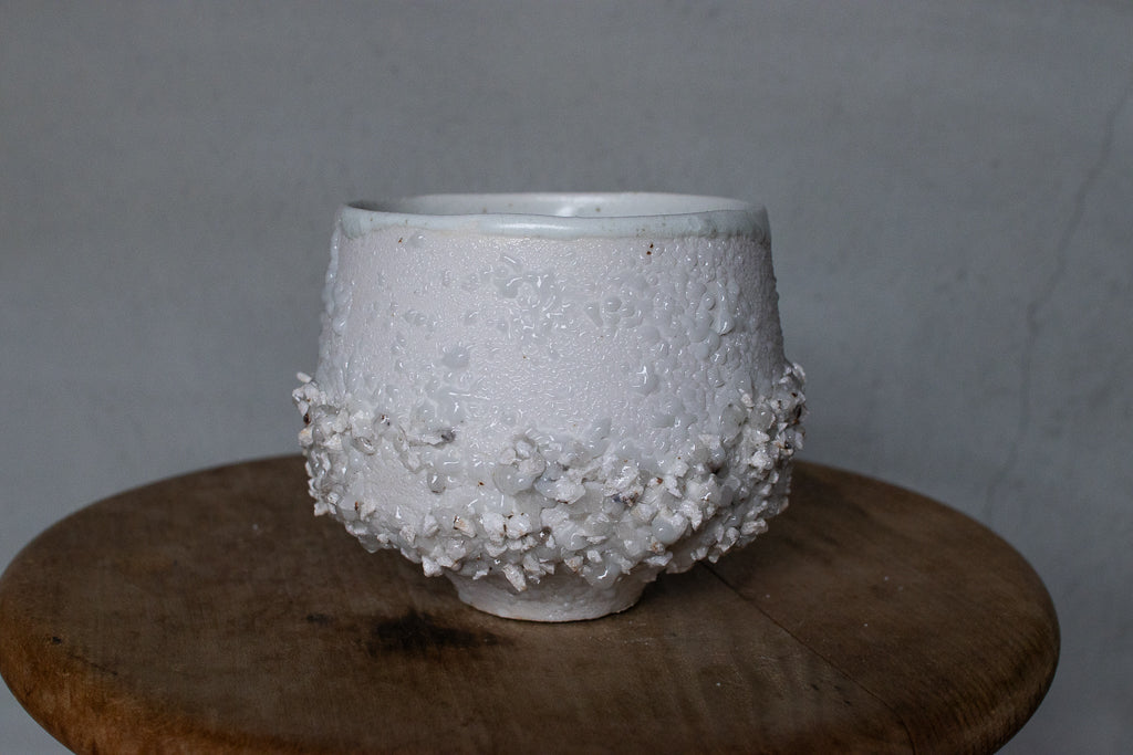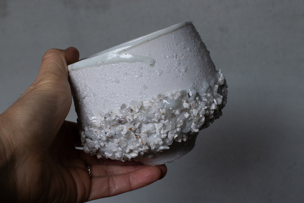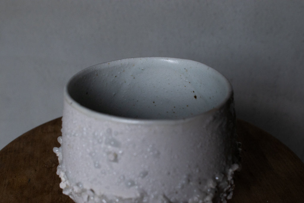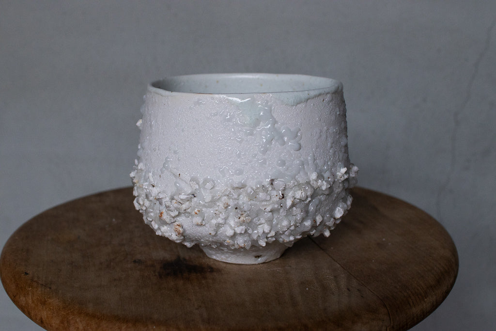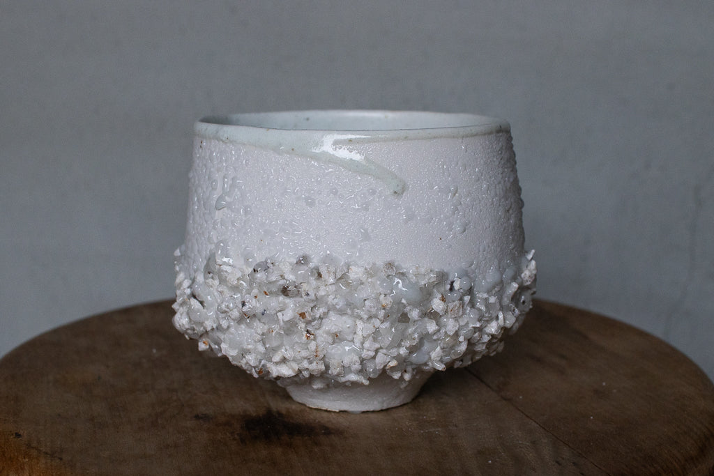 野中麟太郎さんのstoneシリーズより抹茶碗です。釉薬の原料となる長石系の原料を散りばめ・溶かした石シリーズの作品。普通のカップに飽きた方に。石部分は普通にゴツゴツしていますし熱伝導も結構高いです。五感を刺激してくれる作品です。
