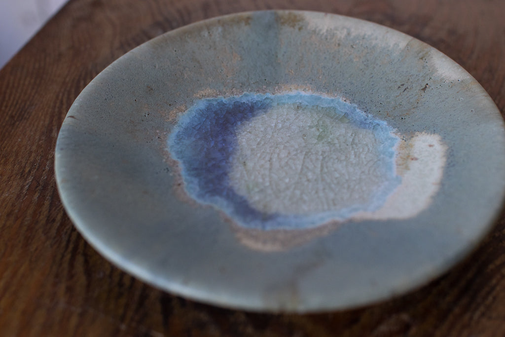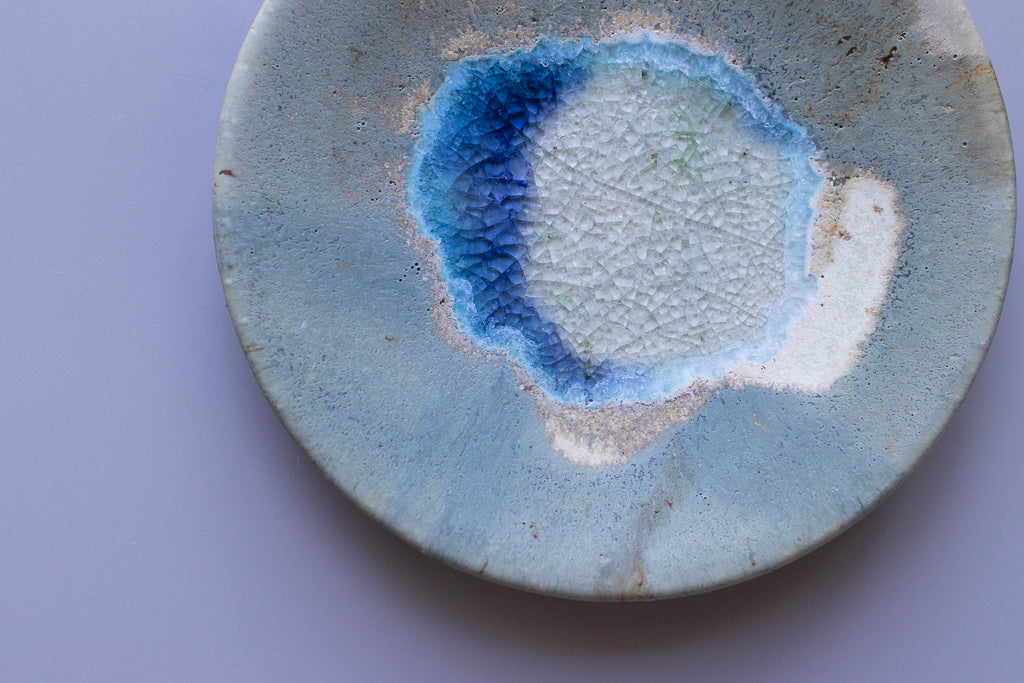 取り皿・菓子皿としてちょうど良さそうなサイズ感のお皿。”惑星のみずうみ”と名付けられたシリーズです。見込みのキラキラの結晶は、天草の海岸に流れ着いたシーグラスを砕いたものを原料に使用しています。