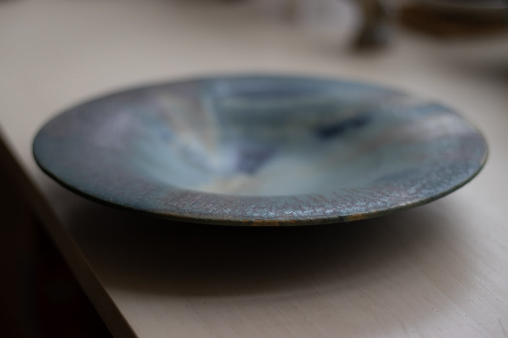 なだらかにくぼみをつけられた皿。浅鉢として見ても良いかもしれません。しっかり大きさがあって重量感もそこそこにあります。食卓の中心にどんと置いて大皿料理に使うか…。贅沢にパスタ皿として使えば相当格別な雰囲気を演出できそうです。