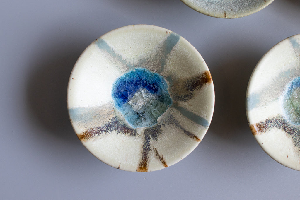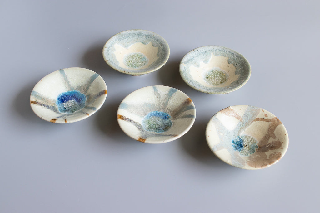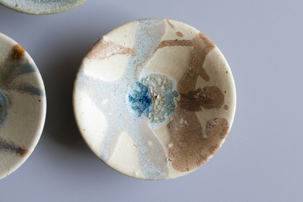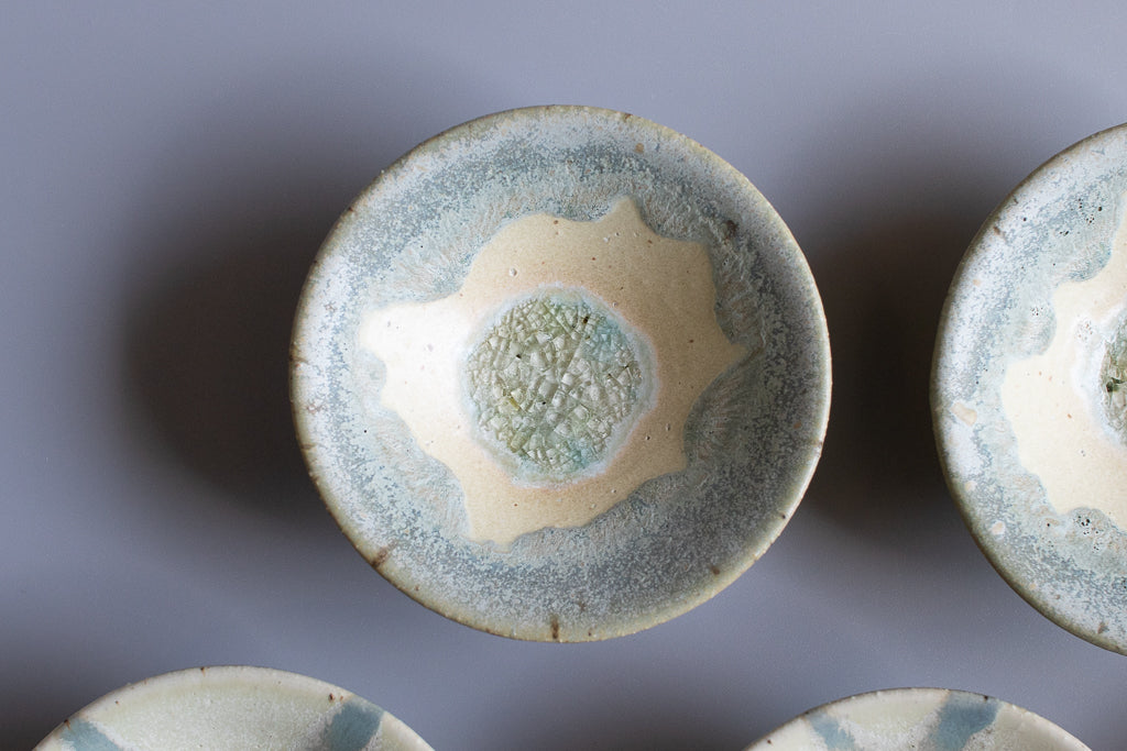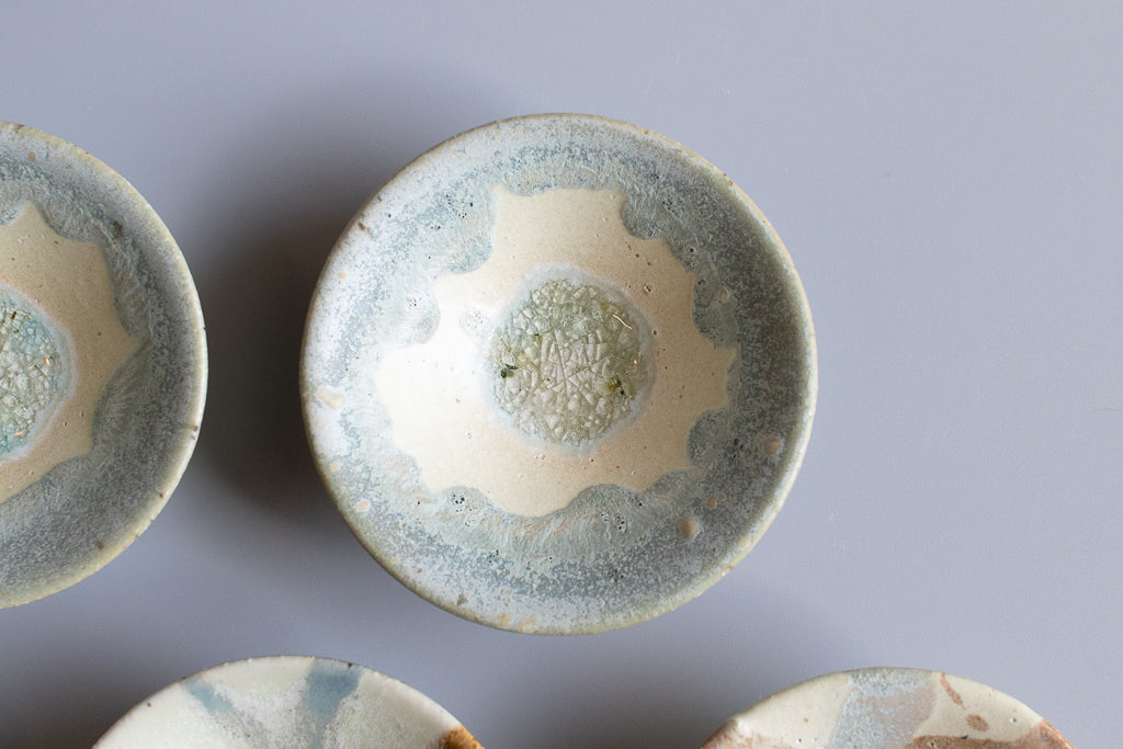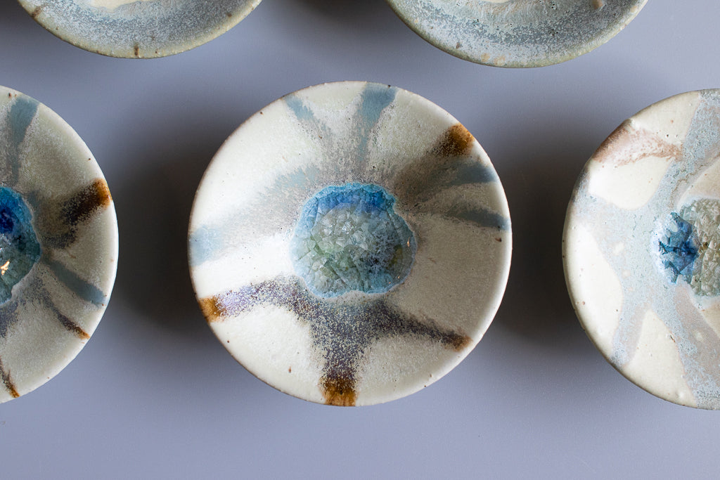 少し深さのある3寸程度のお皿。”惑星のみずうみ”と名付けられたシリーズです。見込みのキラキラの結晶は、天草の海岸に流れ着いたシーグラスを砕いたものを原料に使用しています。