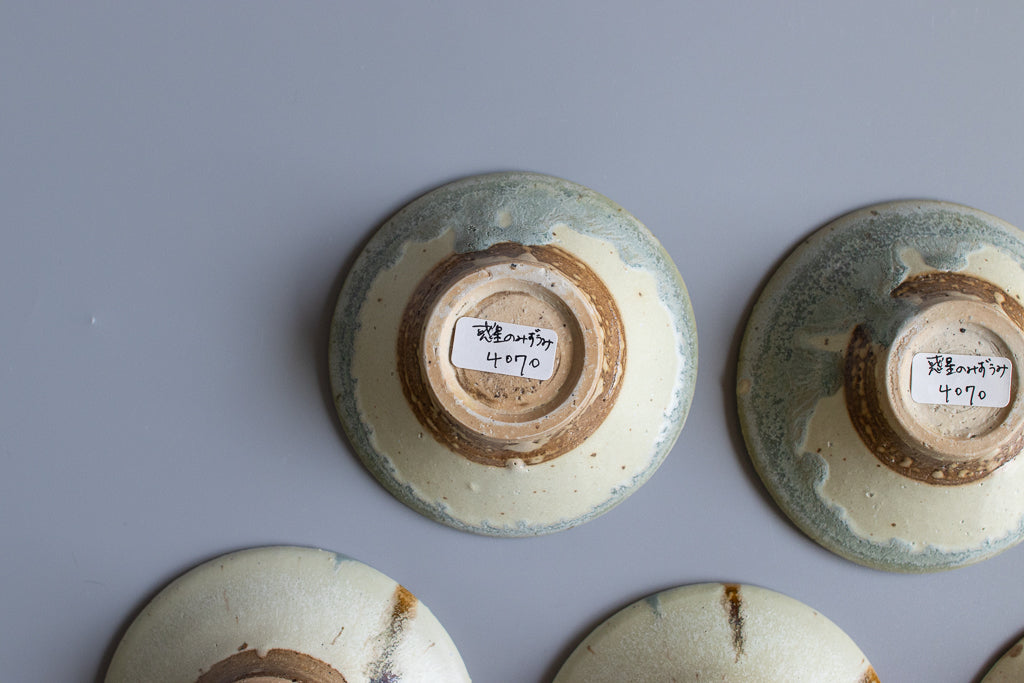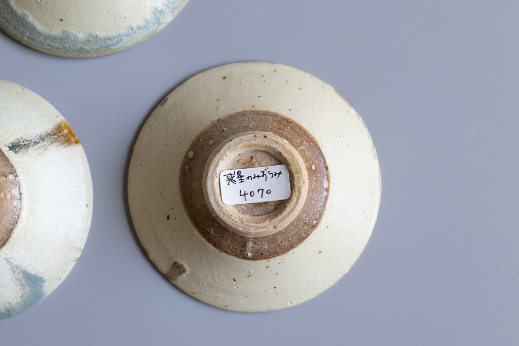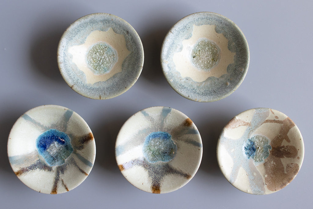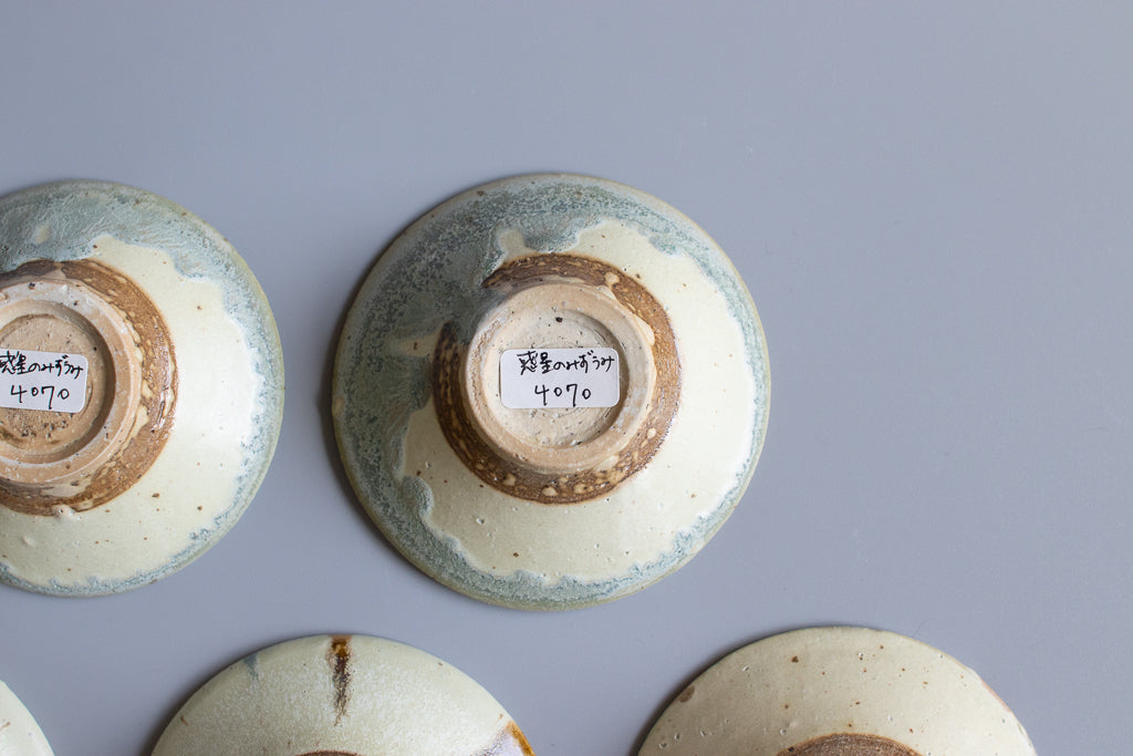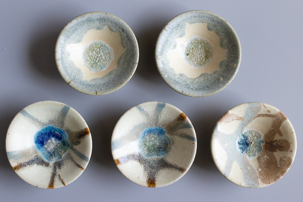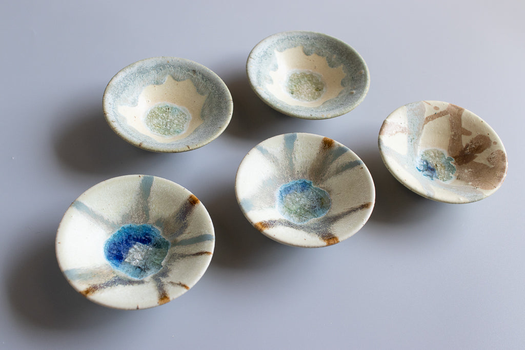 少し深さのある3寸程度のお皿。”惑星のみずうみ”と名付けられたシリーズです。見込みのキラキラの結晶は、天草の海岸に流れ着いたシーグラスを砕いたものを原料に使用しています。