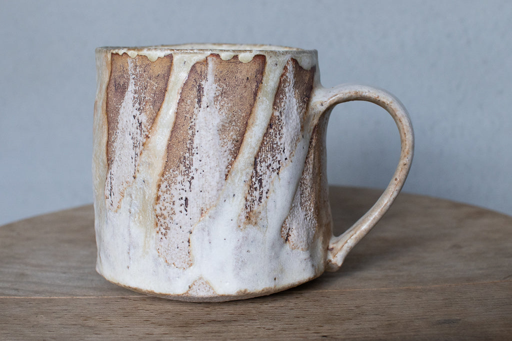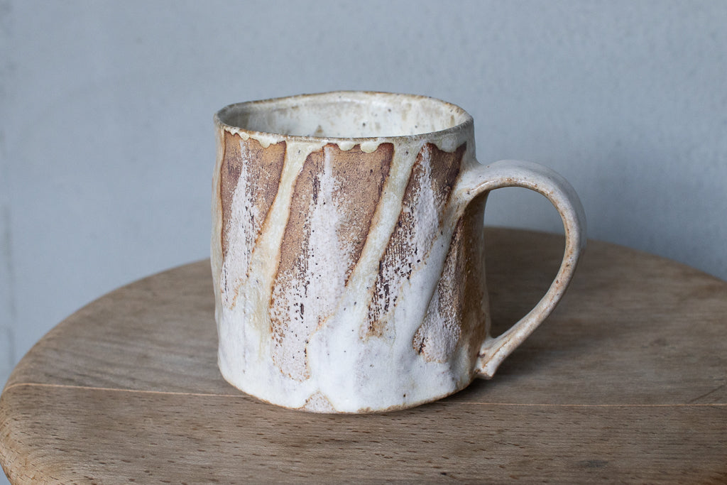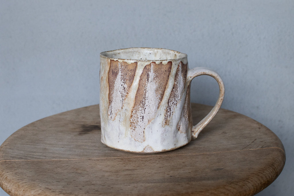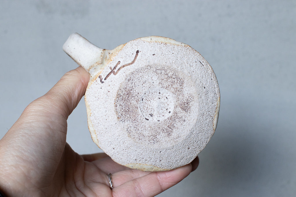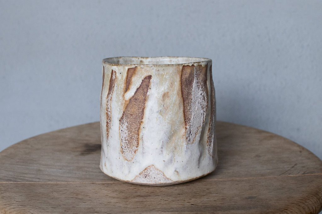 千葉で作陶する鈴木圭太氏。手びねりで形づくられたいびつさと柔らかさを感じさせる造形。内側はよく流れた釉薬の動きと釉溜まりの結晶が綺麗です。しかし何より素晴らしいのは外側の手触りです。滑りの良い白化粧の部分と工芸用のノコで加工したざらつきのある部分があり、独特の触り心地がクセになります。