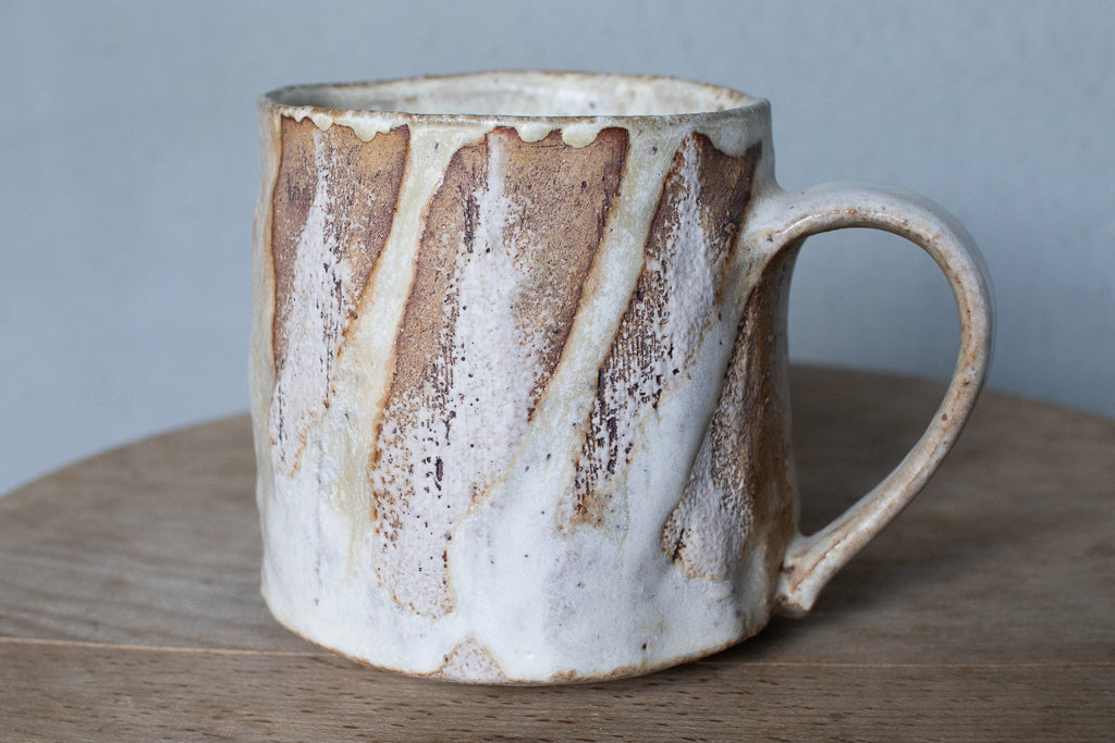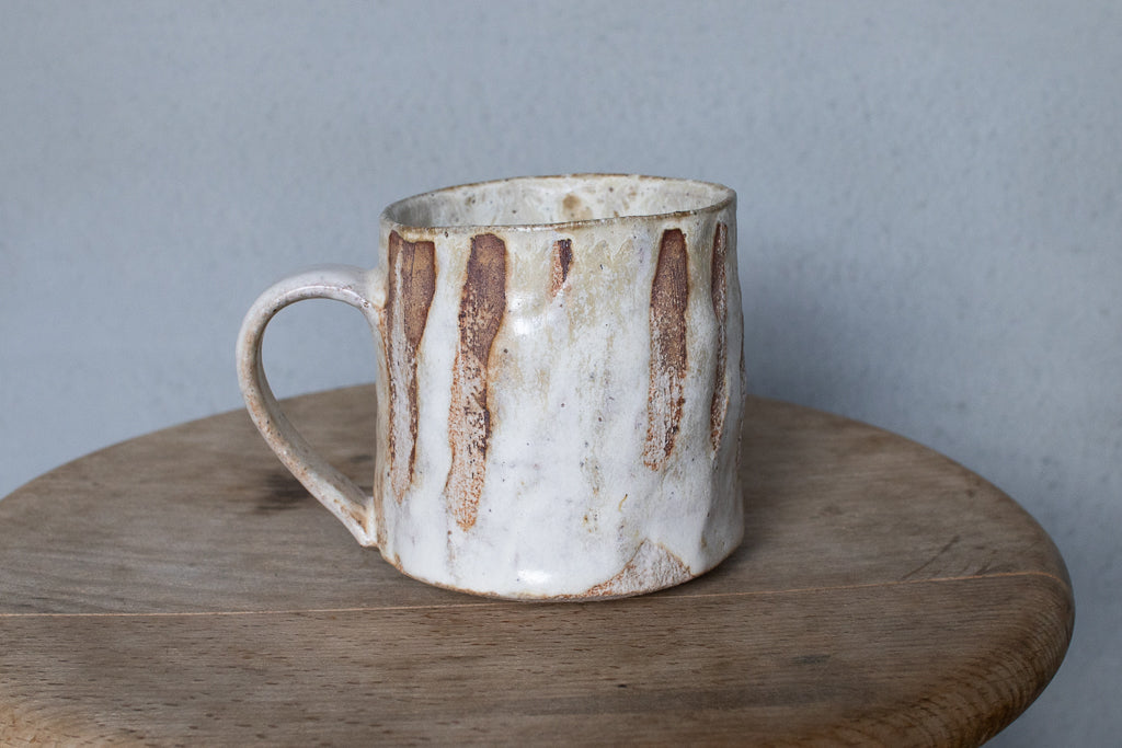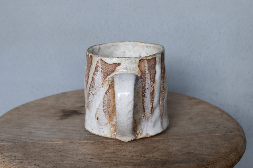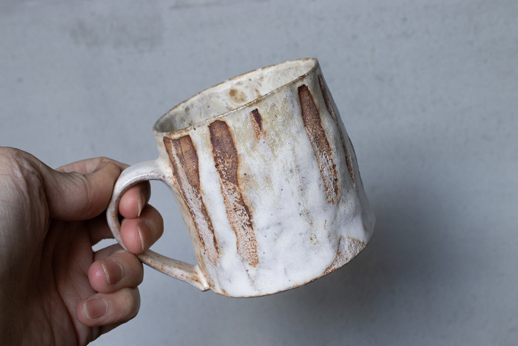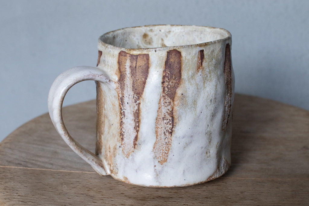 千葉で作陶する鈴木圭太氏。手びねりで形づくられたいびつさと柔らかさを感じさせる造形。内側はよく流れた釉薬の動きと釉溜まりの結晶が綺麗です。しかし何より素晴らしいのは外側の手触りです。滑りの良い白化粧の部分と工芸用のノコで加工したざらつきのある部分があり、独特の触り心地がクセになります。