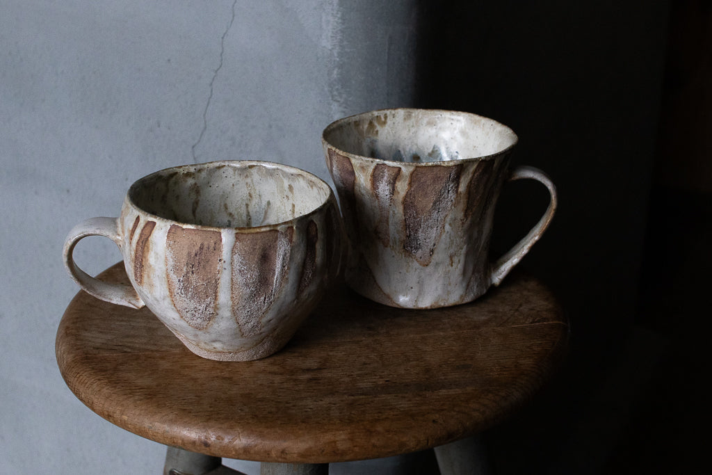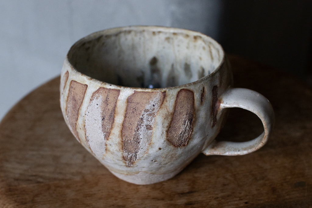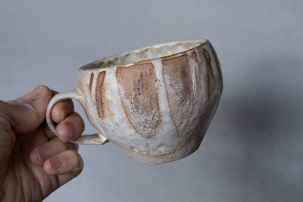 すべすべとざらざらのあいだ?ゴツゴツと言うには柔らかく・あたたかい感じ。鈴木さんの作品はおよそ現存するオノマトペでは言い表せないような不思議な感触がします。持ち手のない片口やカップ類は特にその質感を楽しんで頂けるのでおすすめです。