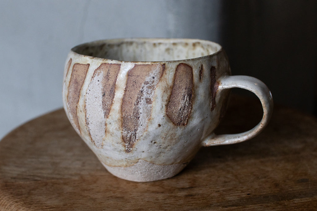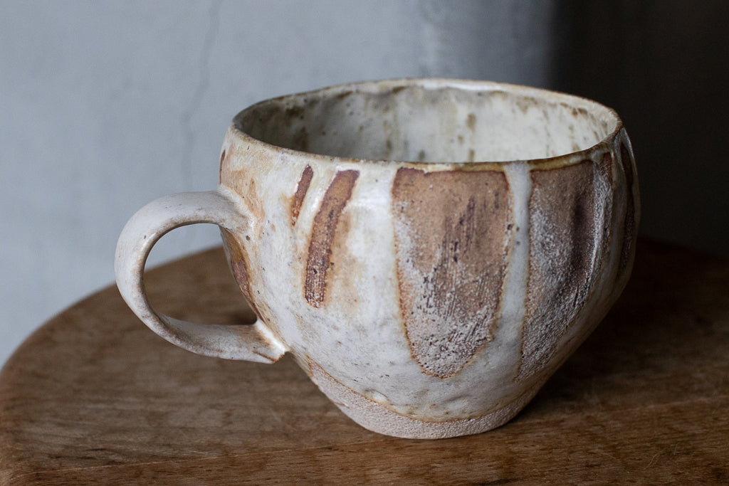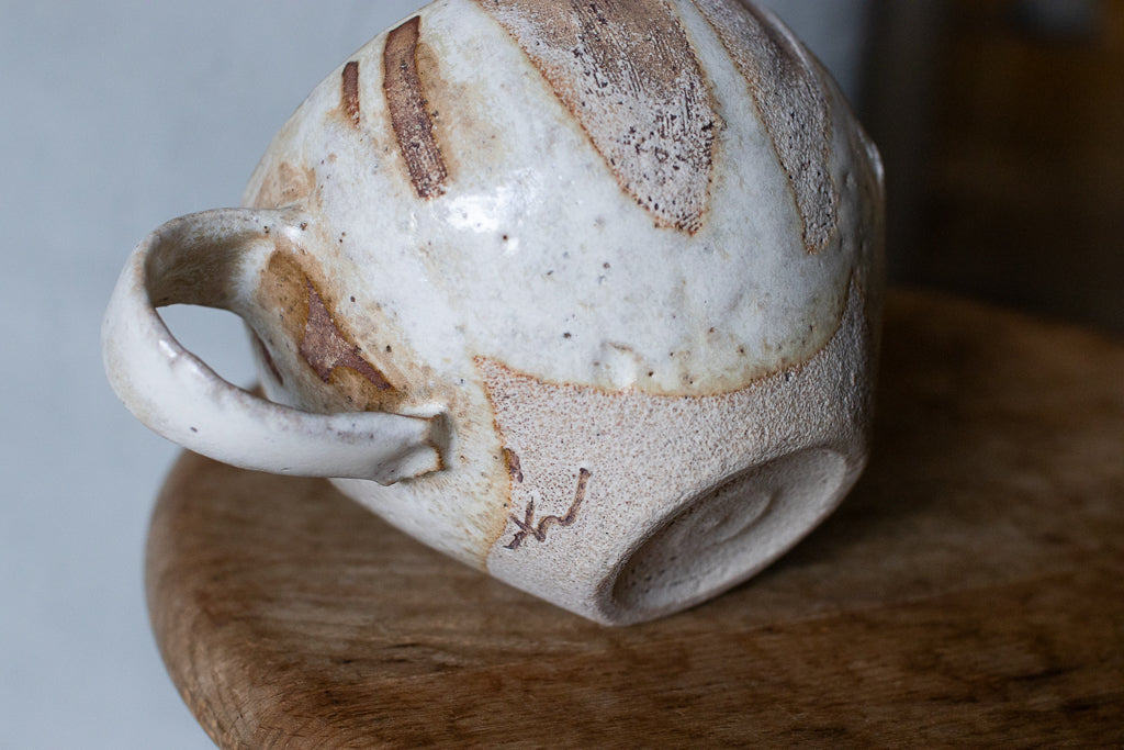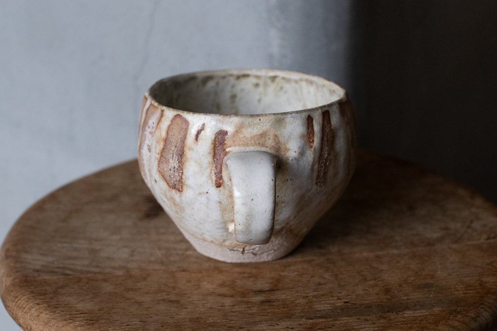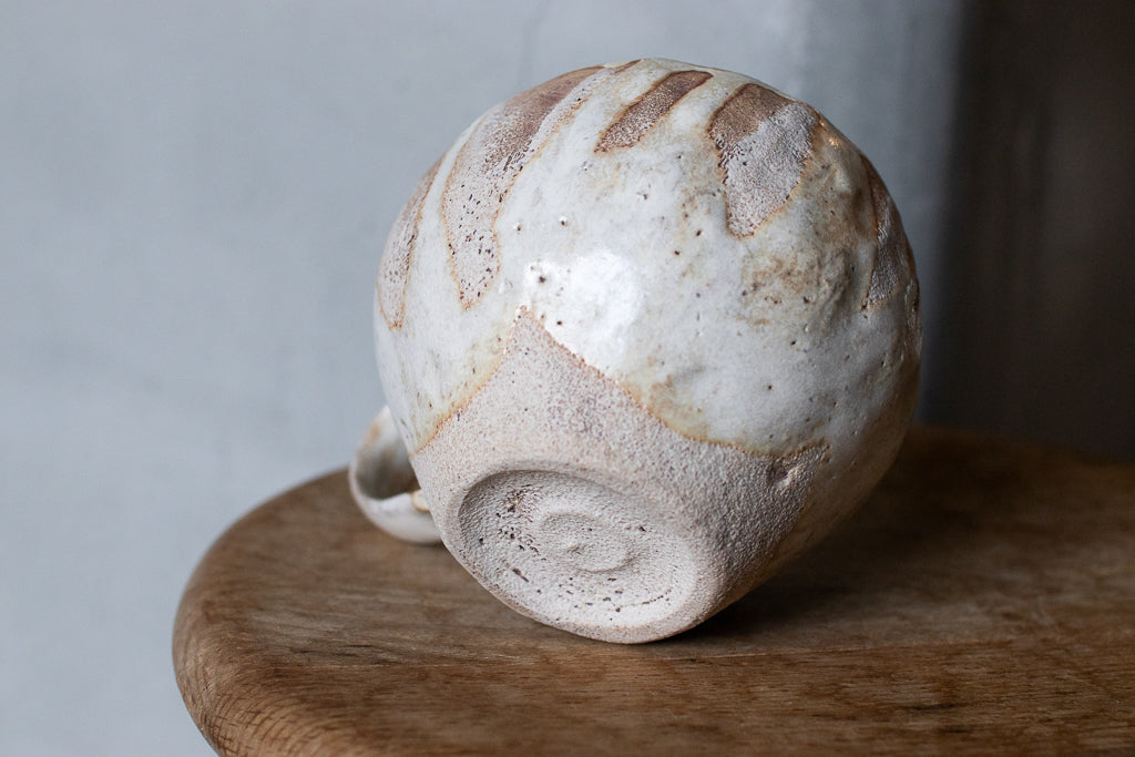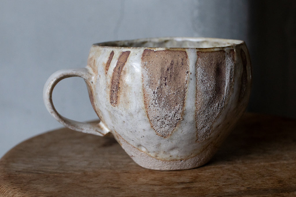 千葉で作陶する鈴木圭太氏。手びねりで形づくられたいびつさと柔らかさを感じさせる造形。内側はよく流れた釉薬の動きと釉溜まりの結晶が綺麗です。しかし何より素晴らしいのは外側の手触りです。滑りの良い白化粧の部分と工芸用のノコで加工したざらつきのある部分があり、独特の触り心地がクセになります。