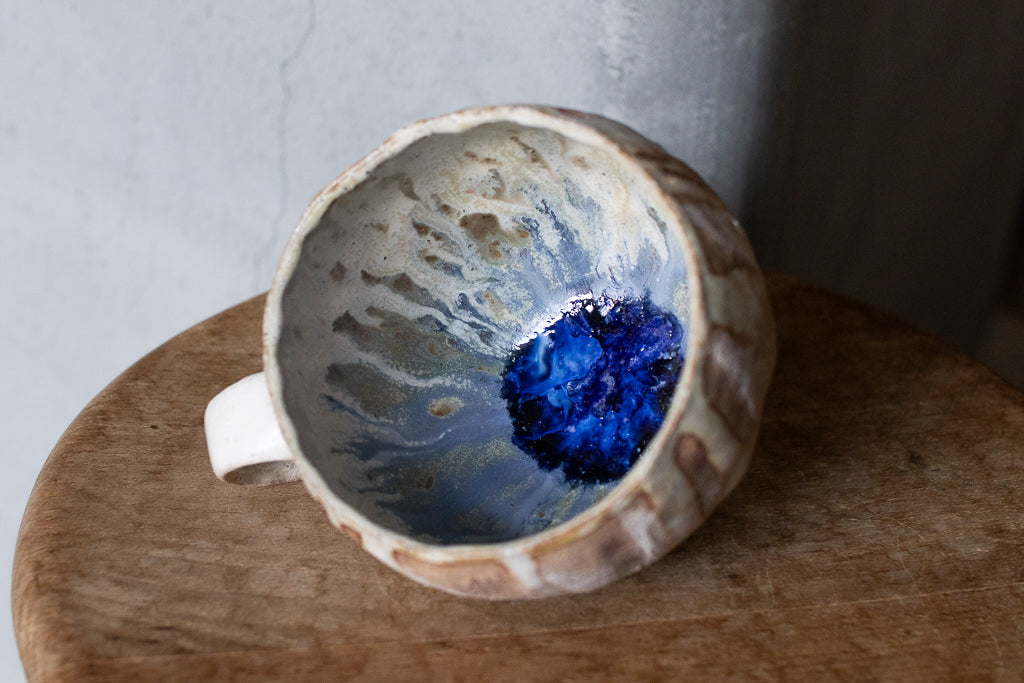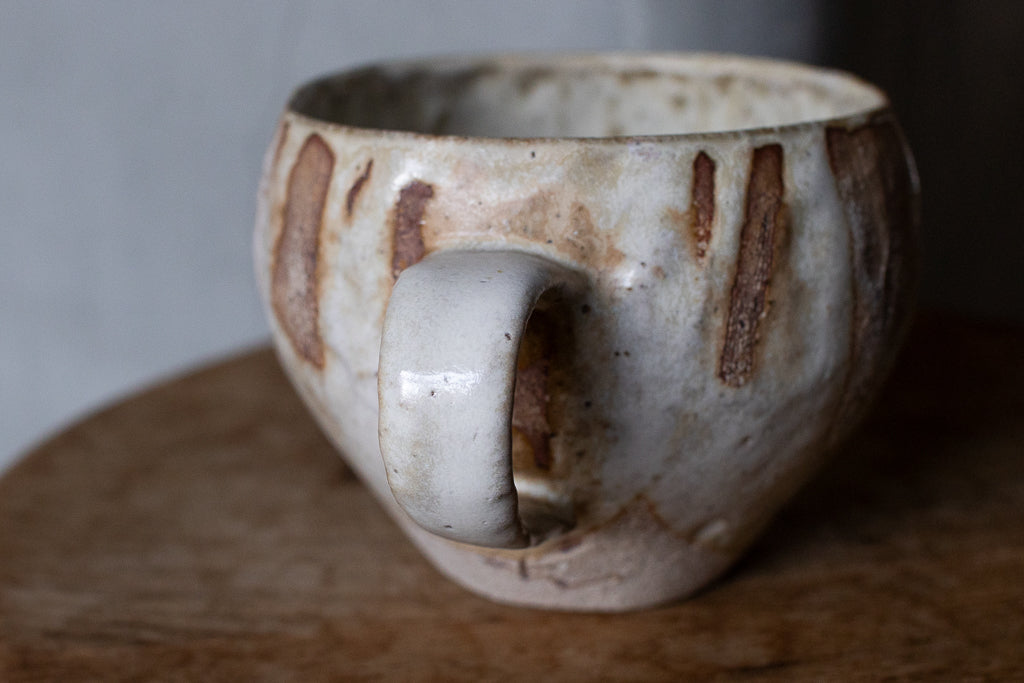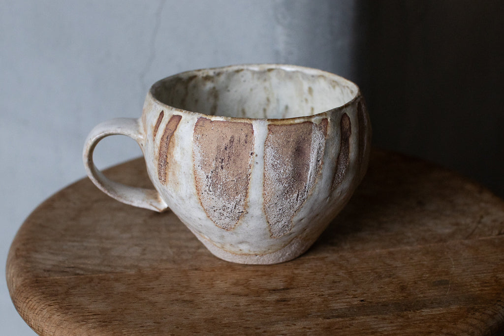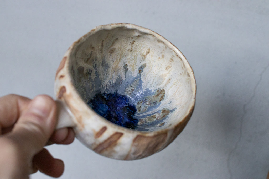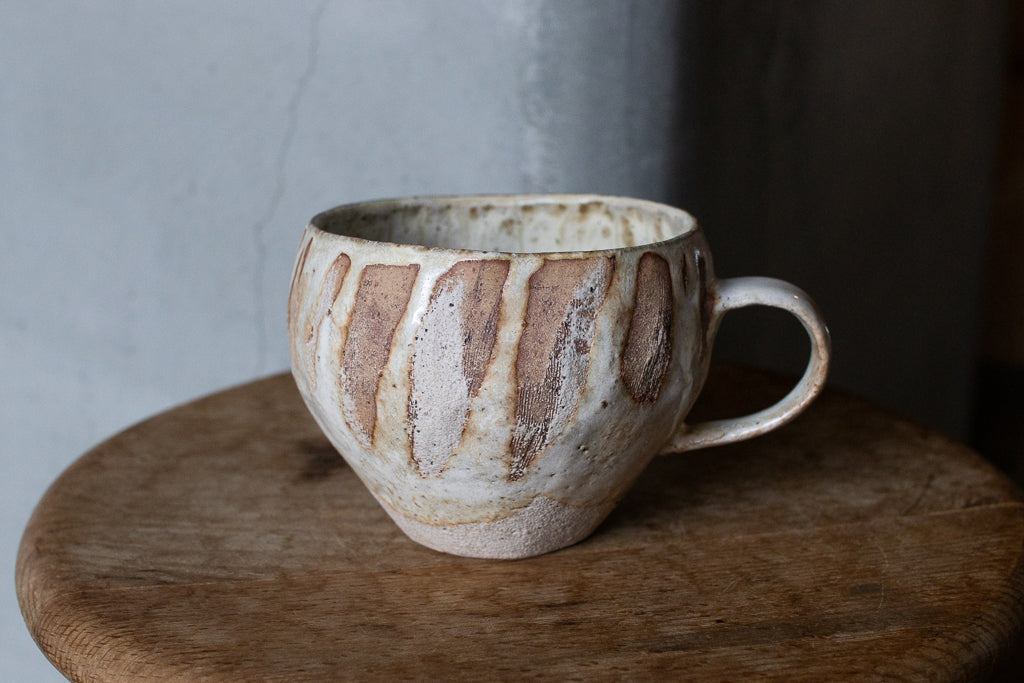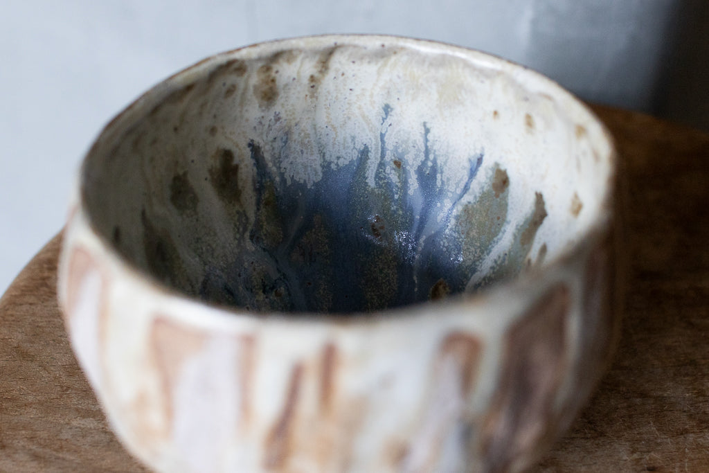 千葉で作陶する鈴木圭太氏。手びねりで形づくられたいびつさと柔らかさを感じさせる造形。内側はよく流れた釉薬の動きと釉溜まりの結晶が綺麗です。しかし何より素晴らしいのは外側の手触りです。滑りの良い白化粧の部分と工芸用のノコで加工したざらつきのある部分があり、独特の触り心地がクセになります。