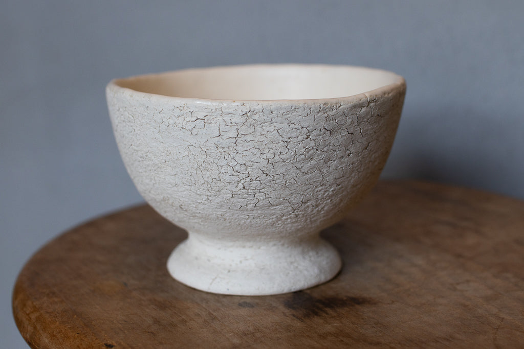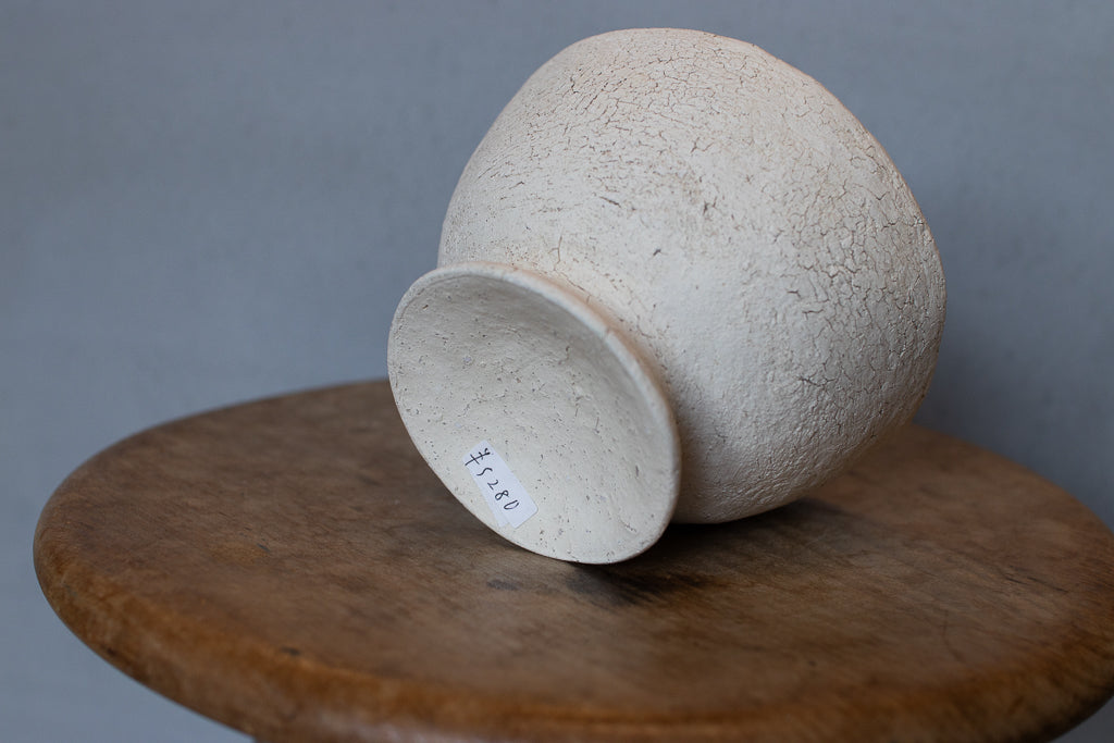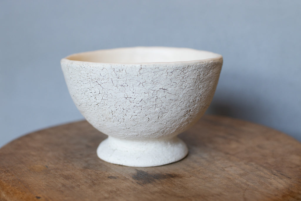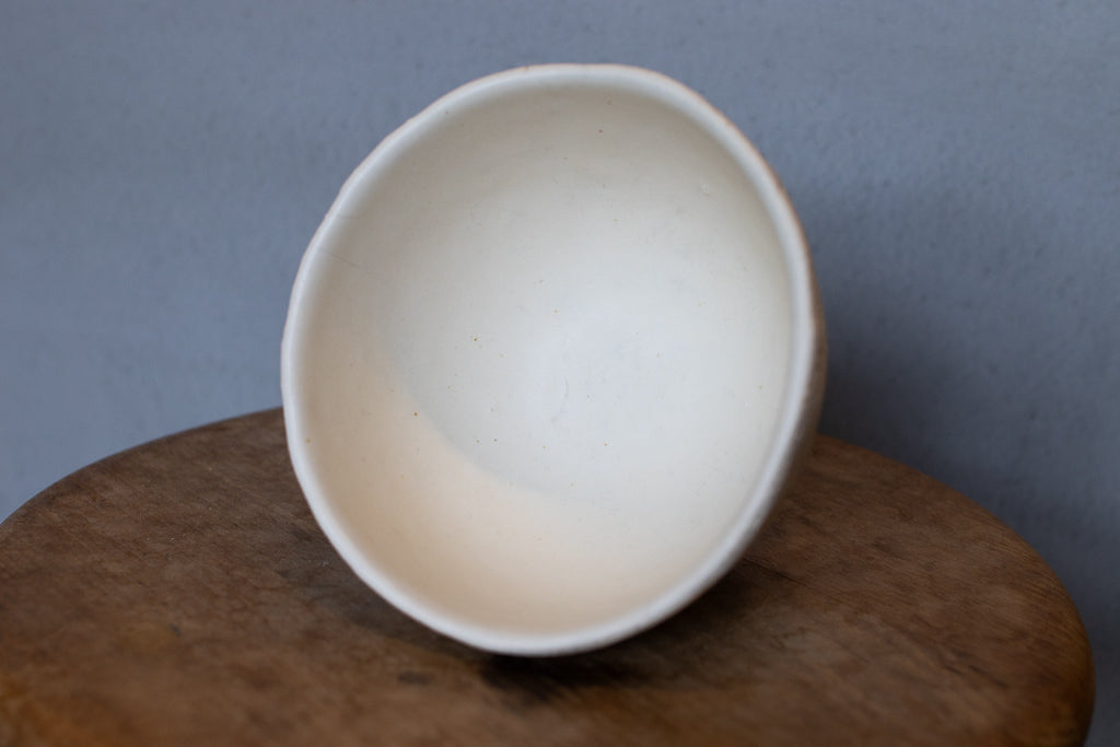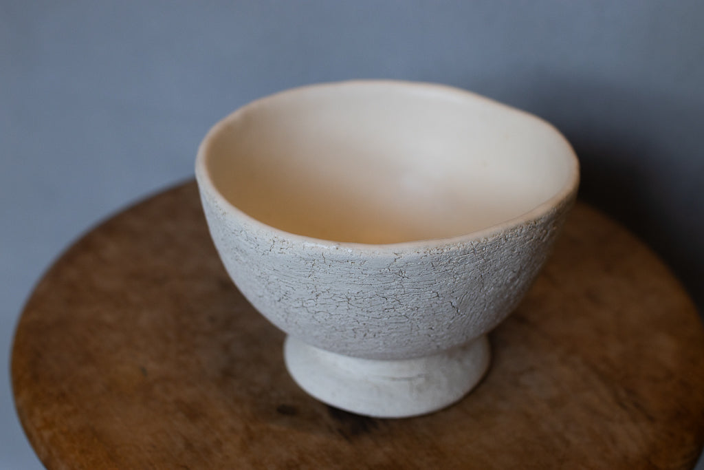 鏡原さん定番のカップにくびれた高台を付けていただいた、「カフェオレボウル」。歪なシルエットと独特な質感、さらにカップ全体を掲げ持ち上げるような高台が加わることで出自不明のオブジェか祭器のような雰囲気が漂い最高に格好いいです。